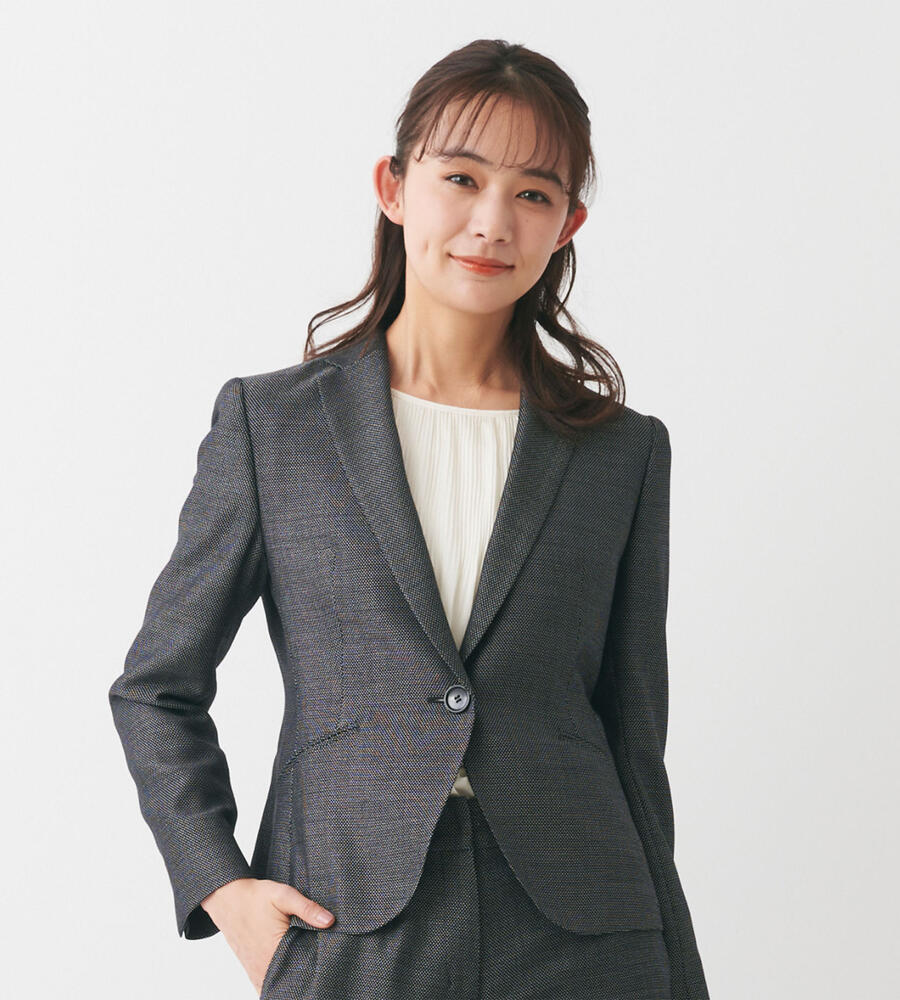 シンプルな一つボタンのテーラードジャケット。いつもの着こなしにプラスしてシックなスタイリングが決まる一枚。少しAラインのシルエットがフェミニンなポイント。首元のVラインが細めなのが今年らしくスタイリッシュなデザインポイント。オフィスシーンからお出かけまで幅広く活躍するアイテムです。