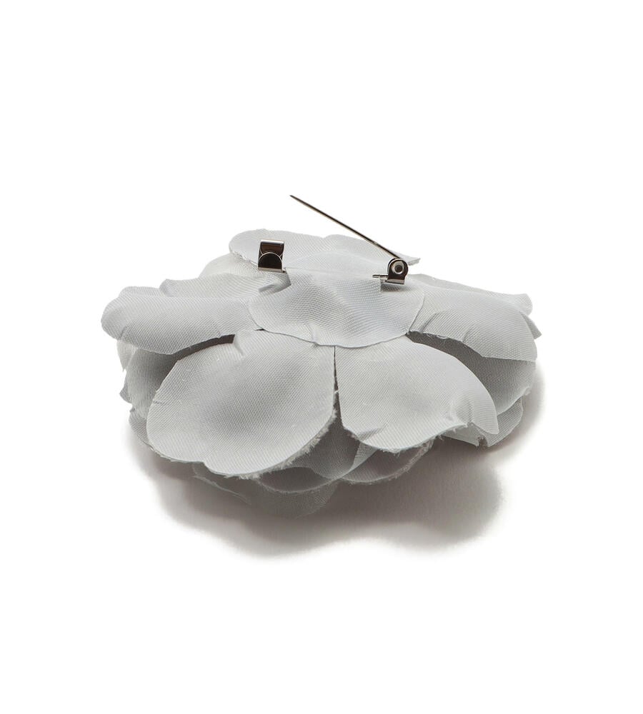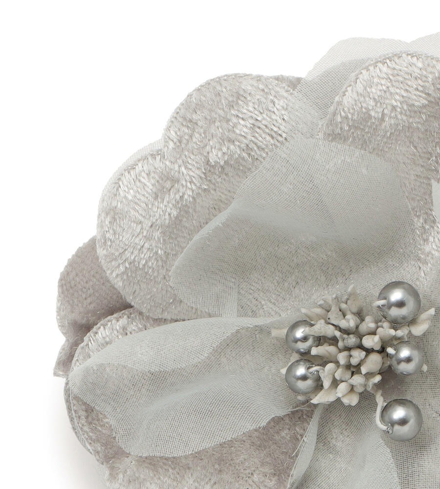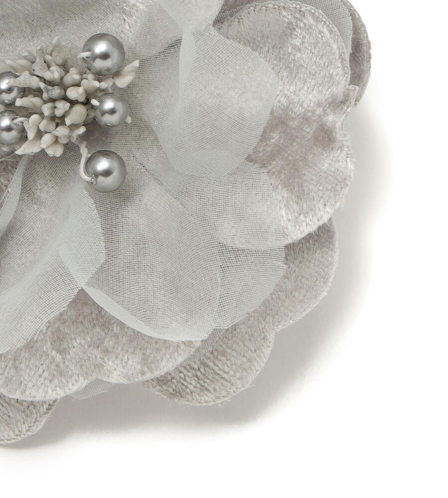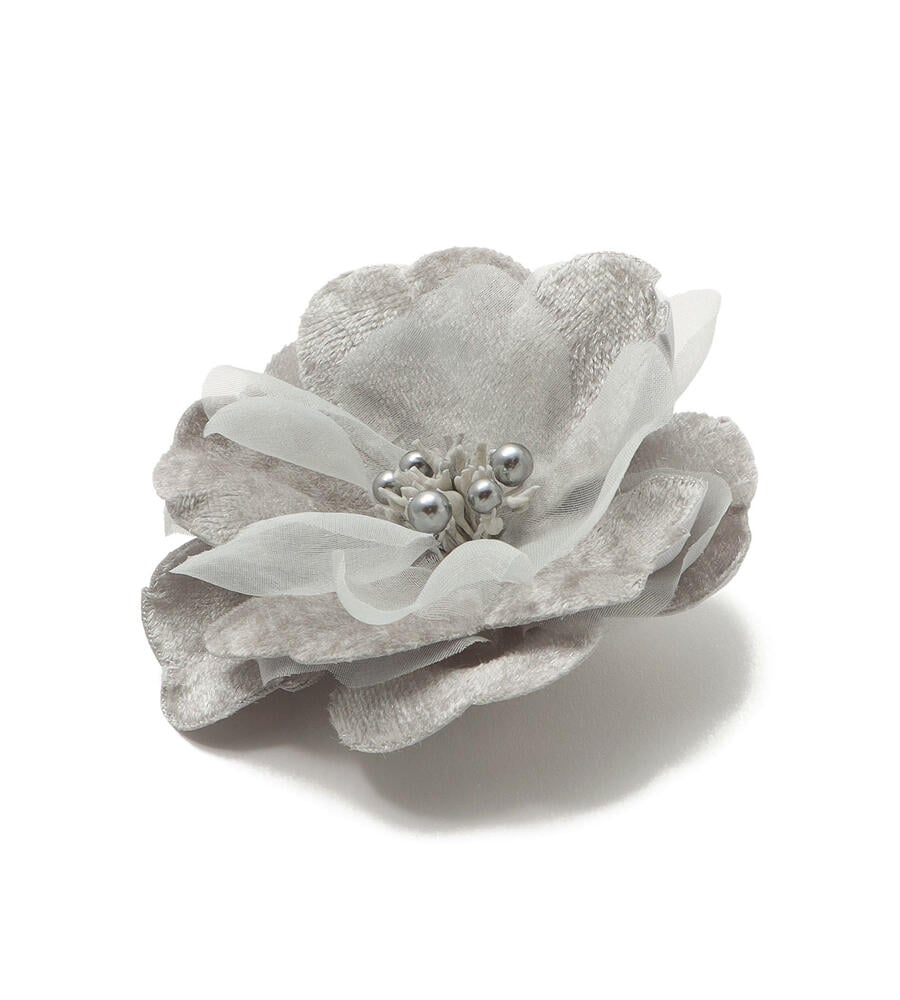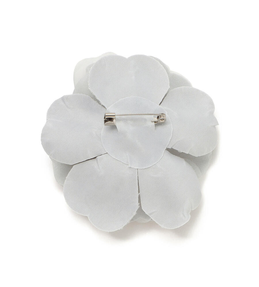 フラワーモチーフがエレガントなミニコサージュ。異なる素材をミックスし表現した花びらが魅力。センターにはビーズ、透け感のある生地を重ねた立体感のあるフォルムが魅力。安全ピンでサッと簡単に装着できます。いつもの着こなしにプラスして、パーティやお祝いの席などにも映え、シックに決まるアイテムです。