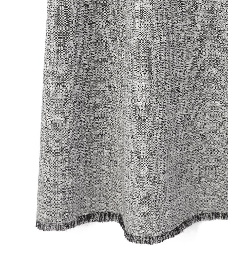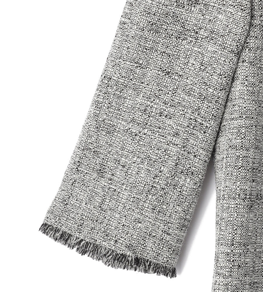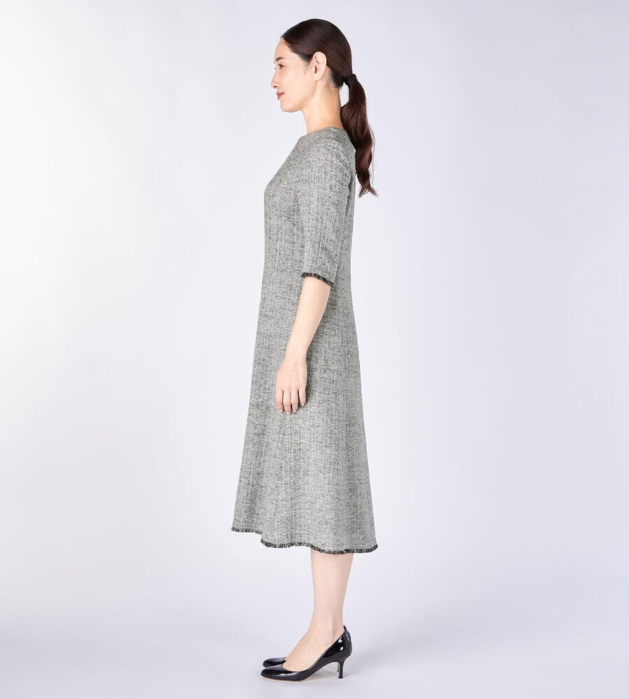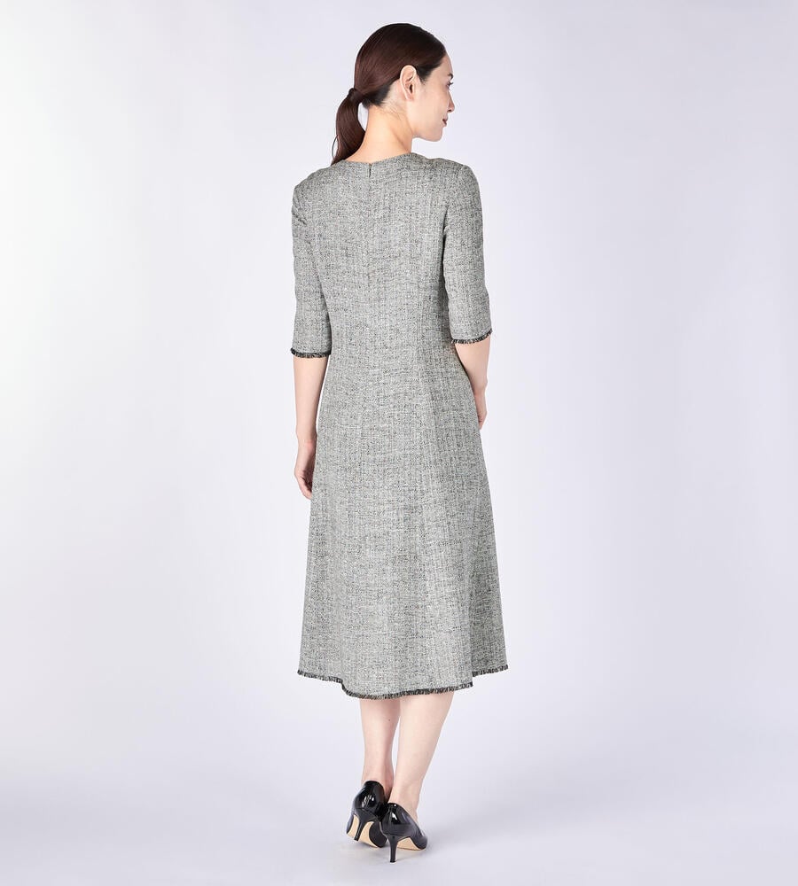 袖口と裾にほどこしたショートフリンジがアクセントになったスプリングツィードワンピース。裾に向かって広がるフィット&フレアシルエットが美しく、しなやかでエレガントなスタイルが完成。同素材のノーカラージャケットを合わせたセットアップコーディネートも素敵です。