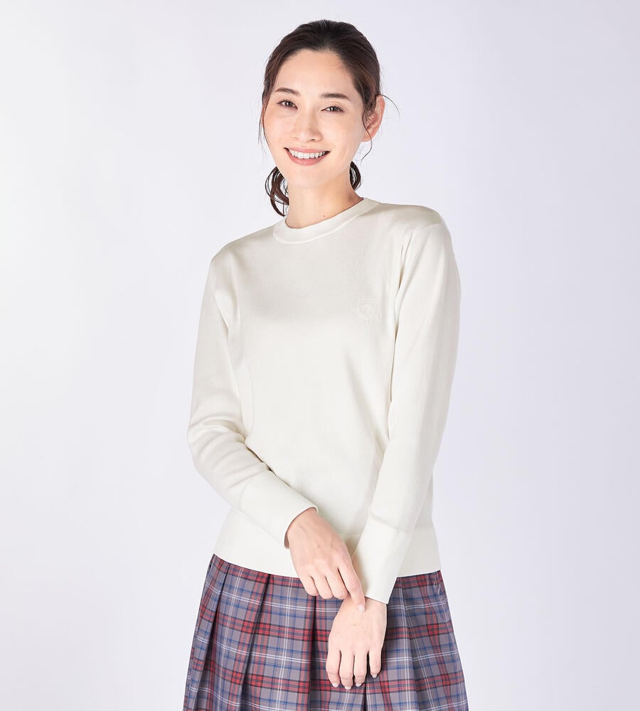 トリムクルーネック長袖ニット。左胸にあしらわれたブランドロゴエンブレムの刺繍がさりげなくおしゃれなデザインアクセント。長めに取った袖口と裾のリブ編みがシルエットのアクセント。トレンドに左右されない、シンプルかつスタンダードなデザインで様々なボトムとマッチし、長く愛用できるアイテムです。