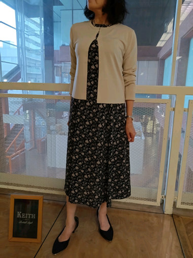 さらりとした風合いの素材を用いたワンピース。心が安らぐようなボタニカルプリントを用いて、ロマンティックな表情に仕上げています。身体を締め付けないリラックス感のあるシルエットでも、ドレープが縦のラインを強調してすっきりと着られるのが特徴。ジャケットなどを合わせれば、改まったシーンにも活躍します。アンダースカート付き。