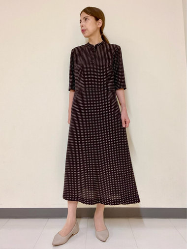 スクエア型のドットが規則正しく並ぶファブリックを用いたワンピース。バンドカラーを採用したプルオーバータイプのデザインが、きちんとした印象を与えます。ウエストから下を切り替え、フレアがたっぷりとなびく優美なシルエット。1枚使いでエレガントな装いが完成します。大振りのネックレスなどを合わせてポップに楽しむのもおすすめです。
