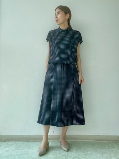 スクエア型のドットが規則正しく並ぶファブリックを用いたスカート。膝が隠れる長さと優雅に揺れるドレープで、着こなしをエレガントに映し出します。ウエストまわりはすっきりとしており、バランスの取れたスタイリングを演出。同素材のブラウスを合わせたセットアップスタイルもおすすめです。