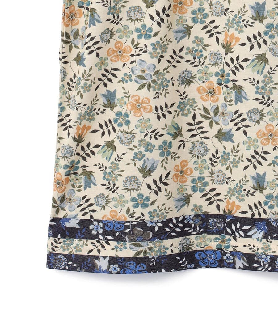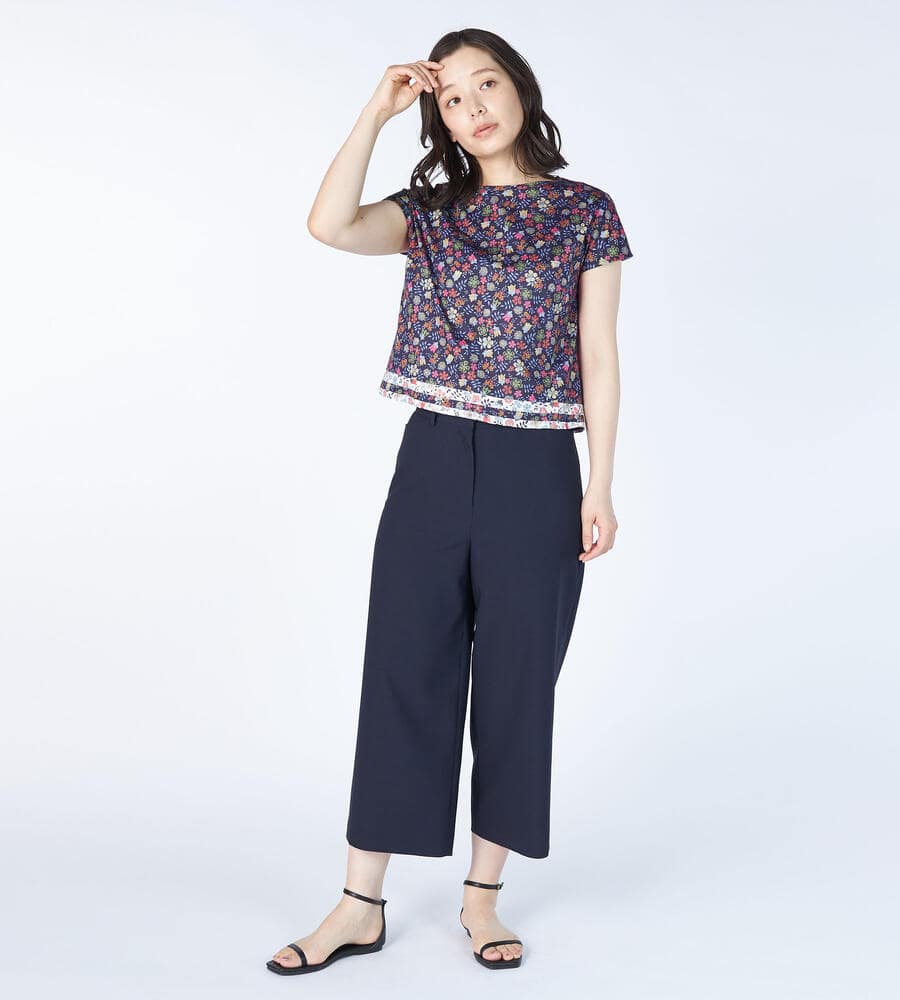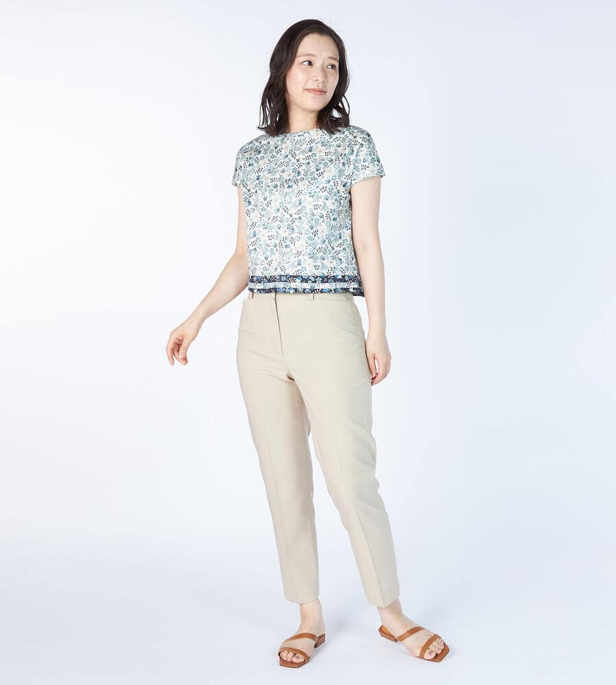 心が華やぐようなフラワープリントを用いたカットソー。裾に別色の花柄ラインを添えることで、メリハリのあるデザインに仕上げています。ジャストなサイジングと短めの着丈で、着こなしのバランスをキープ。裾を絞っていないため、腰まわりがすっきり見えるのも特徴です。パンツに合わせても女性らしいスタイリングが決まる1点です。