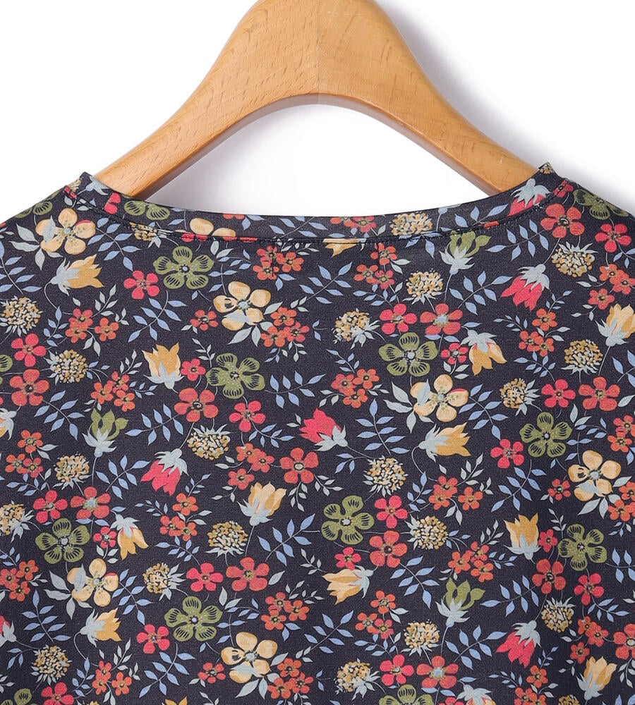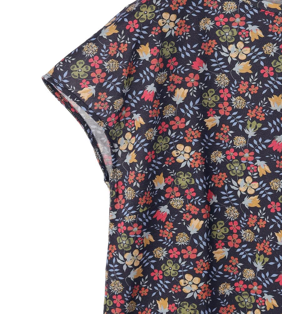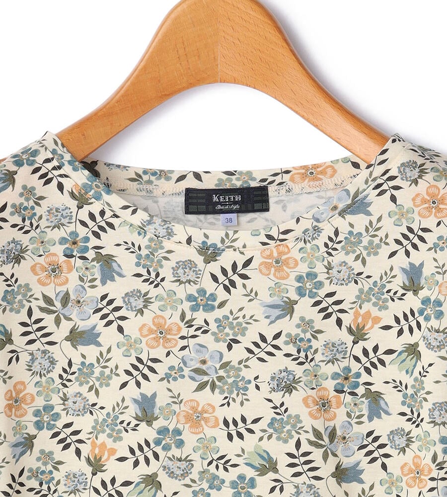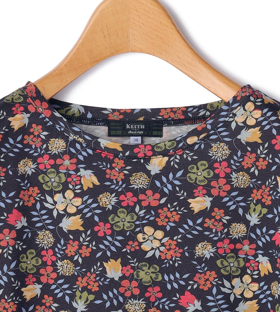 心が華やぐようなフラワープリントを用いたカットソー。裾に別色の花柄ラインを添えることで、メリハリのあるデザインに仕上げています。ジャストなサイジングと短めの着丈で、着こなしのバランスをキープ。裾を絞っていないため、腰まわりがすっきり見えるのも特徴です。パンツに合わせても女性らしいスタイリングが決まる1点です。