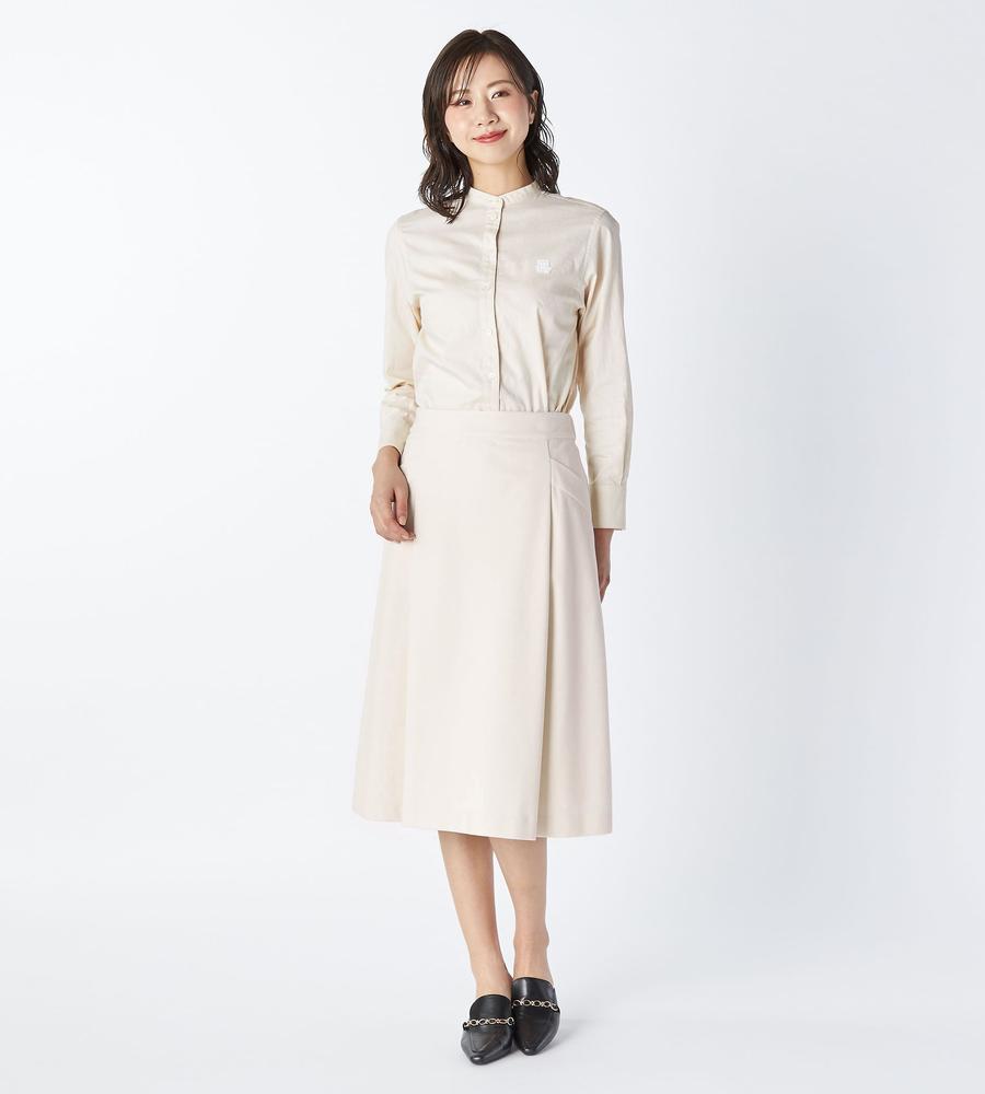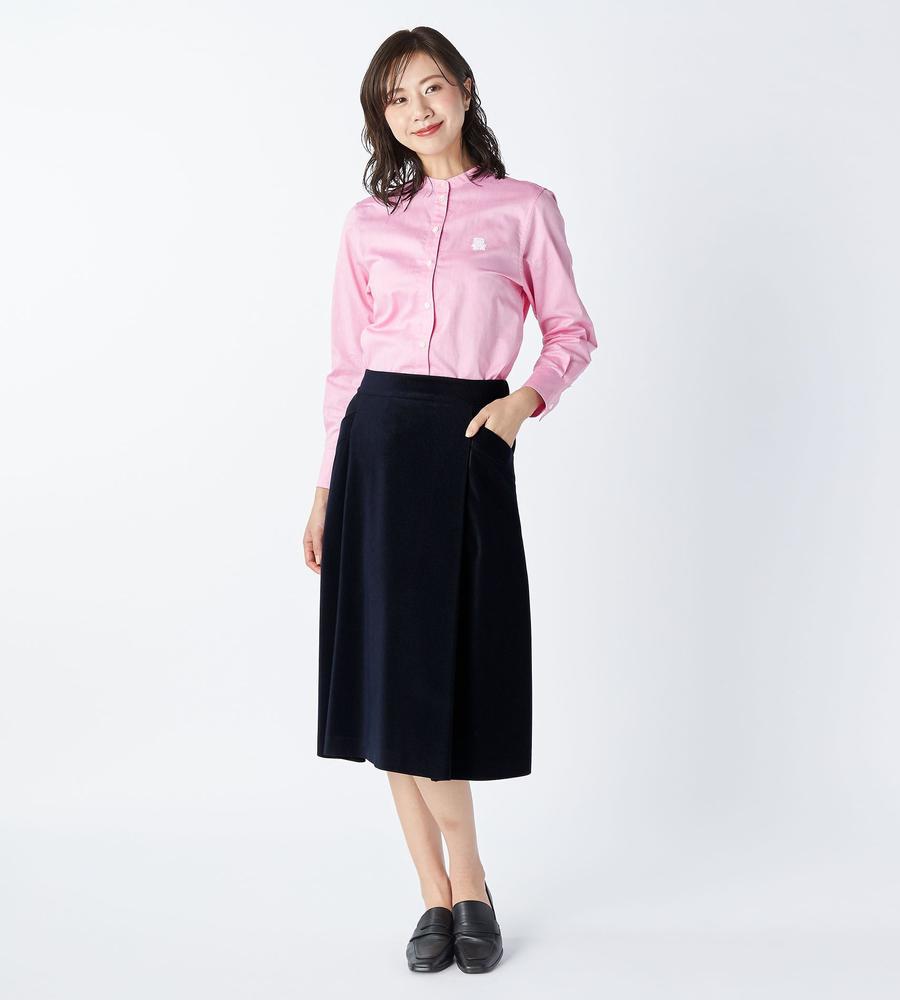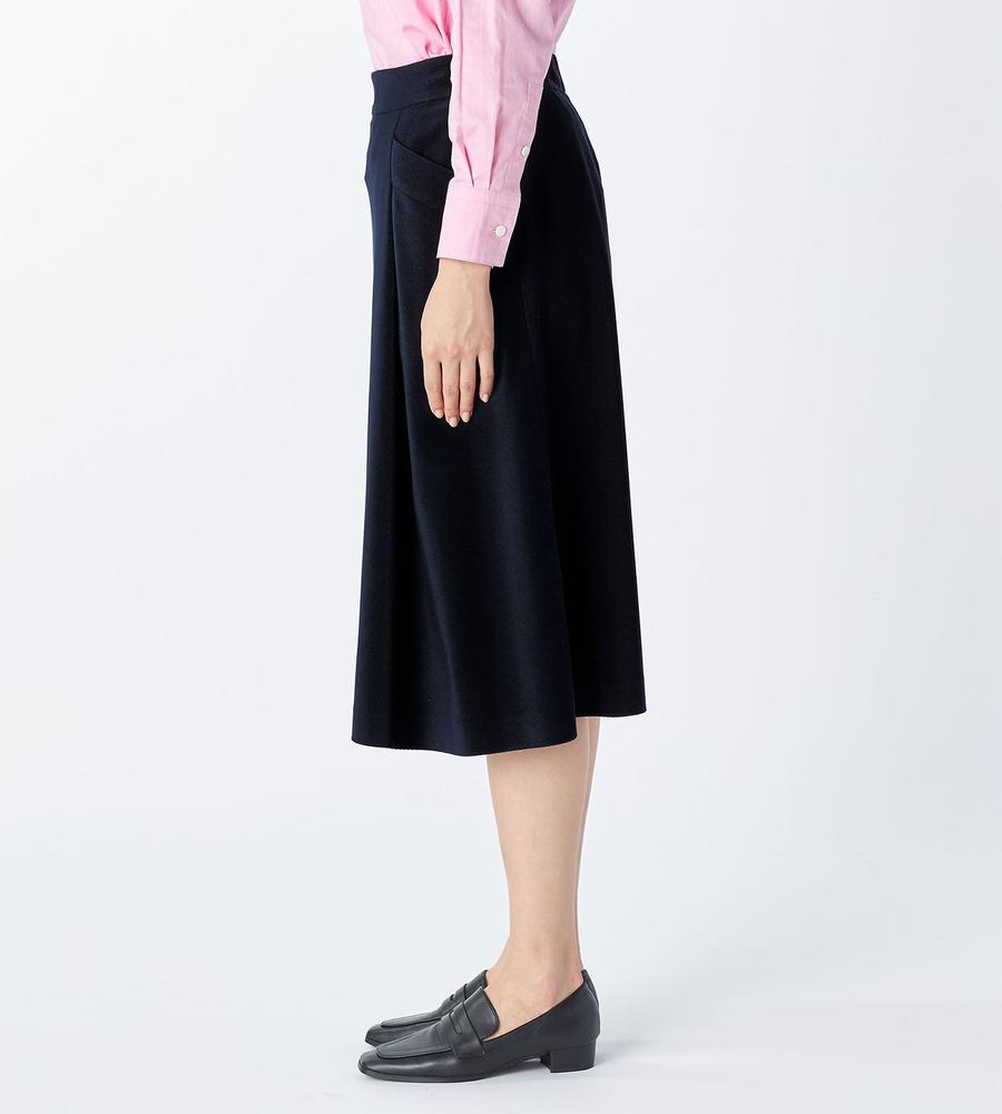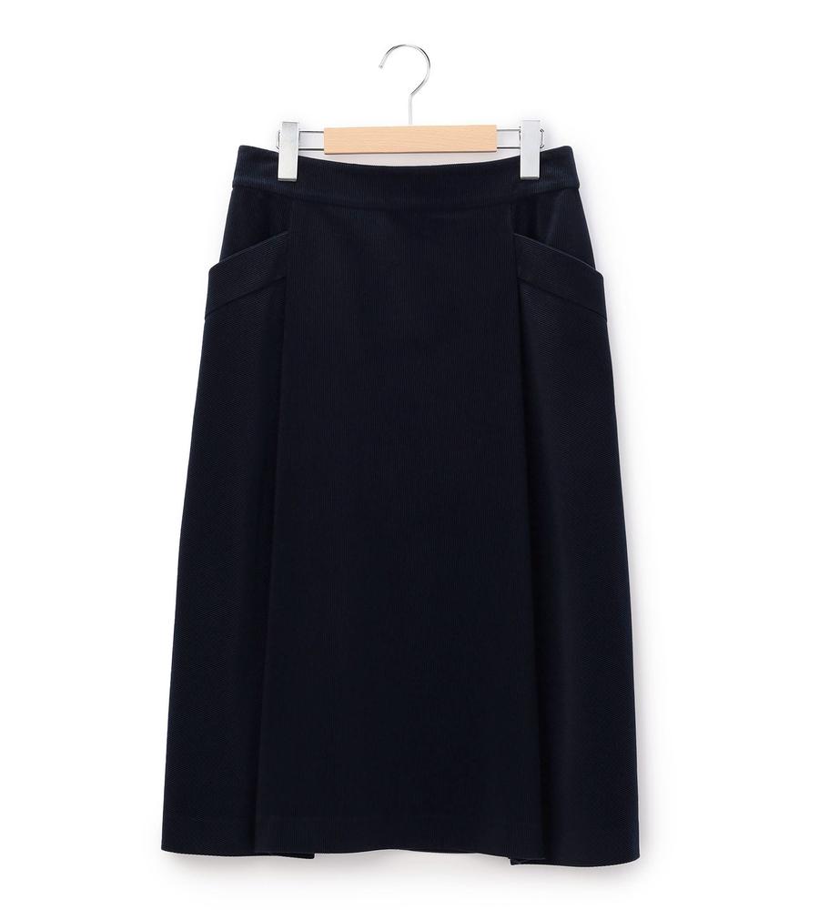 ソフトな風合いのコーデュロイ素材を用いたスカート。サイドにポケットを配し、そこにタックを加えることで、デザイン性に富んだ仕上がりになっています。広がりは控え目ながらもタックから展開するドレープで、優美なスタイリングを後押し。トップスのすそをインさせることで、バランスのよい着こなしが完成します。膝が隠れる程度のエレガントなシルエット。