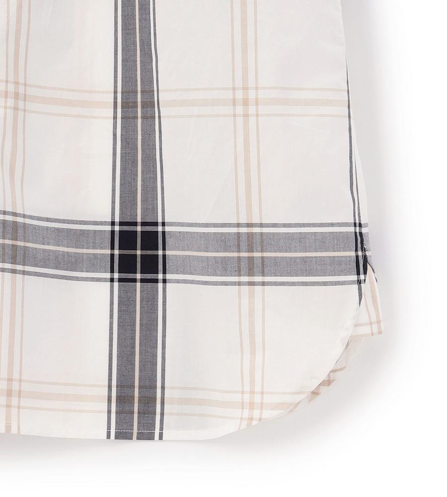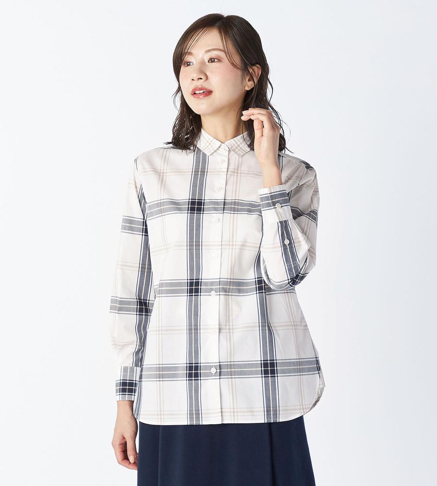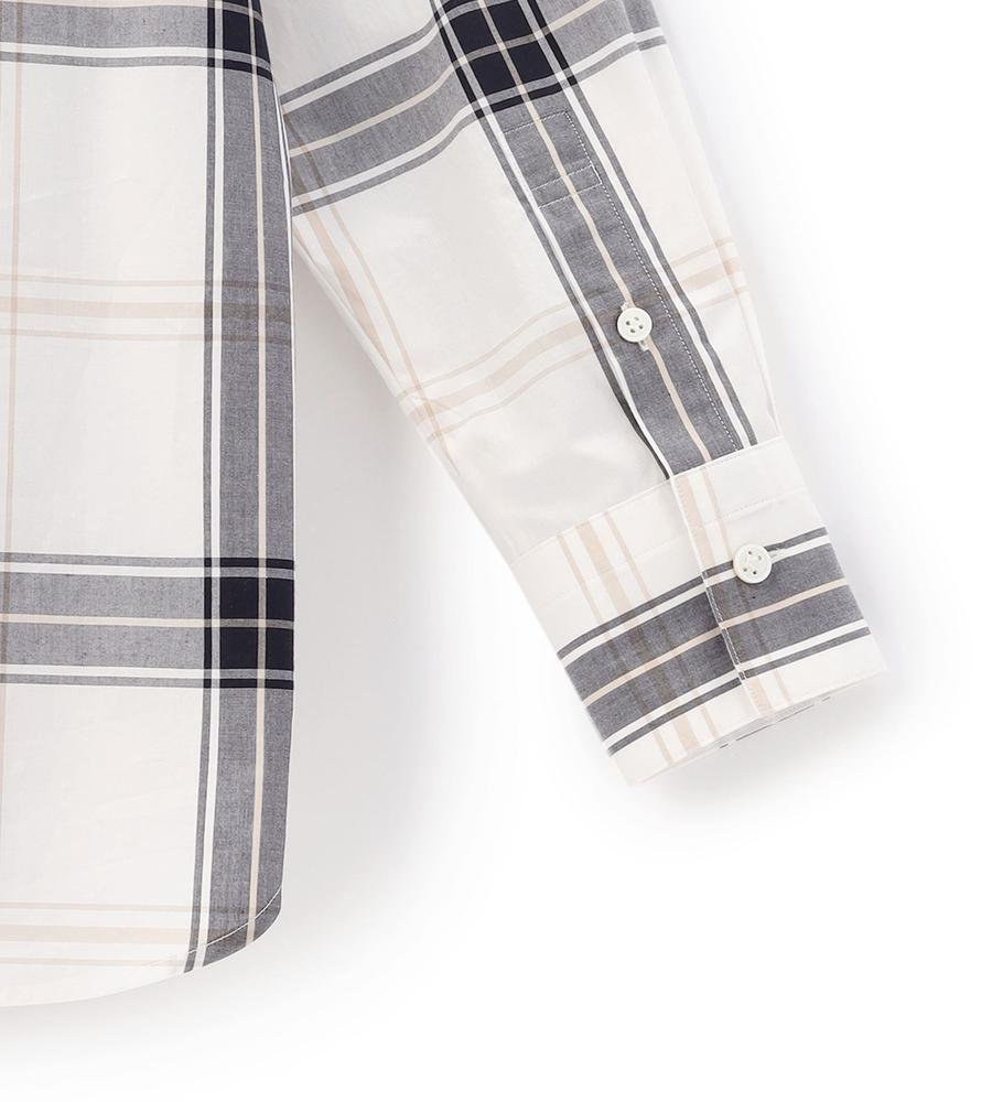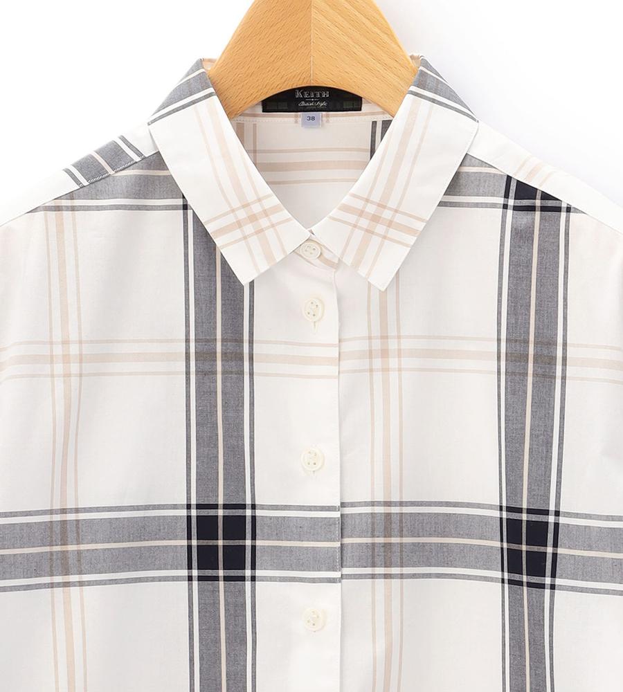 大柄のチェックで着る人の個性を引き立てるブラウス。柄の配置をあえてずらすことで、モードな遊び心を潜ませた1点です。さっぱりとしつつ、密度の高いコットン素材を用いており、クリーンな着こなしを後押し。裾をボトムスにインさせるアレンジや、ジャケットなどを羽織るスタイルにも活躍します。