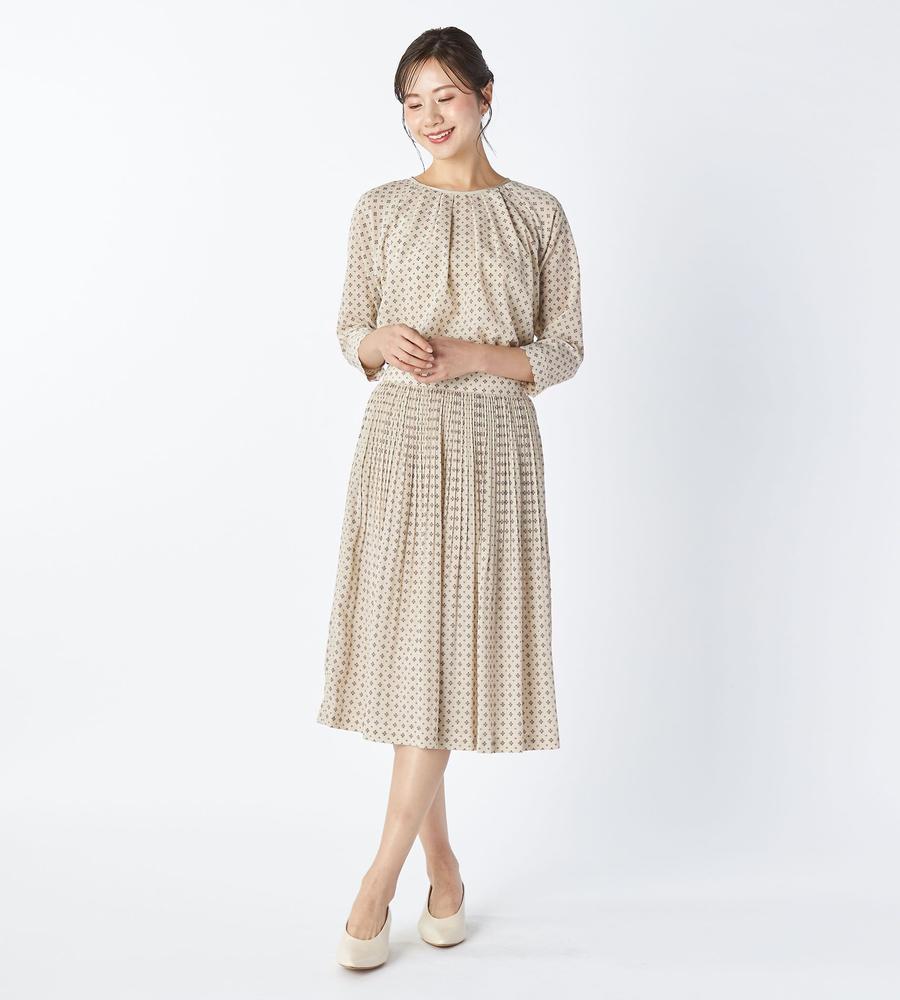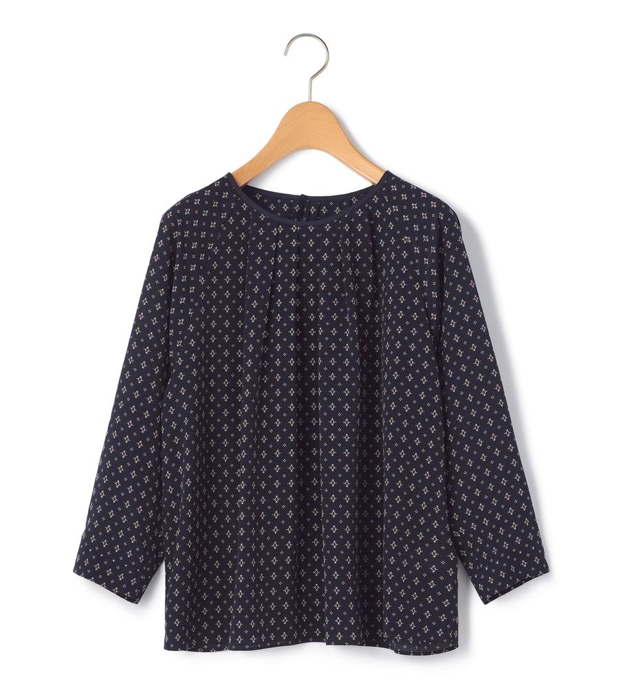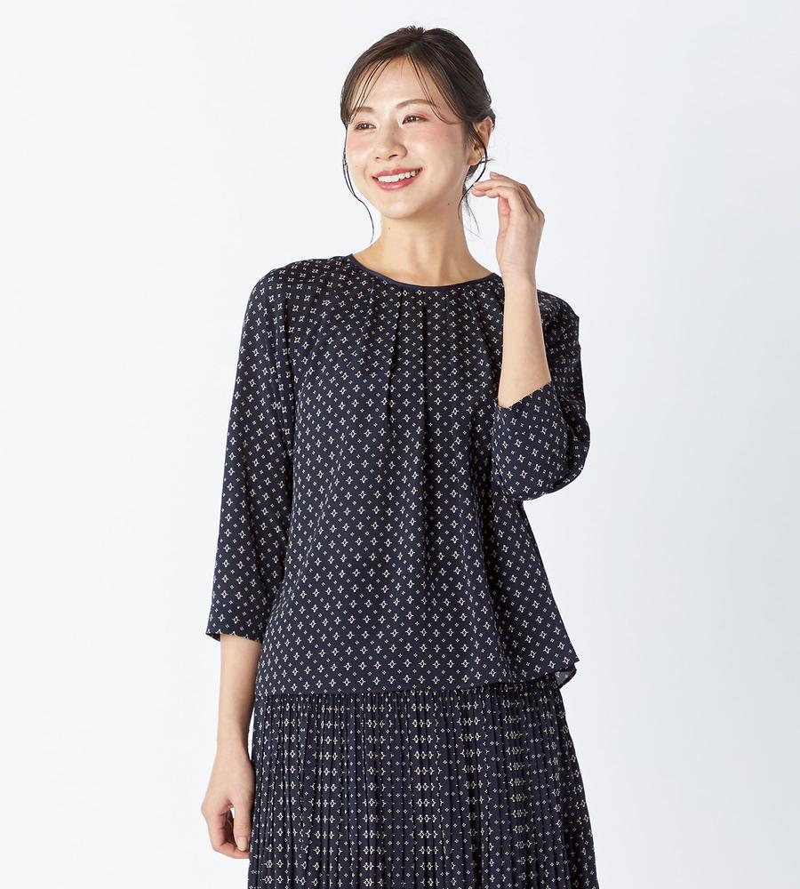 軽やかなポリエステル生地で仕立てたジオメトリック柄の7分袖ブラウス。さらっと着こなせるプルオーバータイプで、ほどよい開きのラウンドネックや柔らかなタックデザインが女性らしい印象です。合わせるボトム次第でカジュアルにもきれいめにも着用でき、同生地のスカートとセットアップでも楽しめます。
