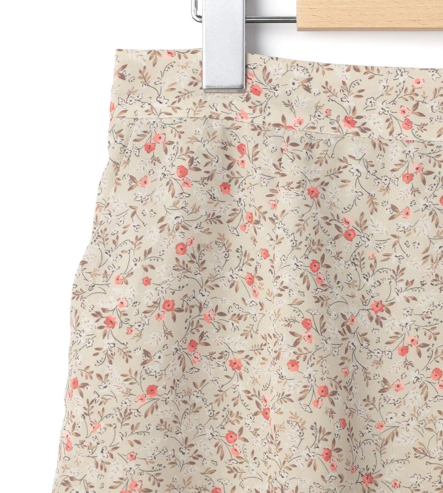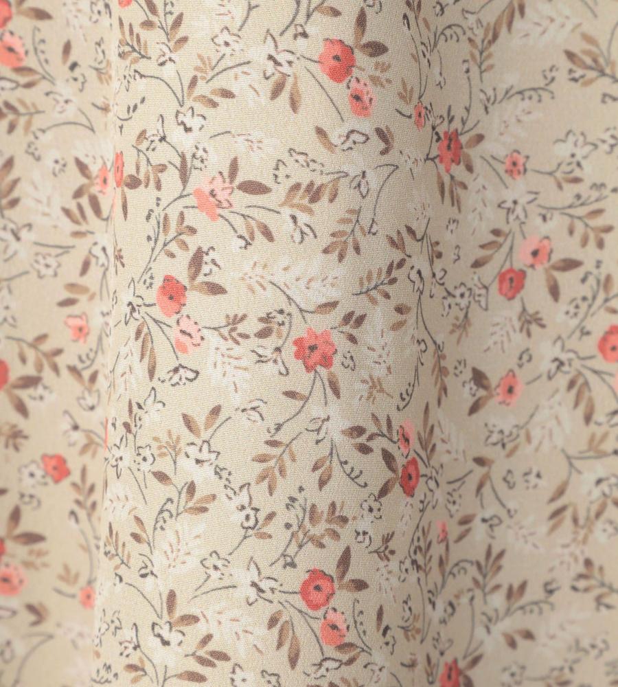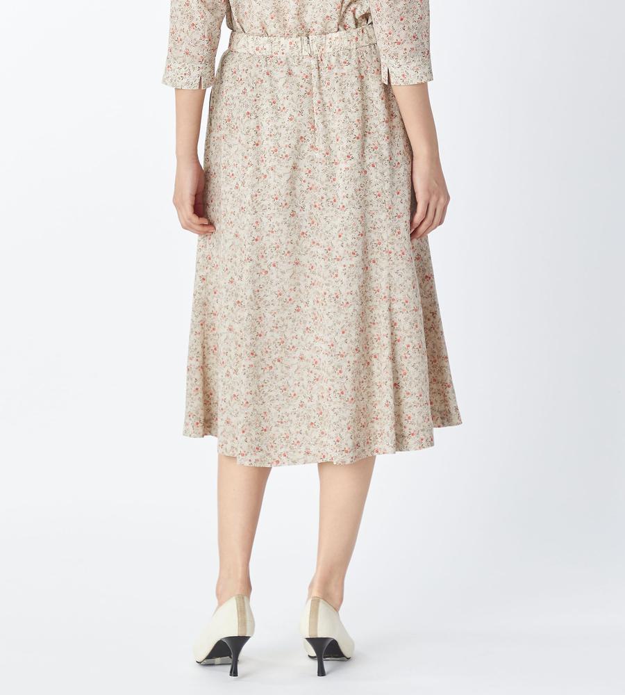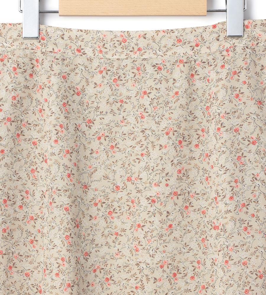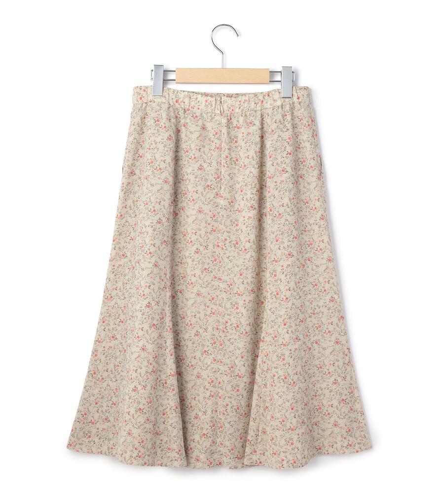 まるでイングリッシュガーデンのような、小花柄の総柄プリントで仕上げたスカートです。裾にかけてふわりと広がるフェミニンなシルエット、膝が隠れるくらいのミディ丈が上品な着こなしをかなえてくれます。ウエストの後ろはゴム切り替えですっきり快適。同柄のブラウスとセットアップでそろえるのもおすすめです。