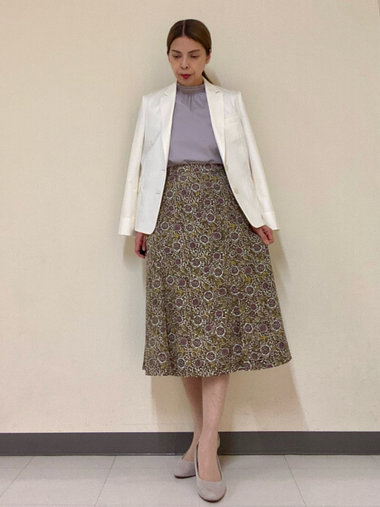 個性派な着こなしをかなえてくれる、フラワー&リーフモチーフのプリント柄スカートです。裾にかけてふわりと広がるフェミニンなシルエット、膝が隠れるくらいのミディ丈が上品な着こなしをかなえてくれます。ウエストの後ろはゴム切り替えですっきり快適。同柄のブラウスとセットアップでそろえるのもおすすめです。