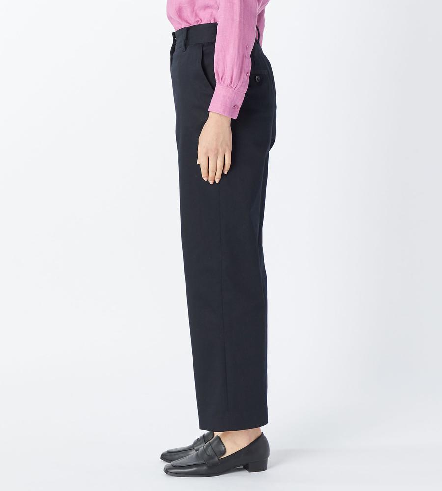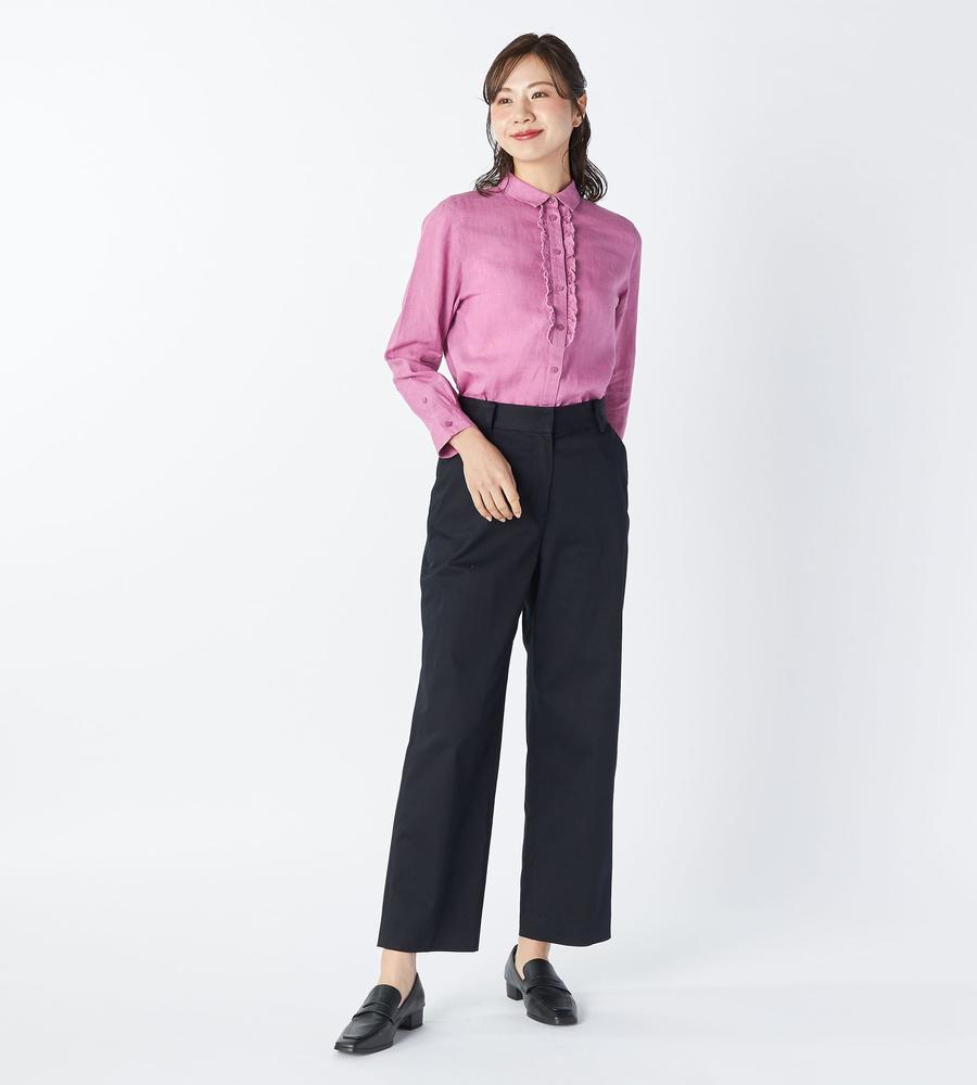 無地のツイル地で仕立てた、ベーシックなパンツ。ストレッチの効いた素材を採用しているため、動きやすく1日穿いていても疲れにくいのがポイントです。足元にさりげなく抜け感を出せる9分丈もポイント。様々なトップスとコーディネートしやすく、デイリーに活躍するベースカラーがラインナップしています。