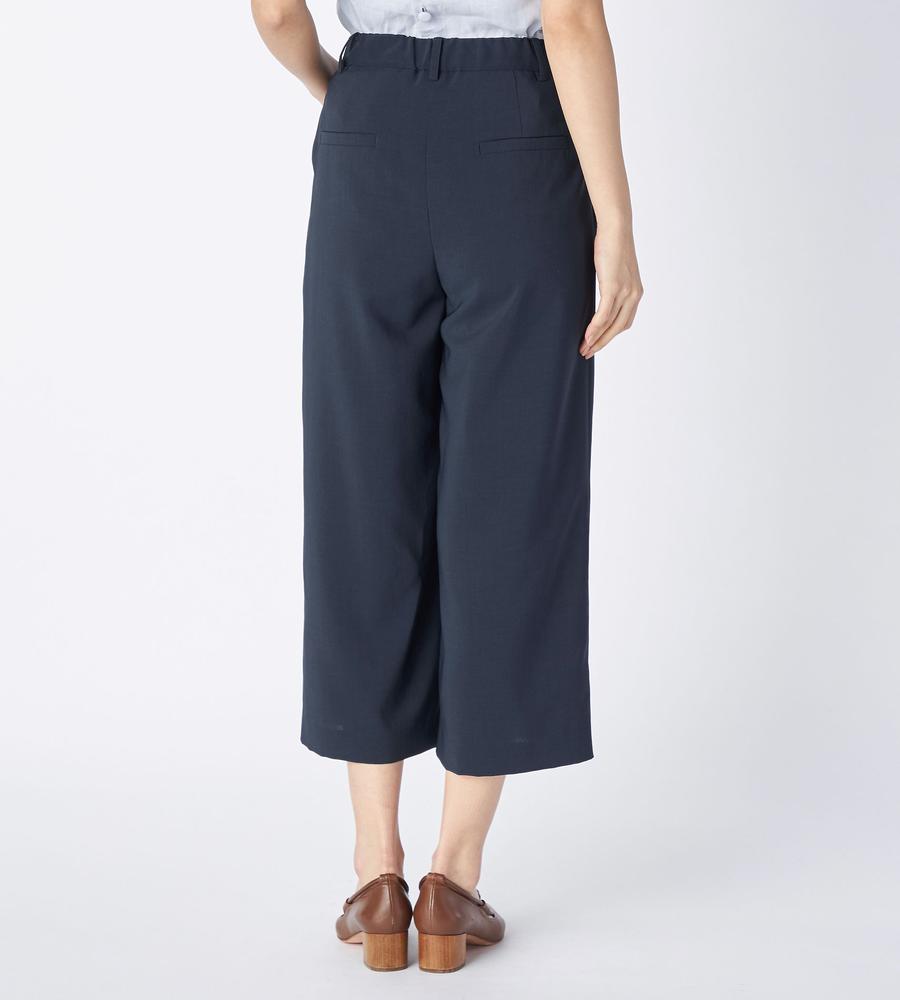 広がりがありながらも軽やかな素材使いで、春夏の装いをエレガントに映し出すワイドパンツ。カジュアルに見えない質感の素材で、大人の抜け感を演出します。ウエストの背面はゴム仕立てになっており、リラックス感とともに着こなせるのもポイント。着丈が短めなジャケットなどを合わせると、バランスのとれた綺麗めコーデが完成します。
