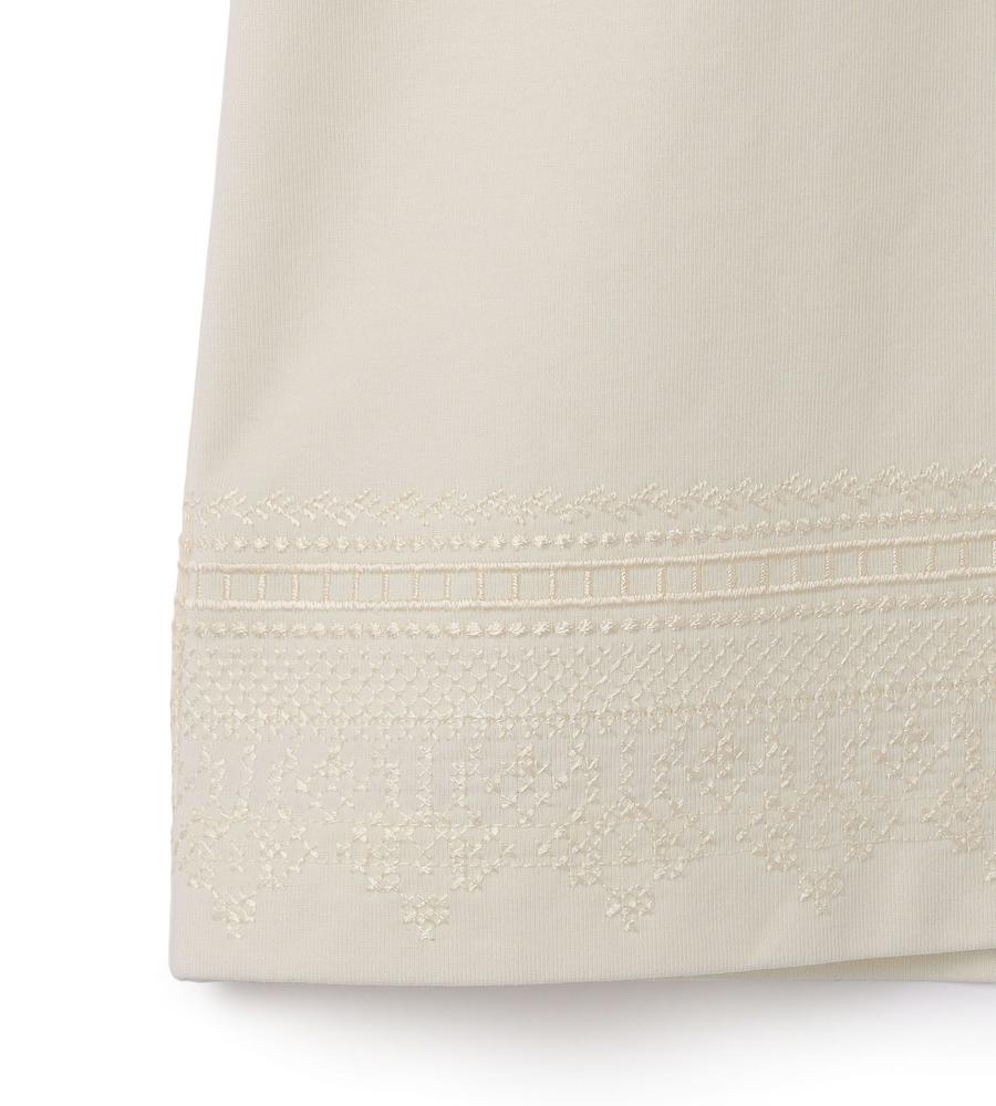 コットンをベースにした、軽やかなカットソー素材を用いたプルオーバー。意匠を凝らしたステッチやカットレースのような装飾で、1枚でも華やかな装いを楽しめます。ゆったりとしたシルエットでも着丈がコンパクトなため、バランスの良いコーデを楽しめるのが特徴。ジャケットなどのインナーとしても活躍するアイテムです。