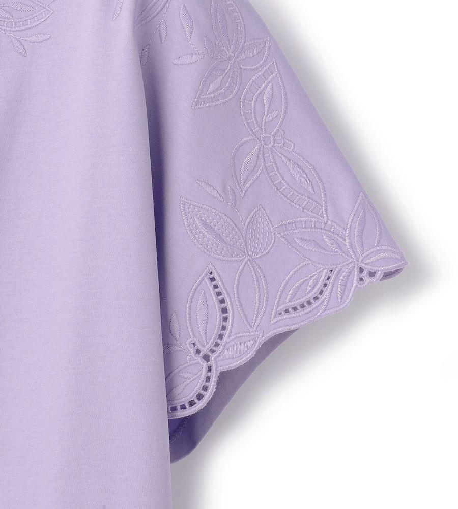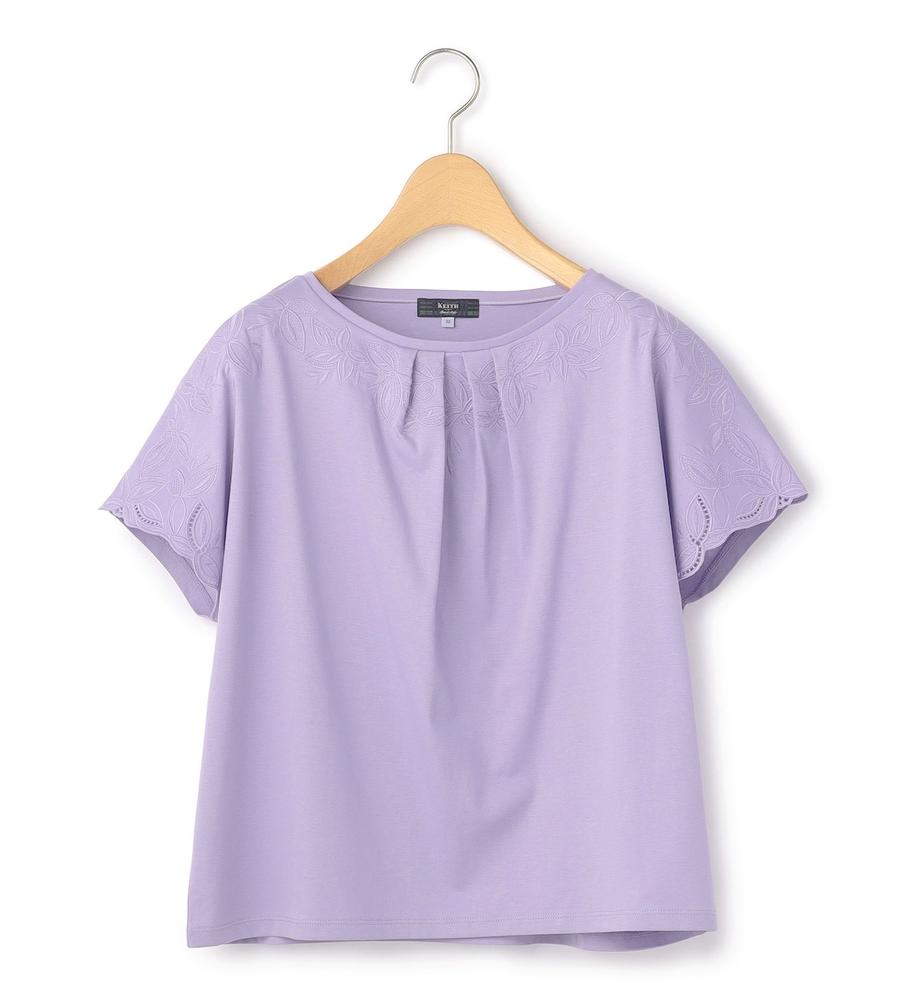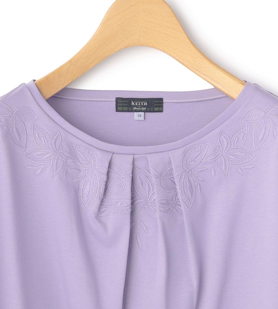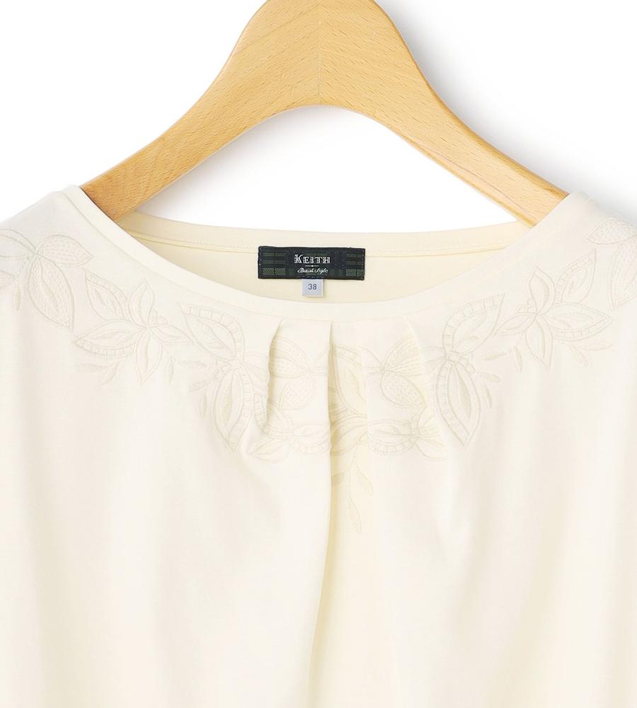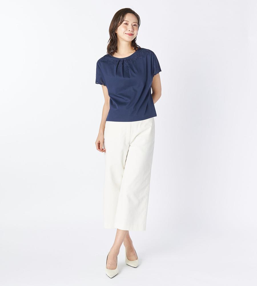 なめらかで優しい肌ざわりが心地よい、コットンスムース素材で仕上げたTシャツです。フロント側の衿まわりから袖にかけて刺繍をあしらい、シンプルになりがちなアイテムに華やかさをプラスします。シルエットに立体感を作るタックプリーツもポイント、脱カジュアルに着られる大人のためのTシャツです。