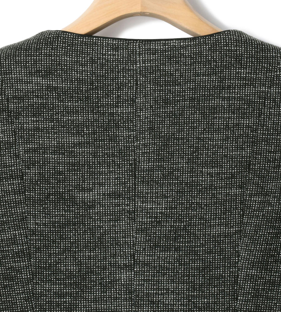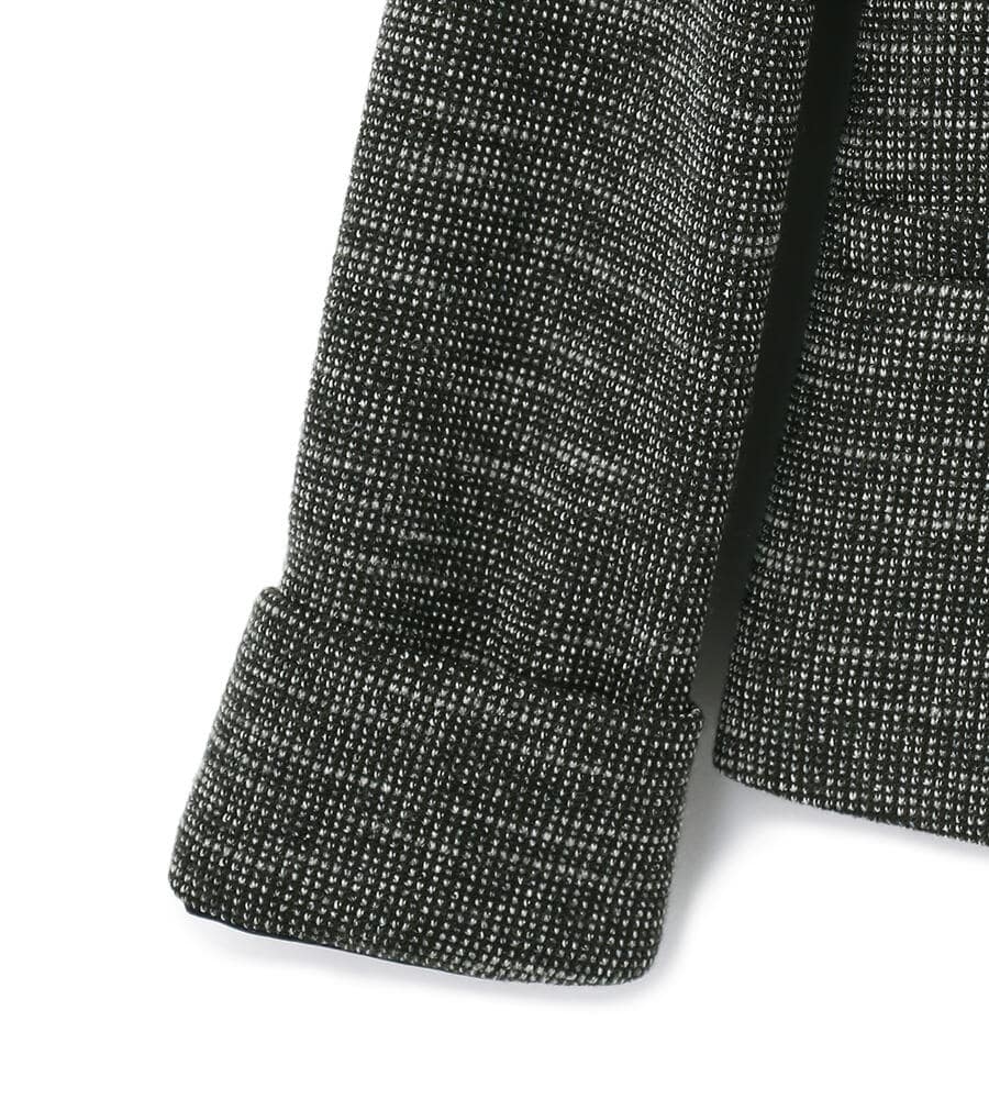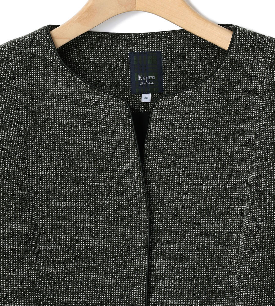 品の良い光沢がエレガントなムードを添えるファンシーツィード素材で仕立てたノーカラージャケット。前開きはボタンが見えない仕様ですっきりとした印象。首もとのVラインがさりげなく抜け感をプラス。コンパクトなシルエットがコーディネートに合わせやすく、さらりと羽織るだけでサマになるアイテム。