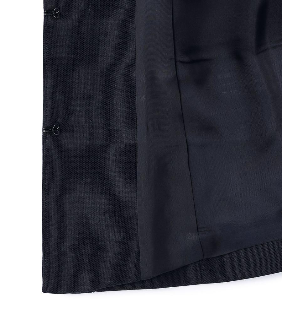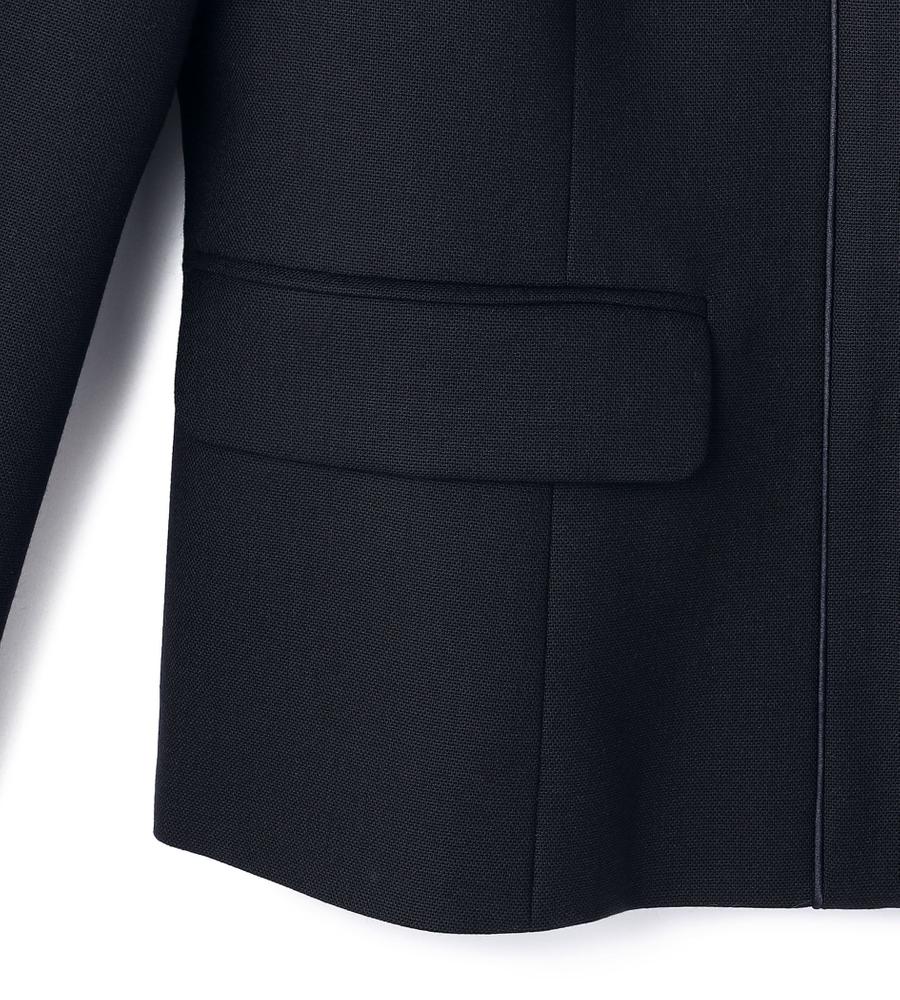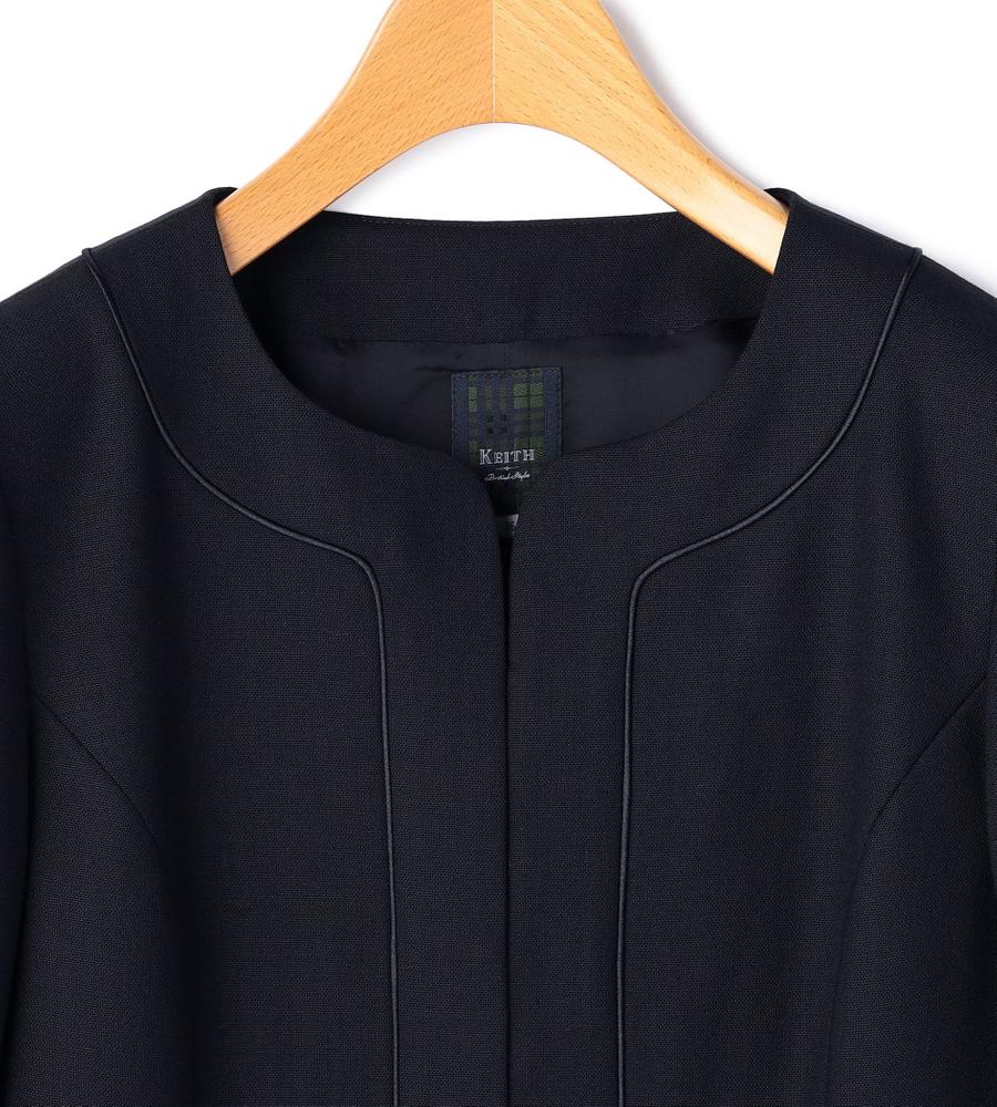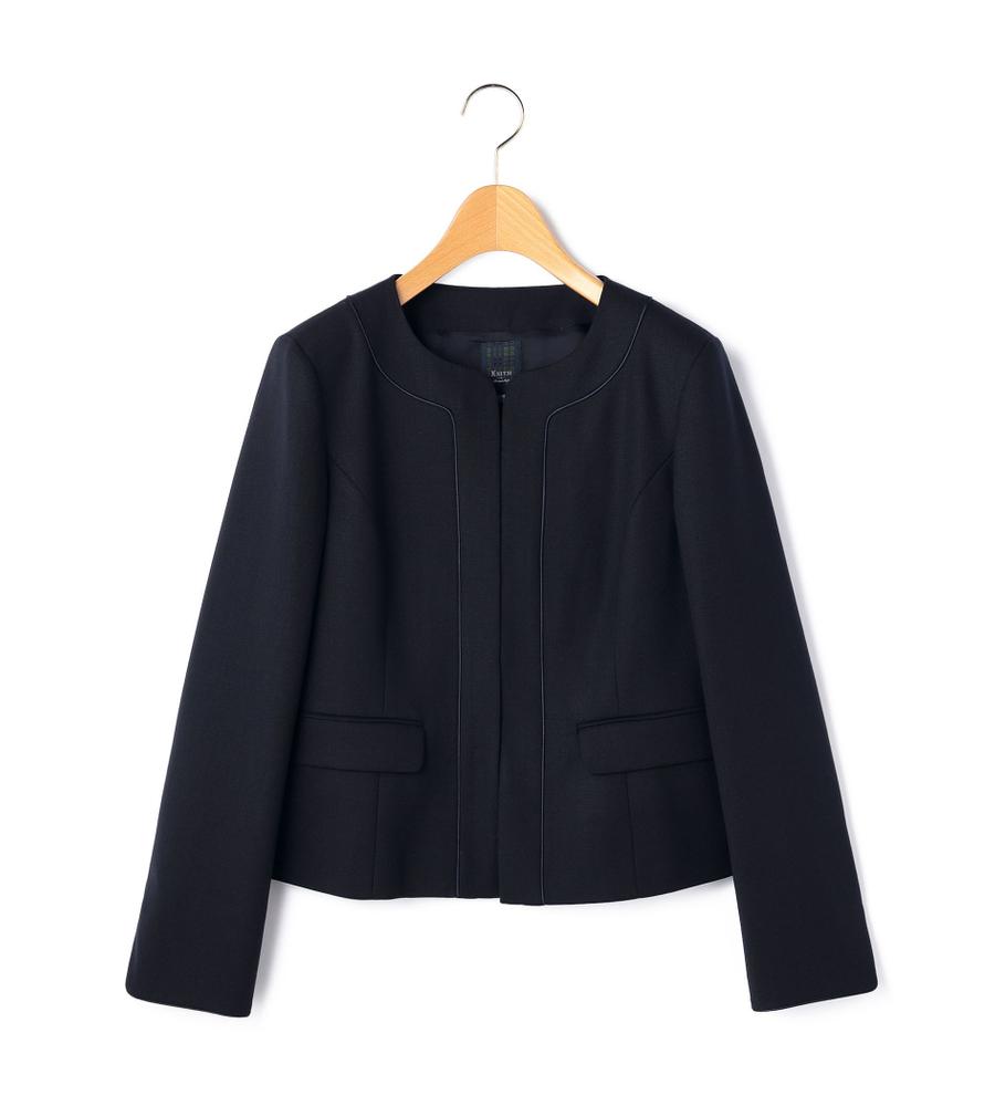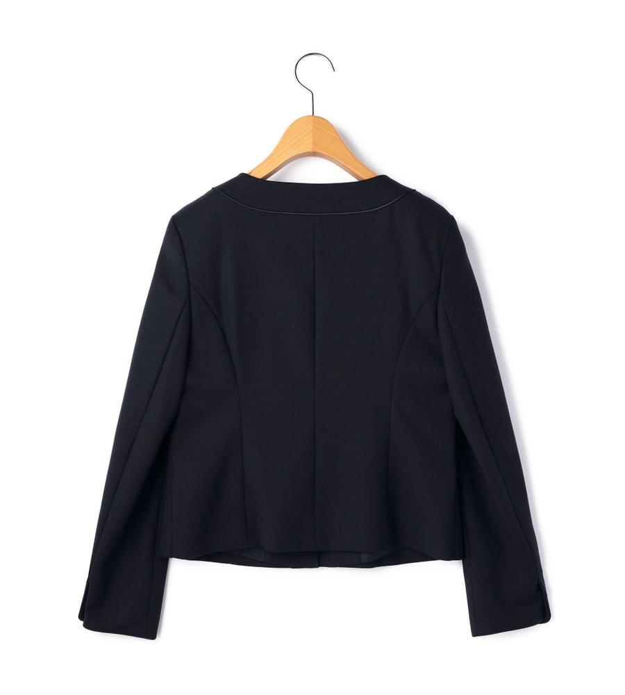 さらりとした質感の毛100%素材を用いたノーカラージャケット。洗練されたエレガントなデザインで、首元から前立てにかけてはラインを配しています。ウエストを絞った女性らしいシルエットに、折り返しが可能なスリット仕様の袖口もポイント。合わせるボトムを選ばず着用でき、様々なシーンに最適な一着です。