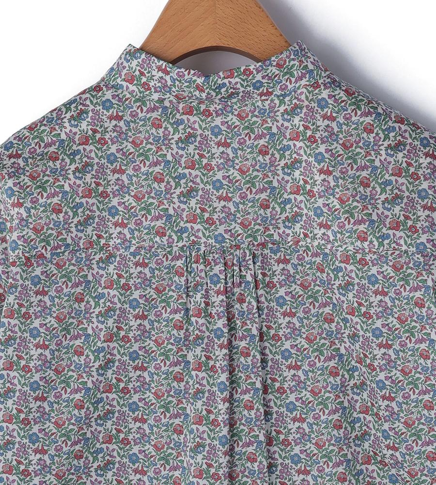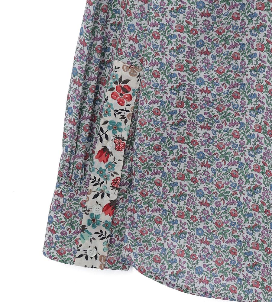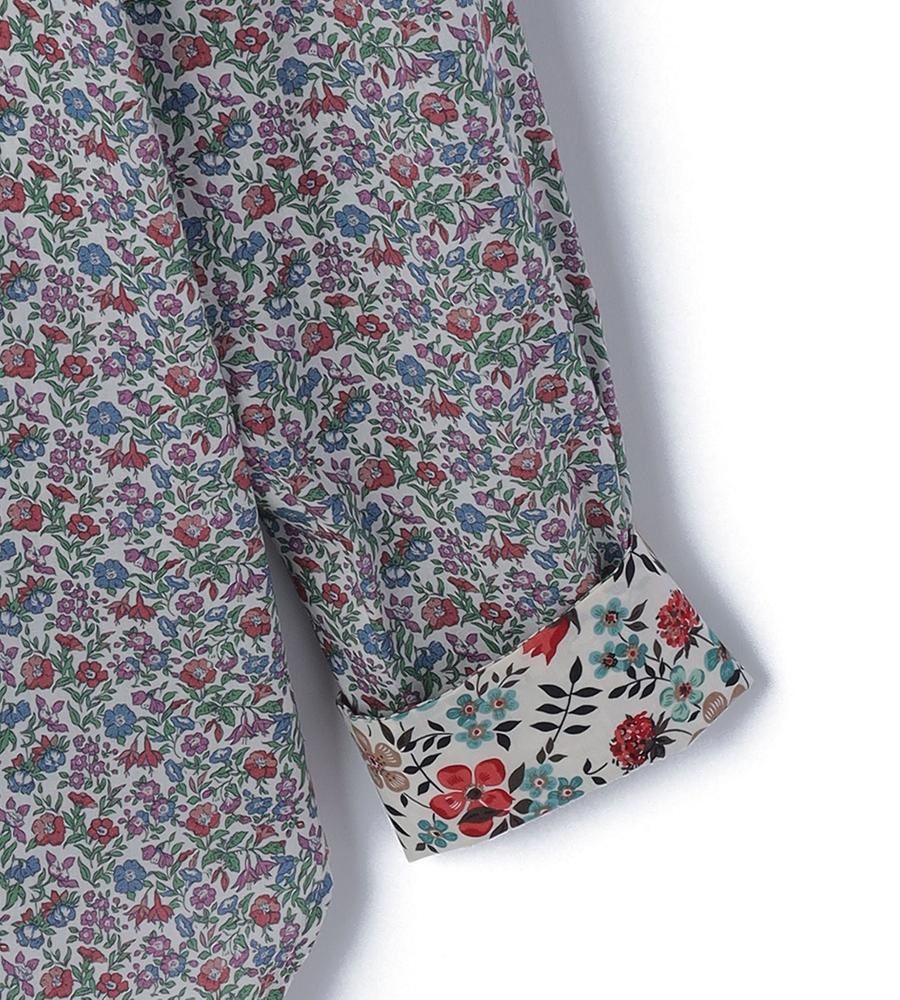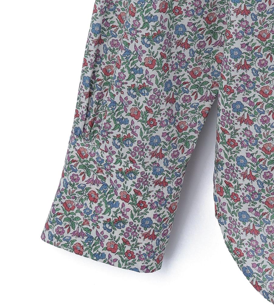 リバティプリント柄が華やかなデザインの長袖ブラウス。細かなフラワープリントが目を惹く一枚。カフス裏地と剣ボロ部分には異なるデザイン柄生地をあしらい、袖先を折り返すとより華やかなスタイリングに。お手持ちのボトムに合わせるだけで、スタイリッシュなお出かけコーディネートが完成するアイテムです。