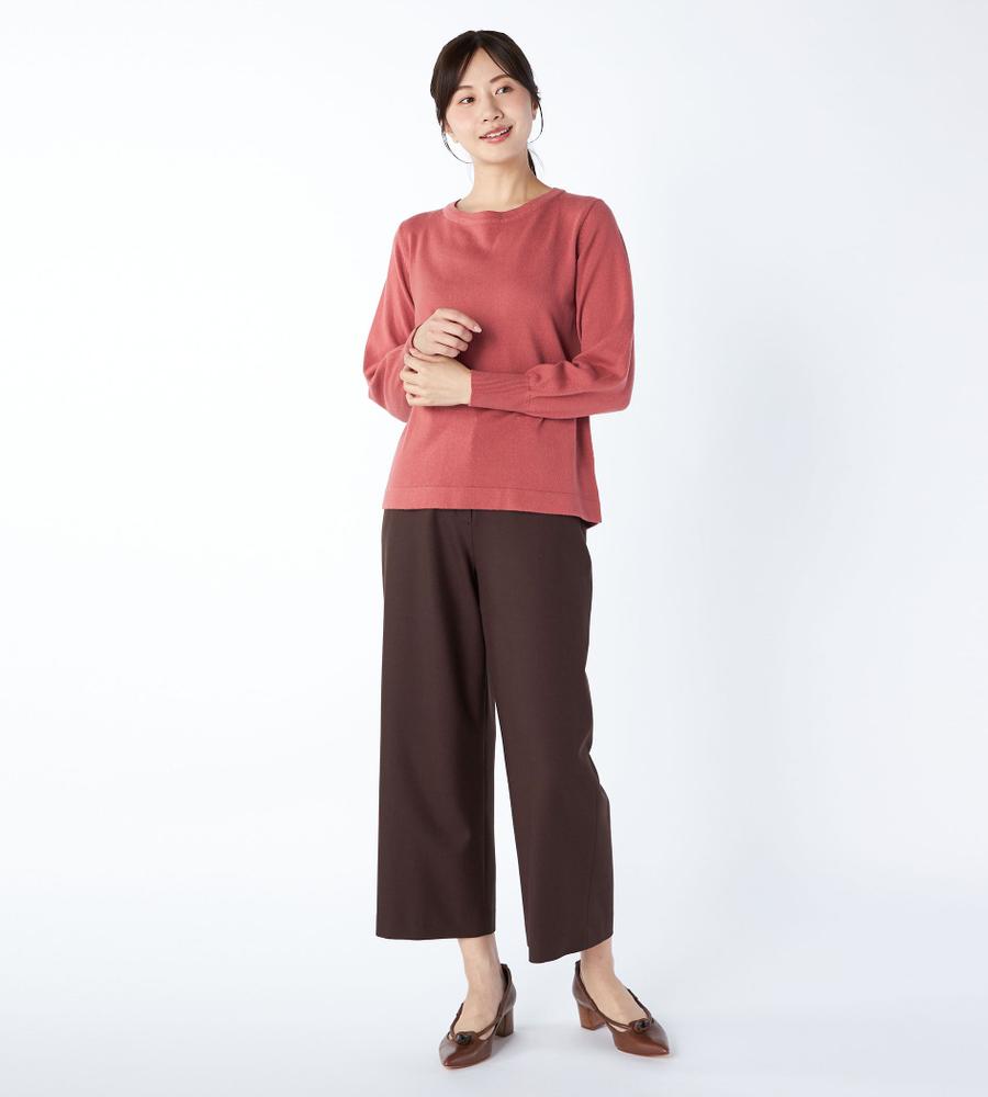 秋冬の着こなしのベースになるウールのニット。鎖骨ののぞくボートネックで、カジュアルコーデも女性らしくきまります。生地がモコモコし過ぎず、アウターを重ねてもスマートさを保つのもうれしい。