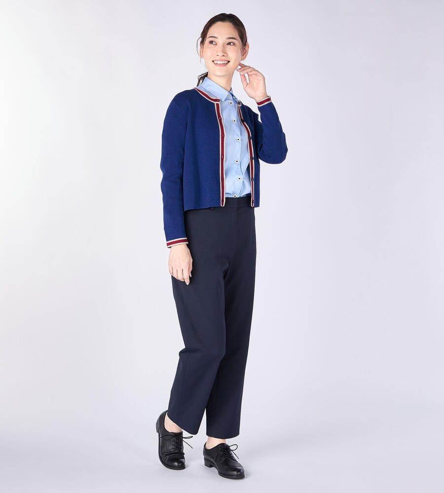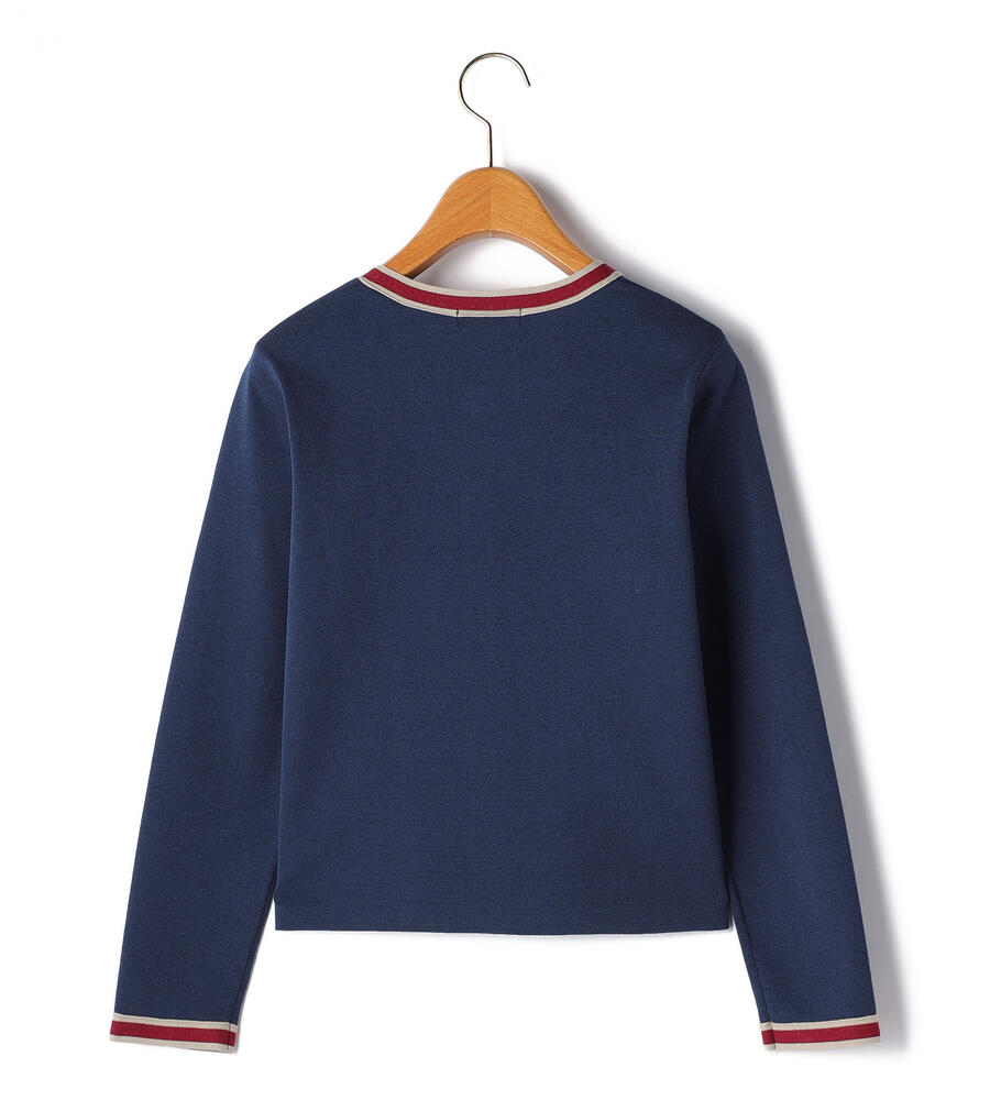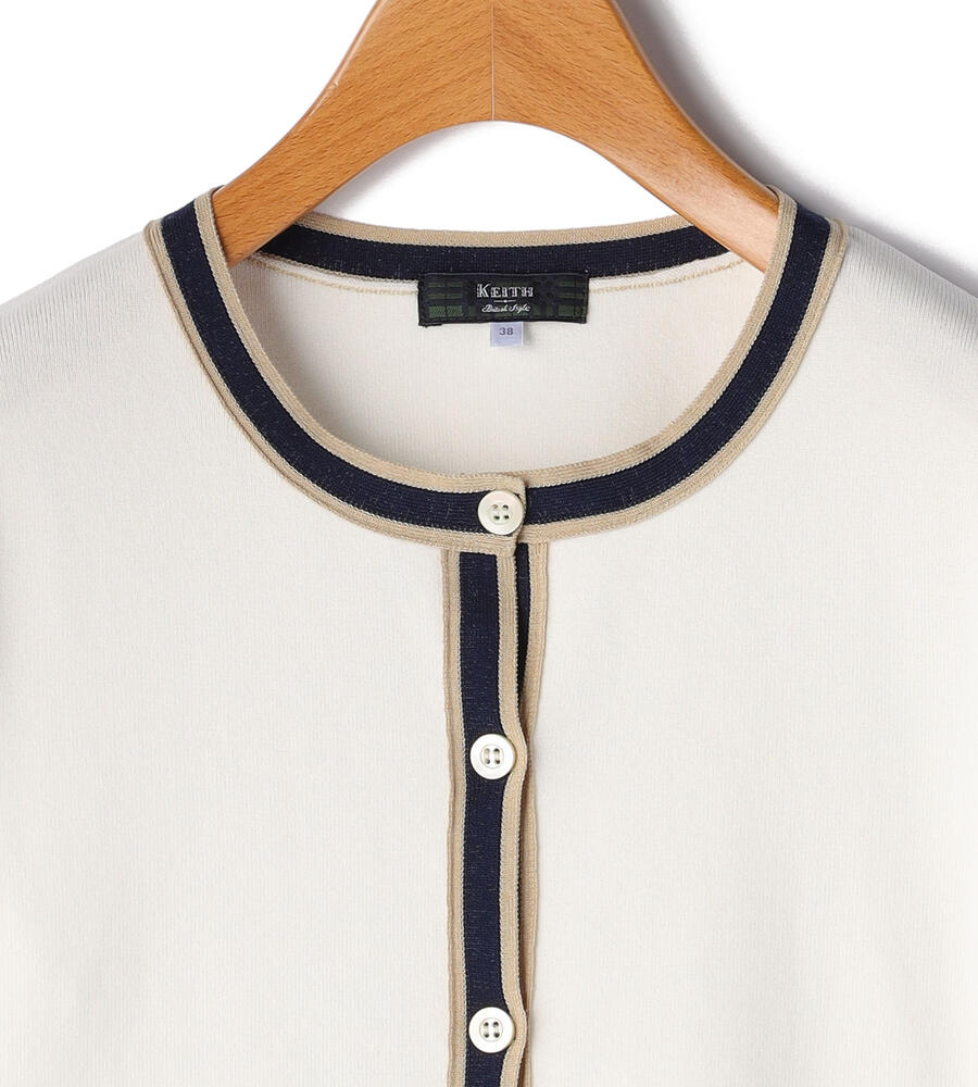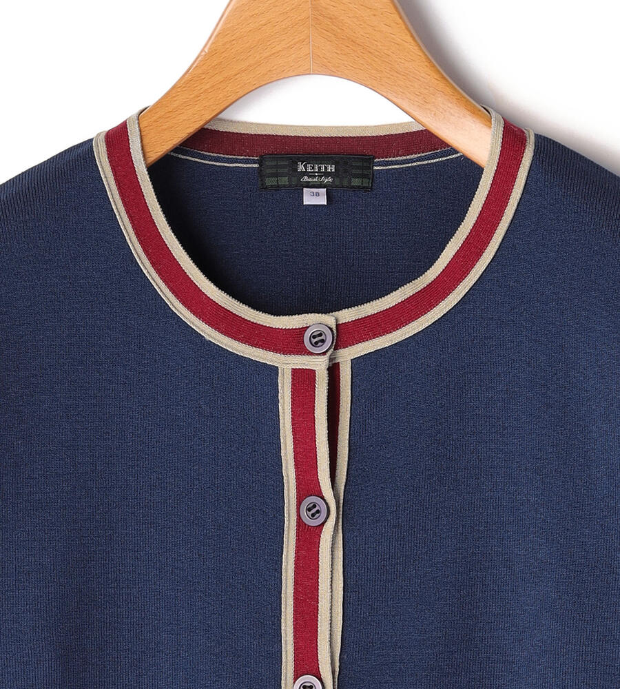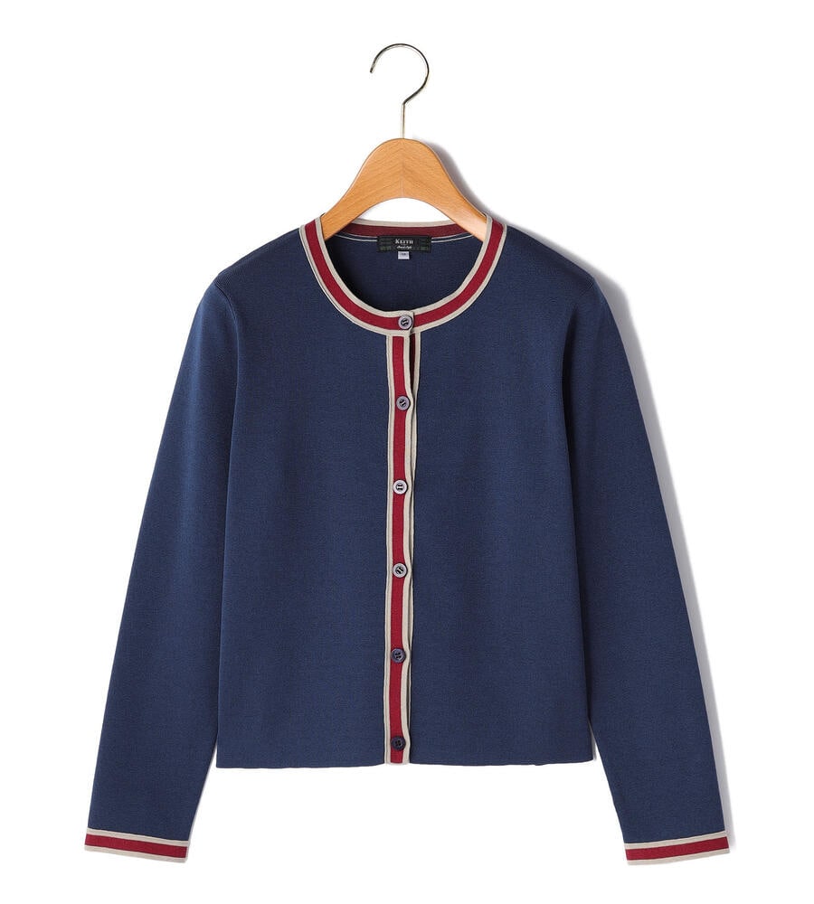 赤と白のライン使いがアクセントのトリムニットカーディガン。着こなしにさりげないアクセントを与えてくれるスタイリッシュなデザイン。コンパクトなサイジングで上半身がすっきりとまとまり、様々なボトムと好相性でバランスよく着こなせます。コーディネートをエレガントなムードにスタイルアップしてくれるアイテムです。