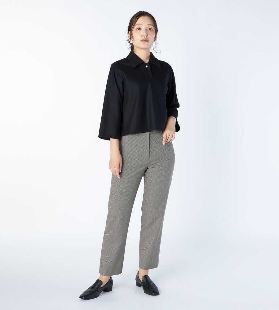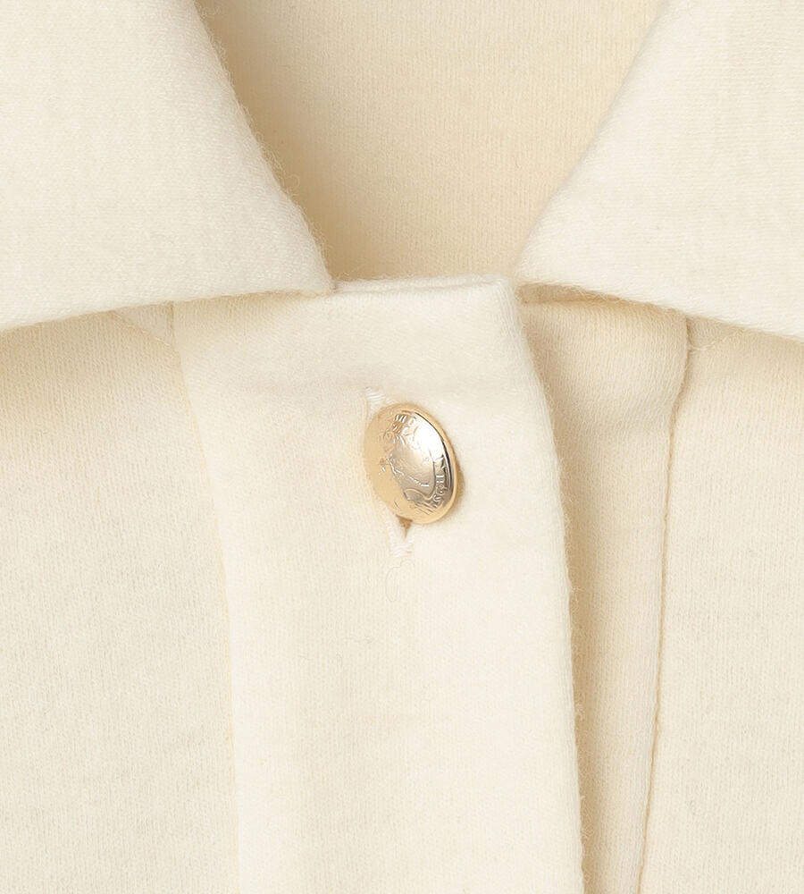 秋冬シーズンらしいウールジャージー生地で仕立てたポロカラーカットソー。幅広めの袖、ショート丈、ゆとりのあるシルエットと、旬のディティールを取り入れたトレンド感抜群のデザインが魅力。紋章入りのボタンがさりげないアクセント。お手持ちのボトムを合わせるだけで、旬のスタイリングが完成する一枚です。