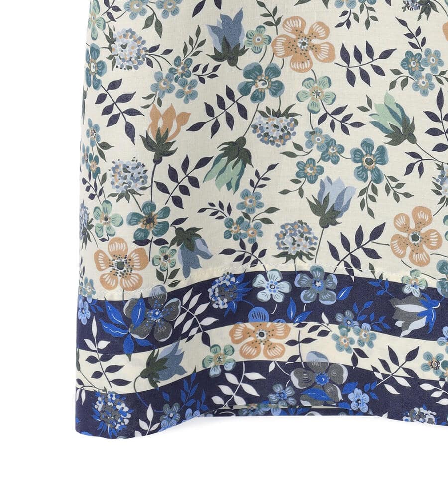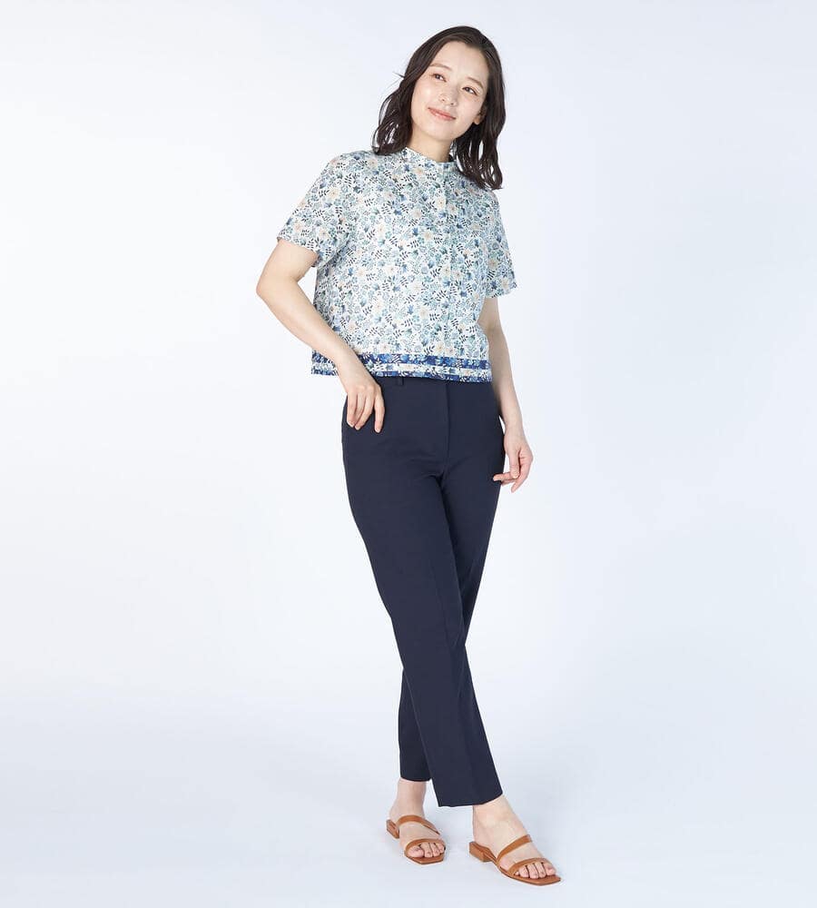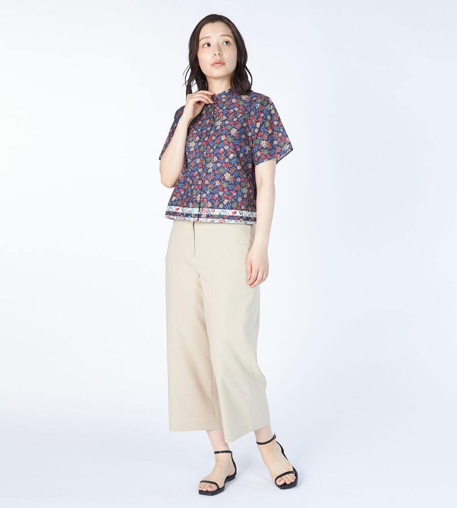 心が浮き立つようなピースフルな花柄を散りばめたブラウス。裾に別色のラインを入れることで、メリハリのある表情に仕上げています。ジャストなサイジングと短めの着丈を採用しており、バランスの取れたスタイリングを後押し。裾を絞っていないため、腰まわりがすっきりと見えるのも特徴です。