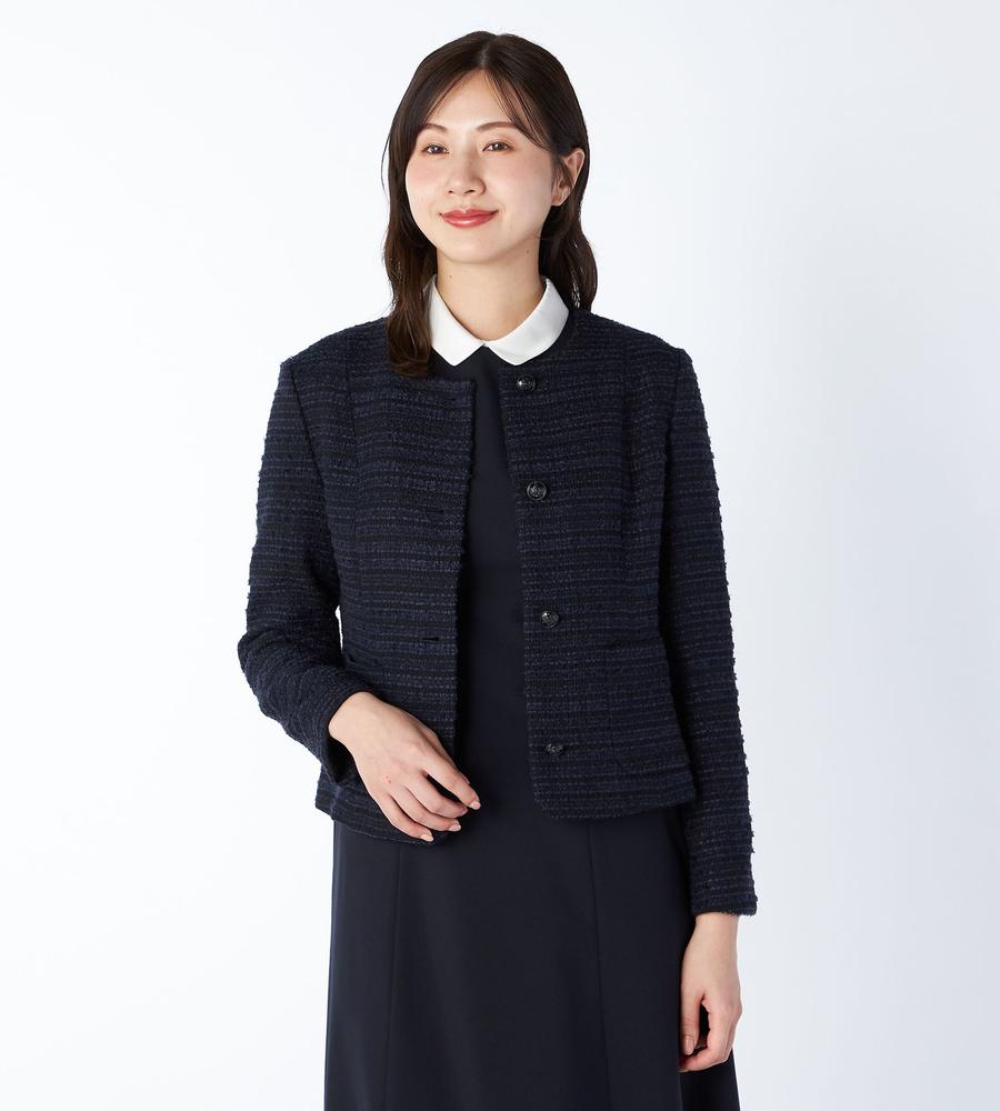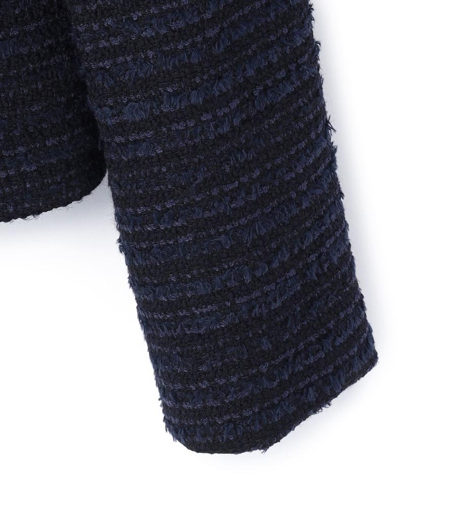 もこもこのモールツィード生地で仕立てたジャケット。落ち着いたトーンながら、生地の持つ表情で華やかなムード。フロントボタンはブランドのロゴマークを刻印しシックなムード。衿のないすっきりとしたデザインで様々なトップスと好相性。お出かけにはもちろん、オケージョンシーンなどでも活躍するアイテムです。