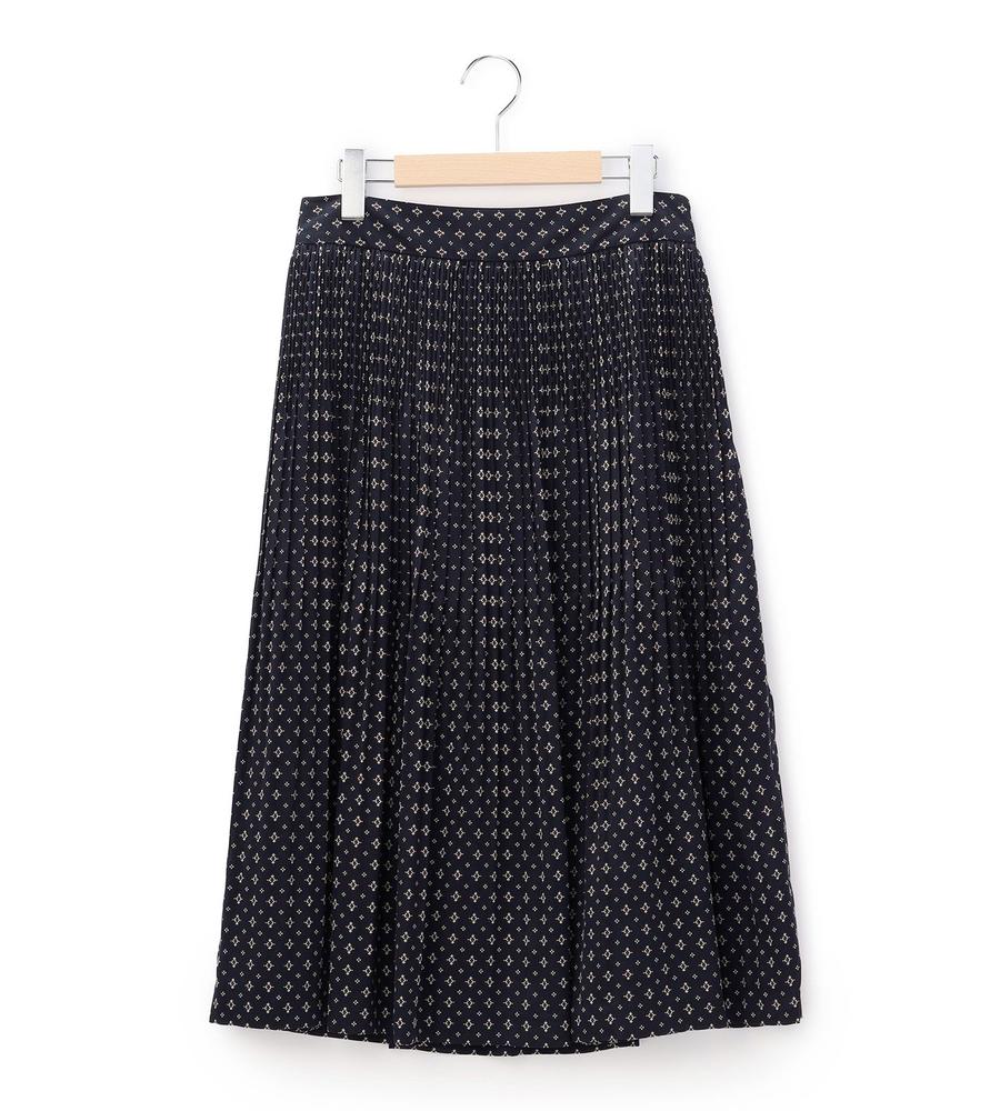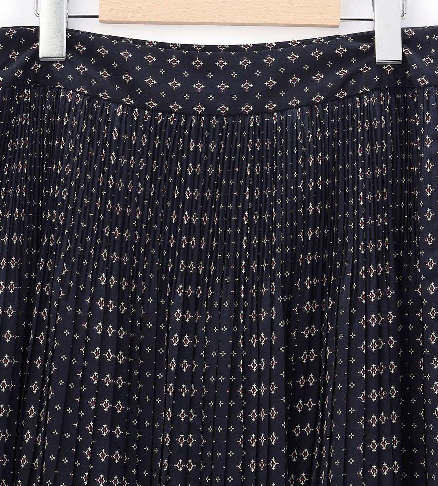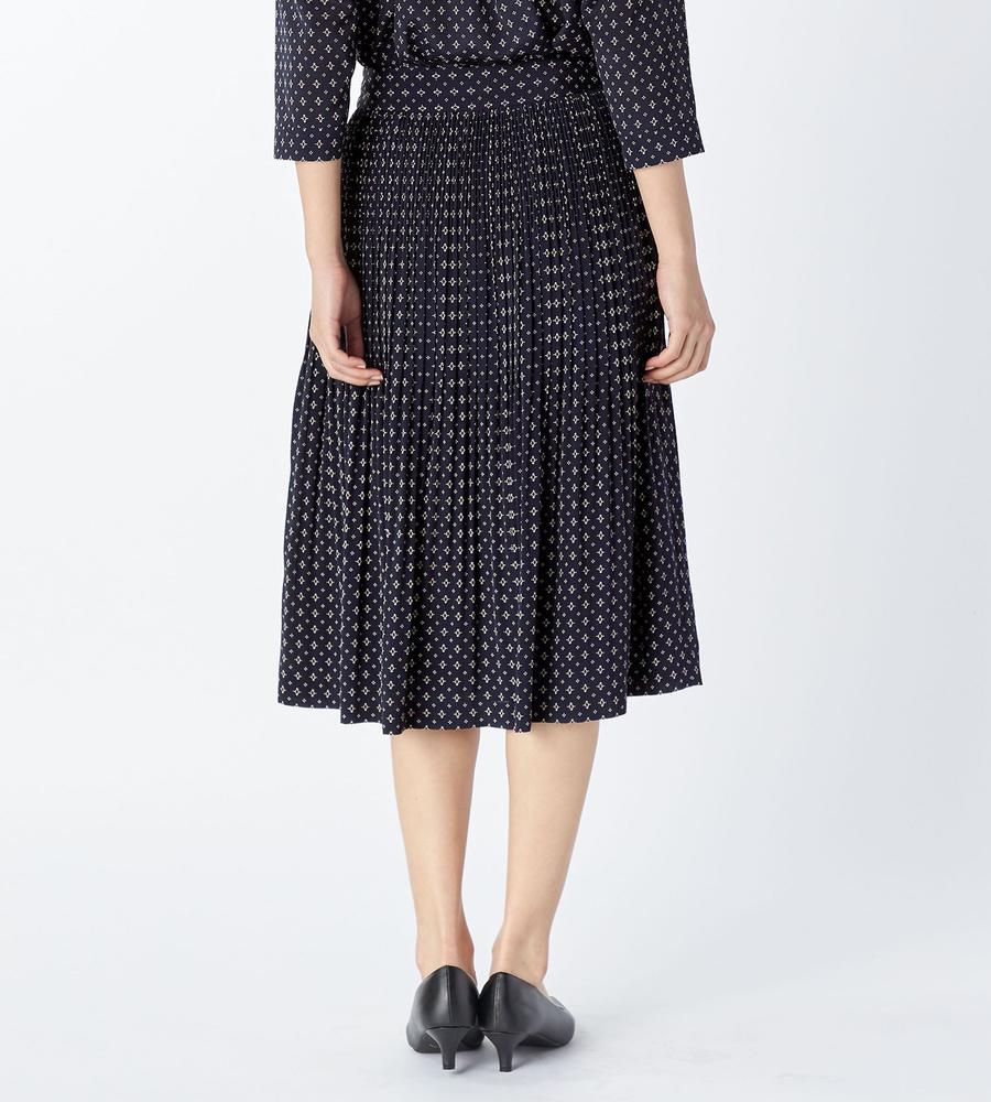 軽やかな素材を細いプリーツ仕立てにしたエレガントなスカート。プリーツは途中で折り目がなくなり、裾は優美に揺れる仕組み。きちんとした印象でもかしこまりすぎずに楽しめるのが魅力です。クラシカルなジオメトリックパターンは、よそ行きコーデにも最適。膝が隠れる程度の着丈は、大人の装いに最適です。