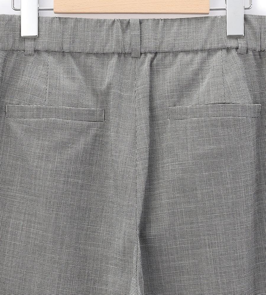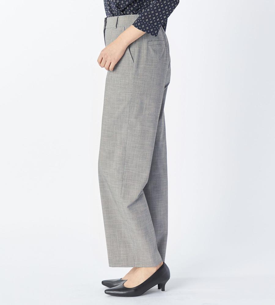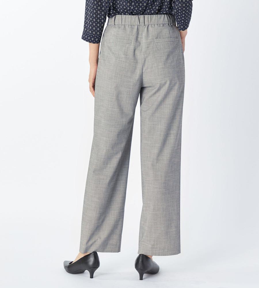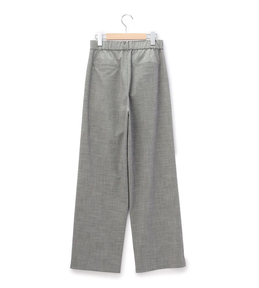 遠目には単色にも見える、緻密なハウンドトゥース柄を用いたパンツ。腰まわりがすっきりと見えるノータックデザインで、ワイドながらもエレガントな印象です。背面をゴム仕立てにしており、窮屈感なく楽しめるのが特徴。トップスの裾をインさせる着こなしもバランスよくまとまります。ジャケットを合わせるとよりかっちりとした装いが完成します。
