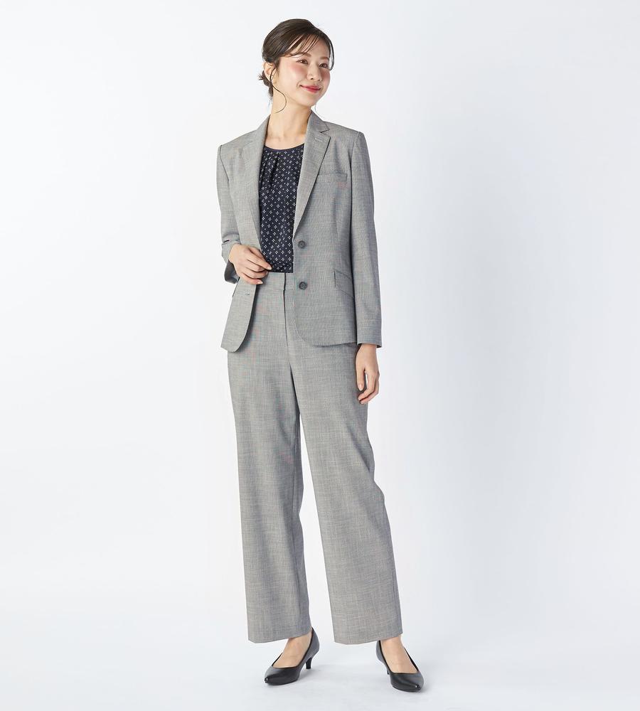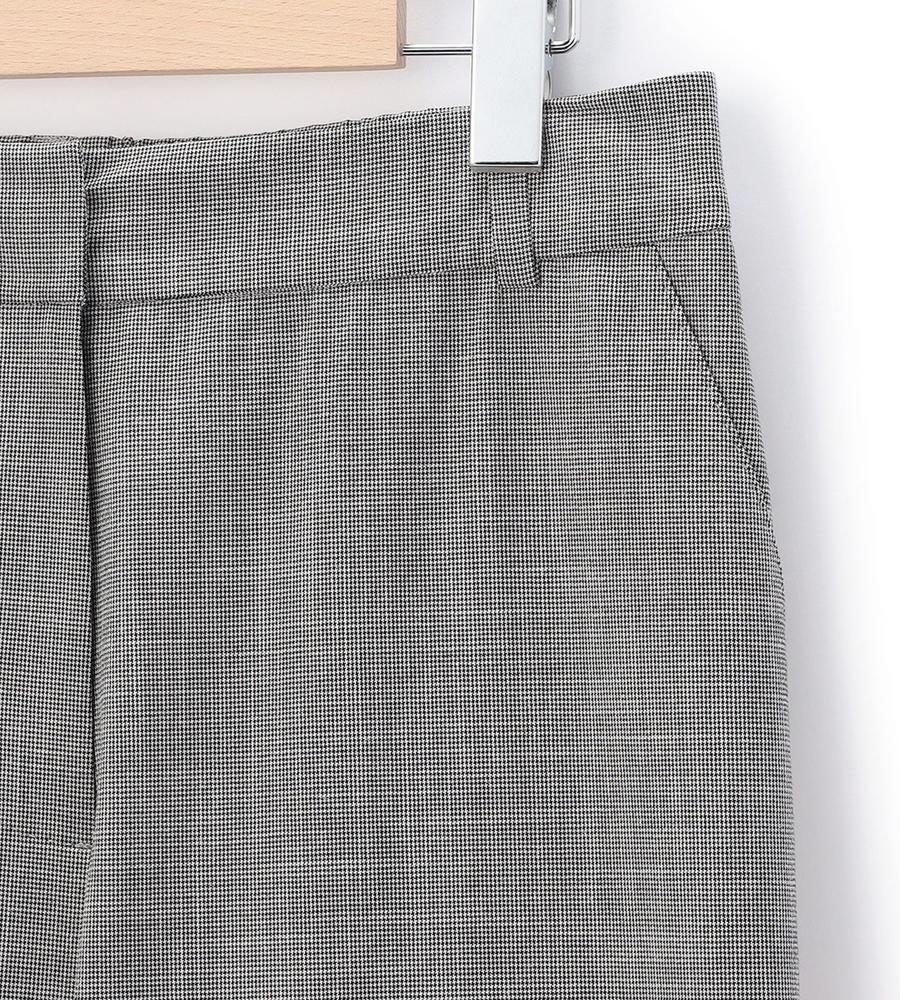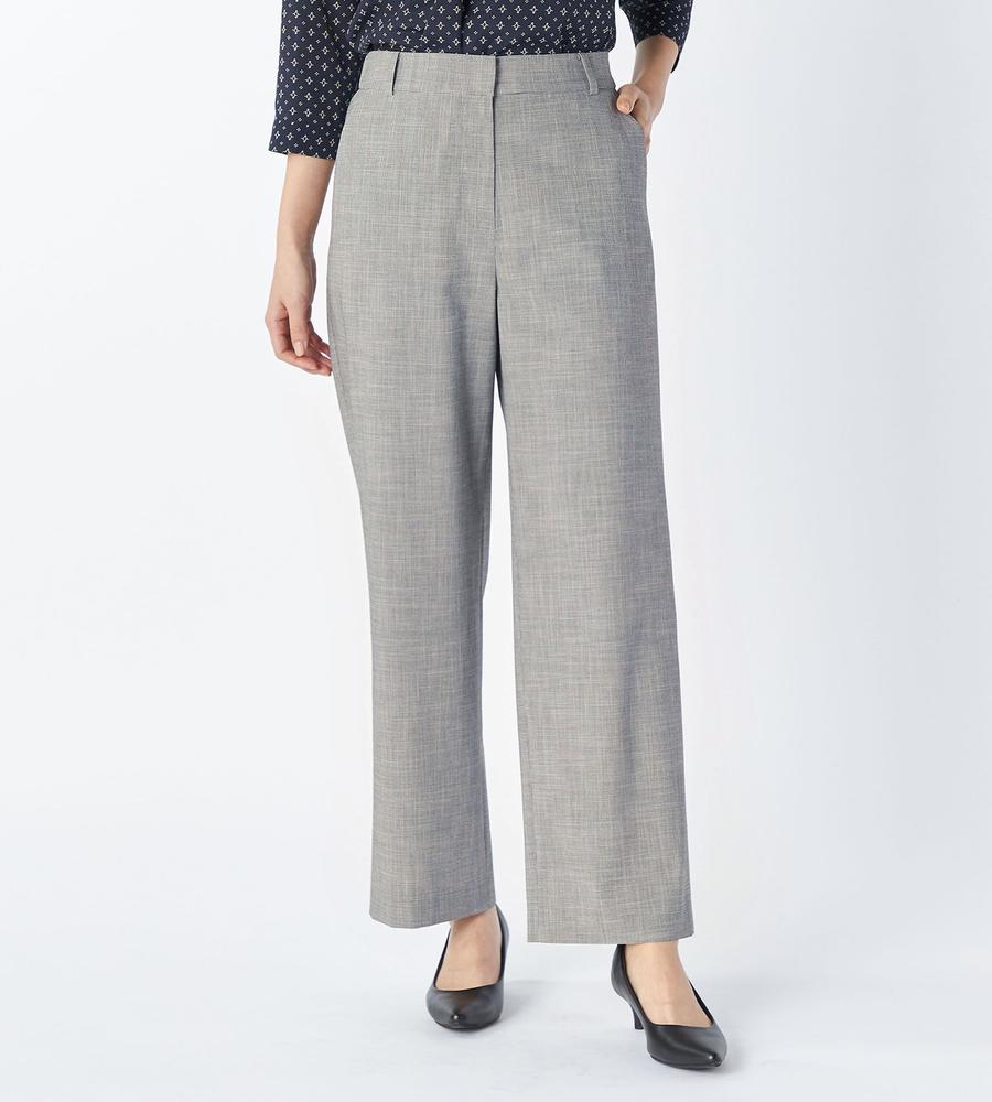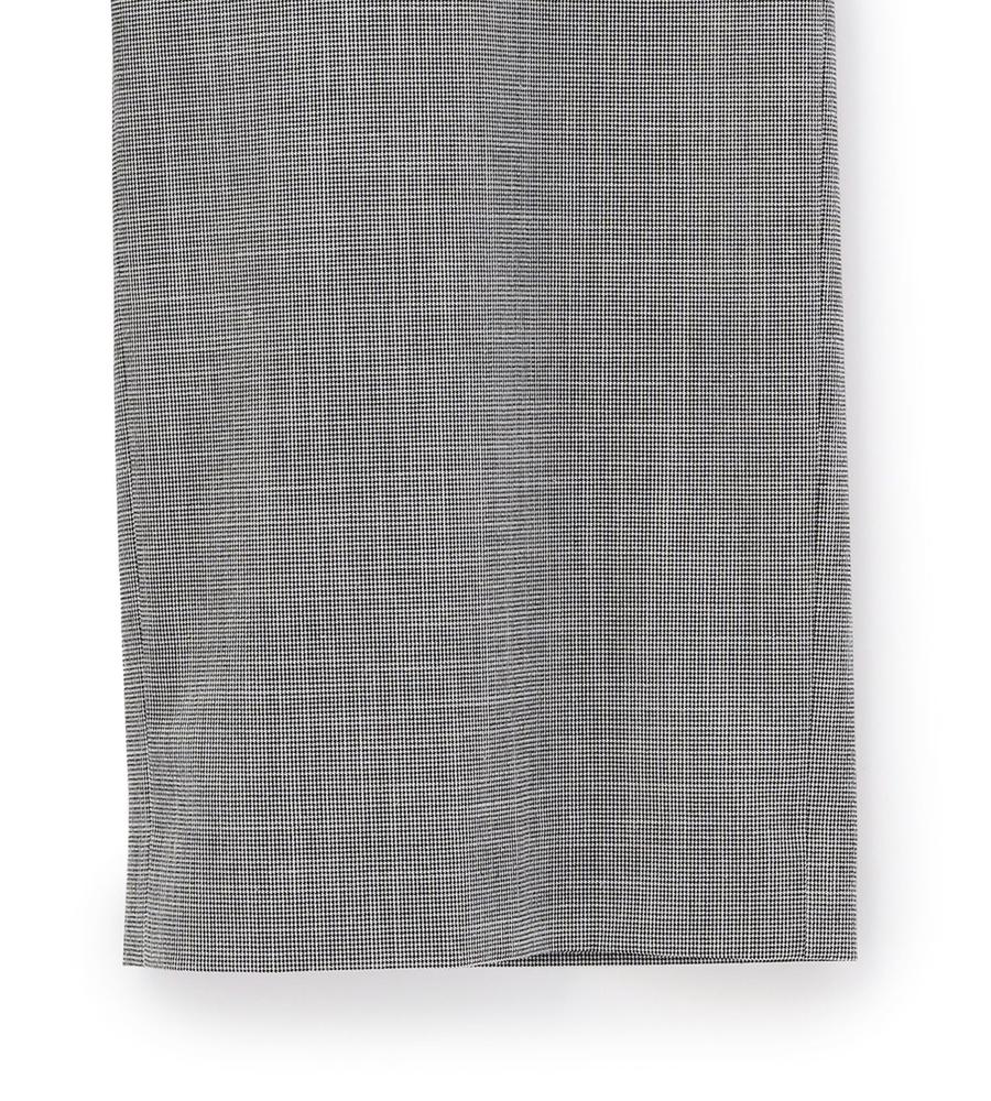 遠目には単色にも見える、緻密なハウンドトゥース柄を用いたパンツ。腰まわりがすっきりと見えるノータックデザインで、ワイドながらもエレガントな印象です。背面をゴム仕立てにしており、窮屈感なく楽しめるのが特徴。トップスの裾をインさせる着こなしもバランスよくまとまります。ジャケットを合わせるとよりかっちりとした装いが完成します。