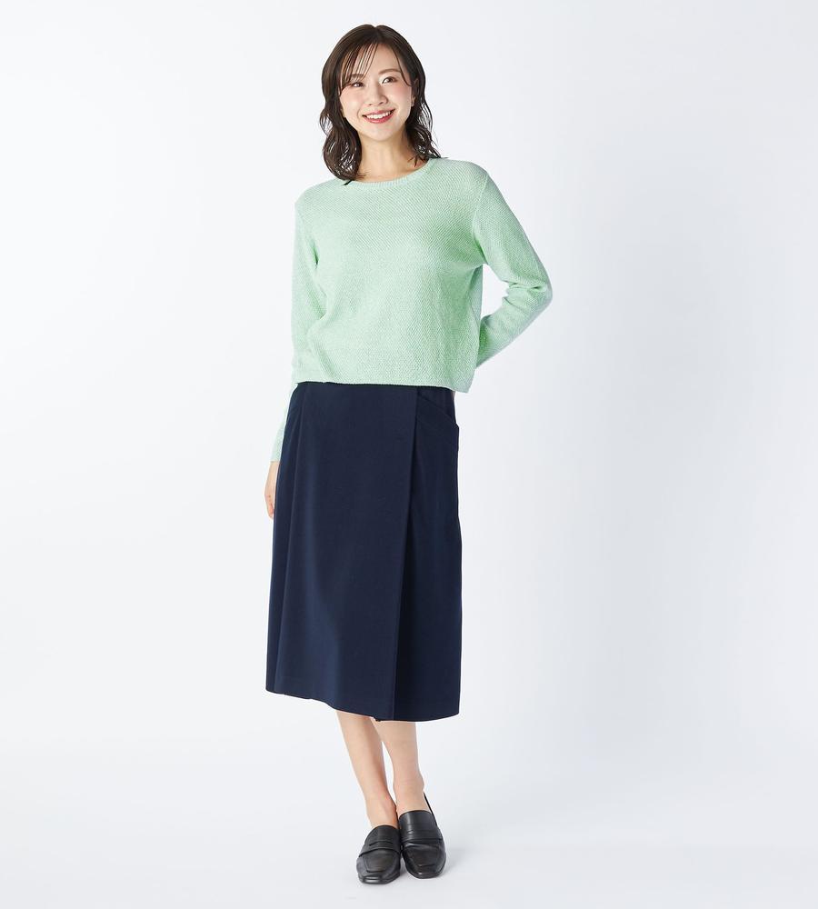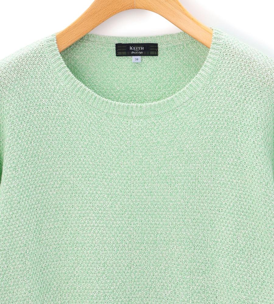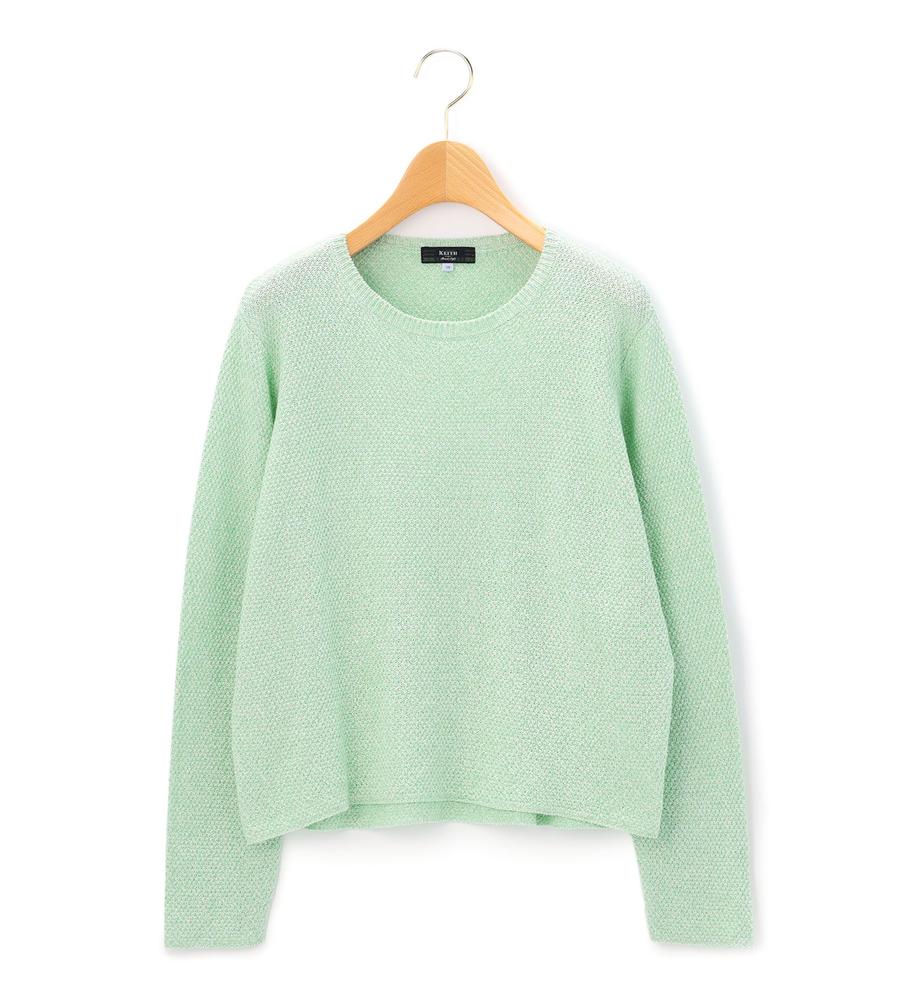 柔らかな春色のラウンドネックニットプルオーバー。シンプルなデザインながら、立体感のある鹿の子調の編み目が印象的なアイテムです。シルエットは品の良いコンパクトな作りで、長すぎない着丈がポイントに。タックインスタイルはもちろん、アウトでもすっきりしたバランスで着こなせます。