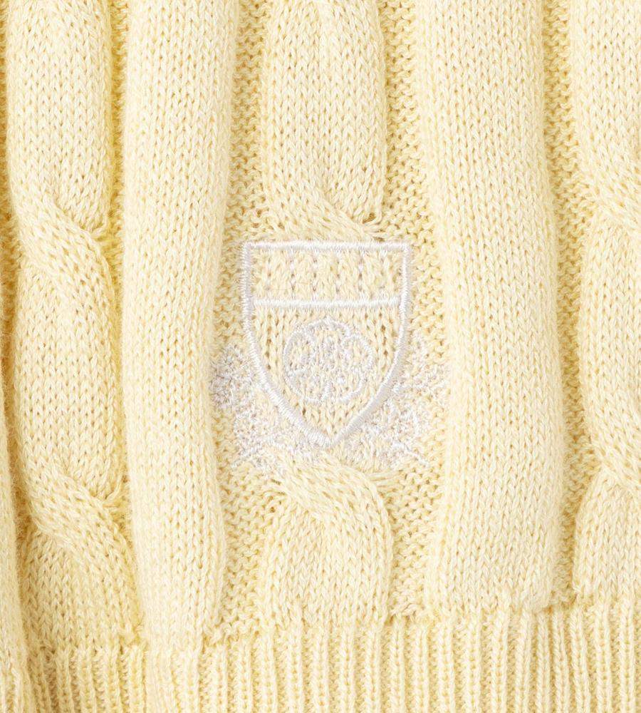 クラシカルかつエレガントなケーブル編みのクルーネックニットプルオーバー。スタイリングに差し色効果を発揮してくれるニットアイテムです。ブリティッシュトラディショナルを感じさせるエンブレム刺繍が重厚感漂うワンポイントに。ハイゲージのコットンニット素材で、ロングシーズン着回し可能です。