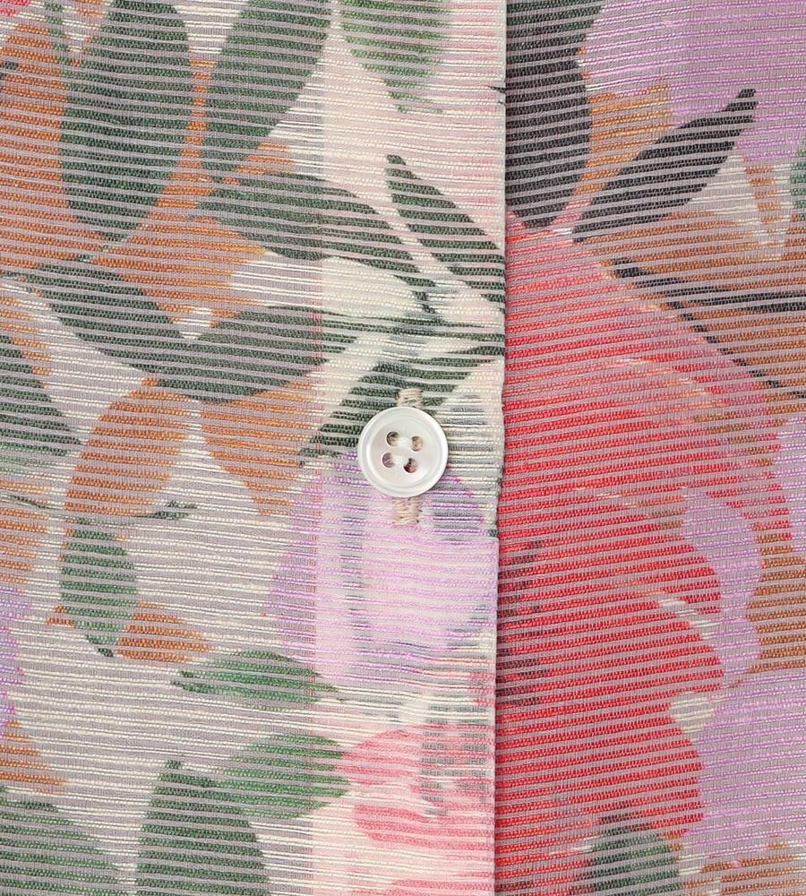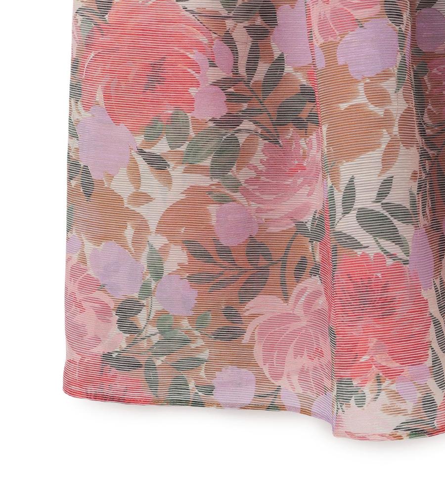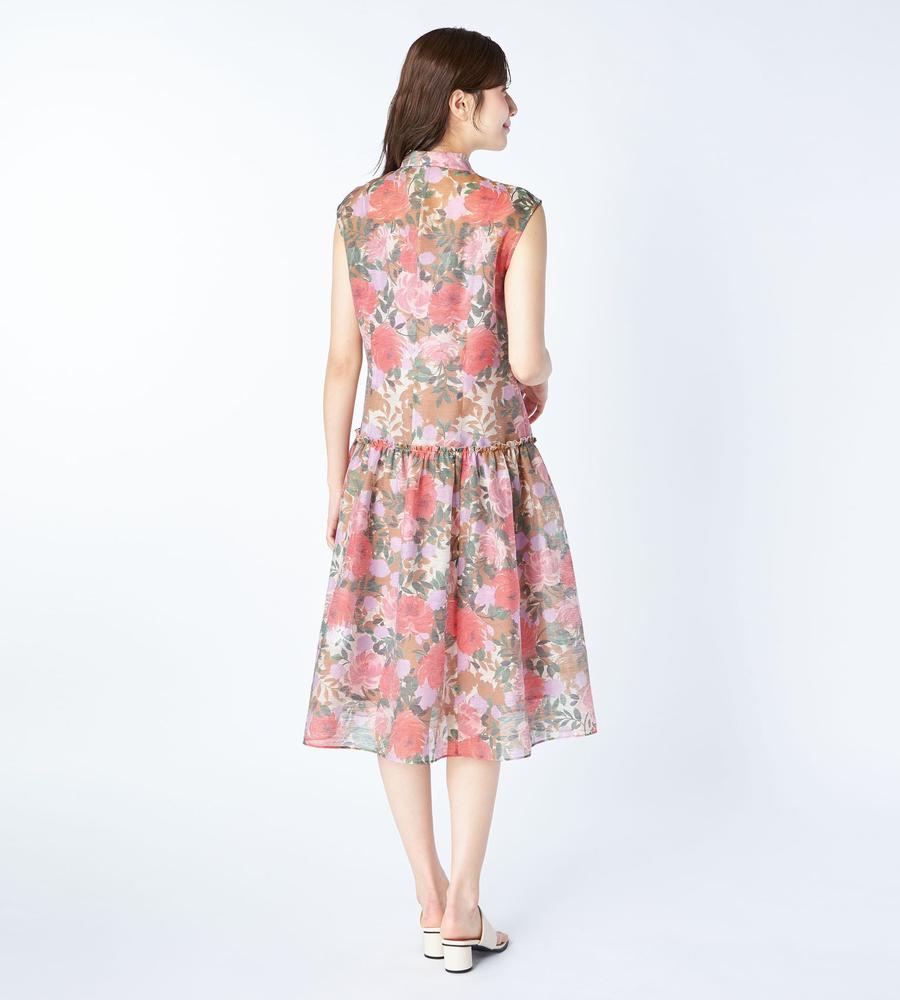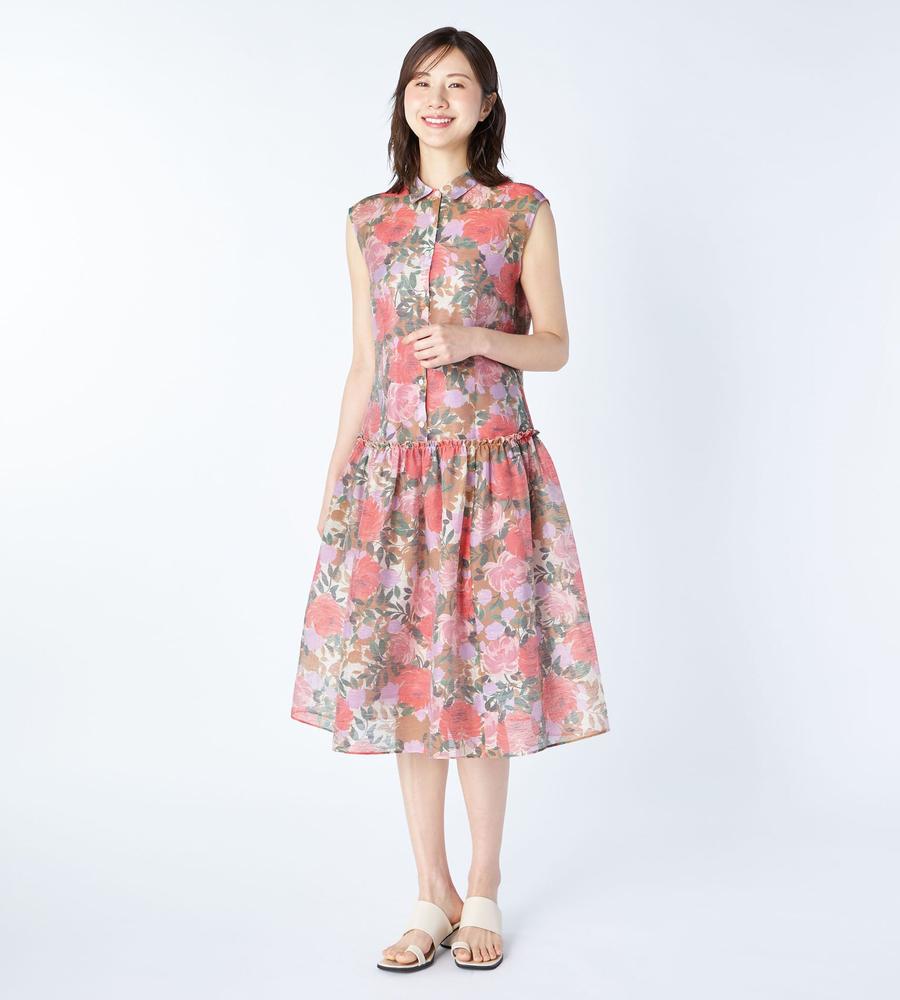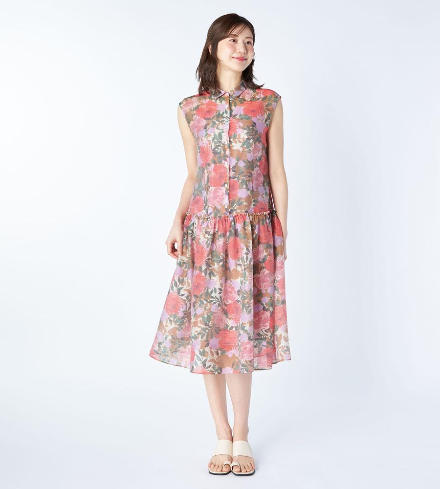 水彩画タッチのようなフラワープリント柄がフェミニンなノースリーブワンピースです。きちんと感のある衿付きデザイン、腰から下はギャザー切り替えから広がるボリュームを持たせたシルエットで仕上げました。あえて裏地を短めにすることで素材の透け感を生かしたのがポイント、リゾートシーンやお呼ばれにもぴったりです。