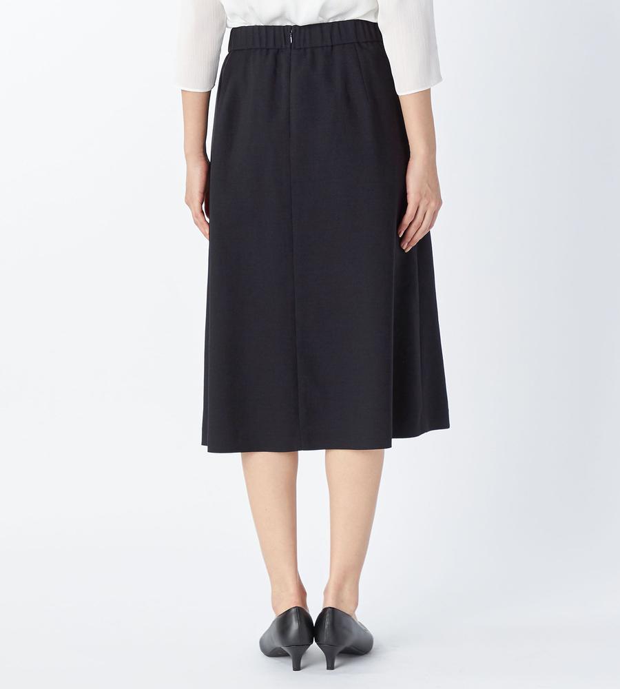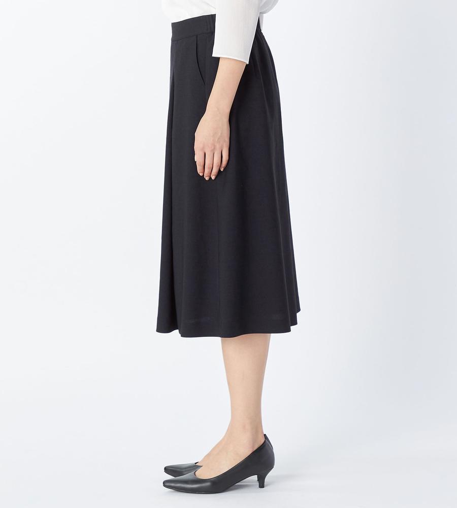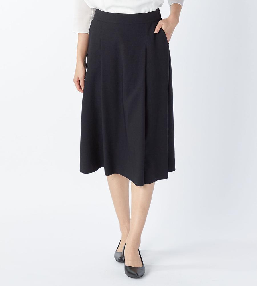 フロントのプリーツがエレガントなデザインのミディ丈スカート。自然なドレープ感がフェミニンなシルエット。便利なサイドポケット付き。後ろウエストはゴム仕様、ストレッチ素材の生地で身体の動きにフィットし、快適な着心地なのもうれしいポイント。お出かけにはもちろん、フォーマルなシーンにもマッチするシックな一枚です。