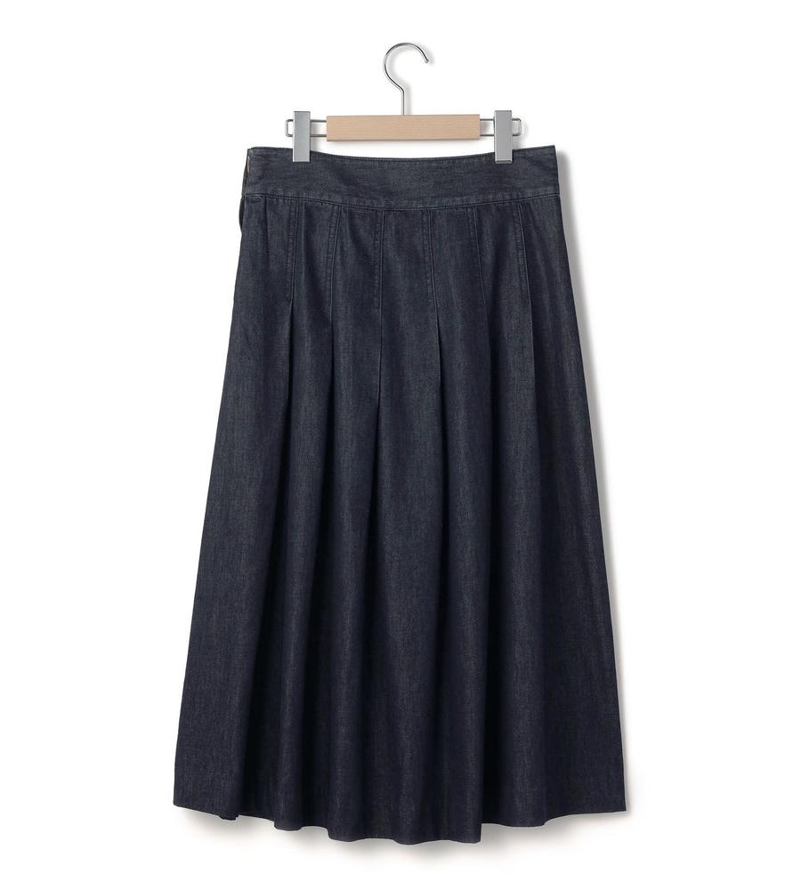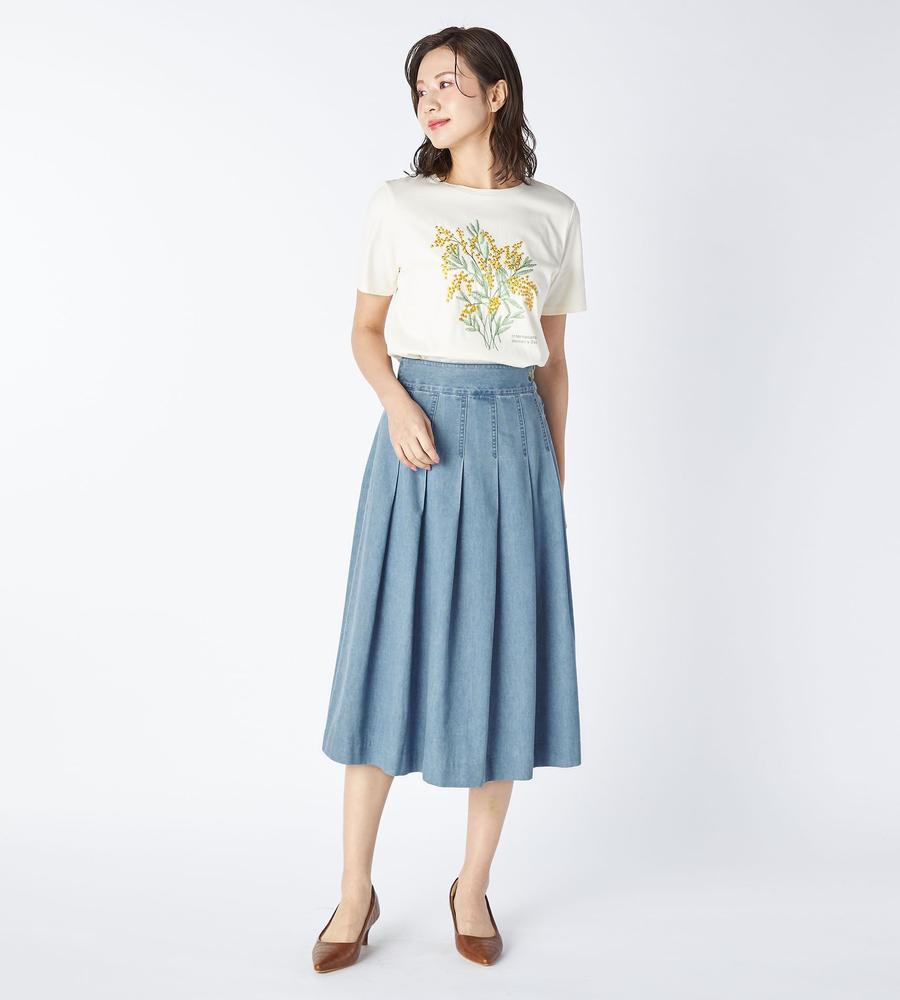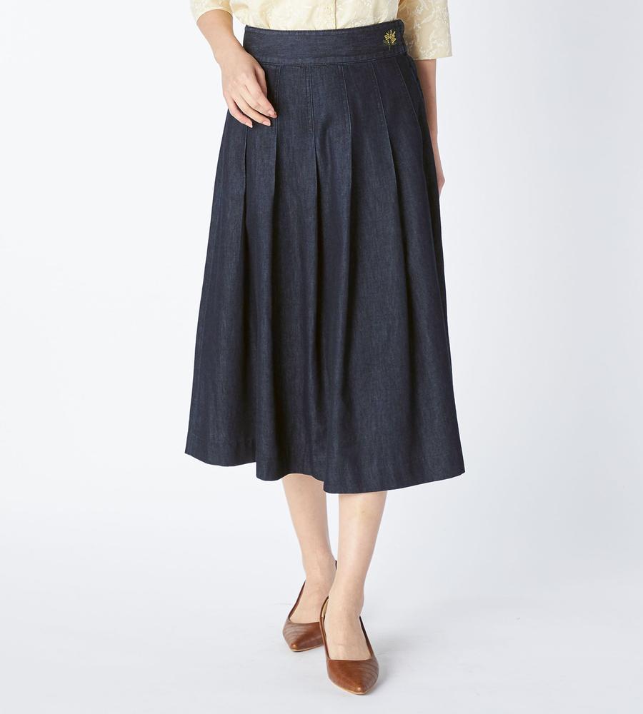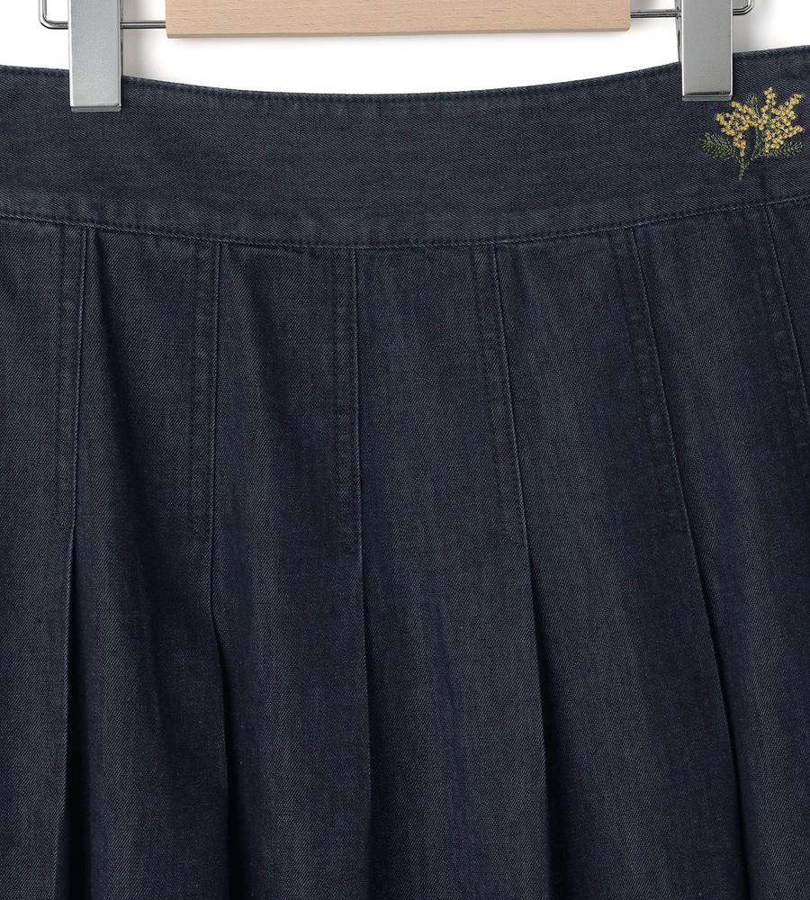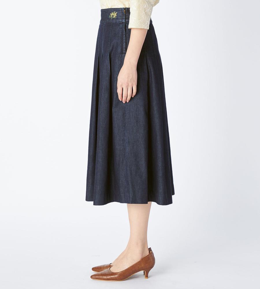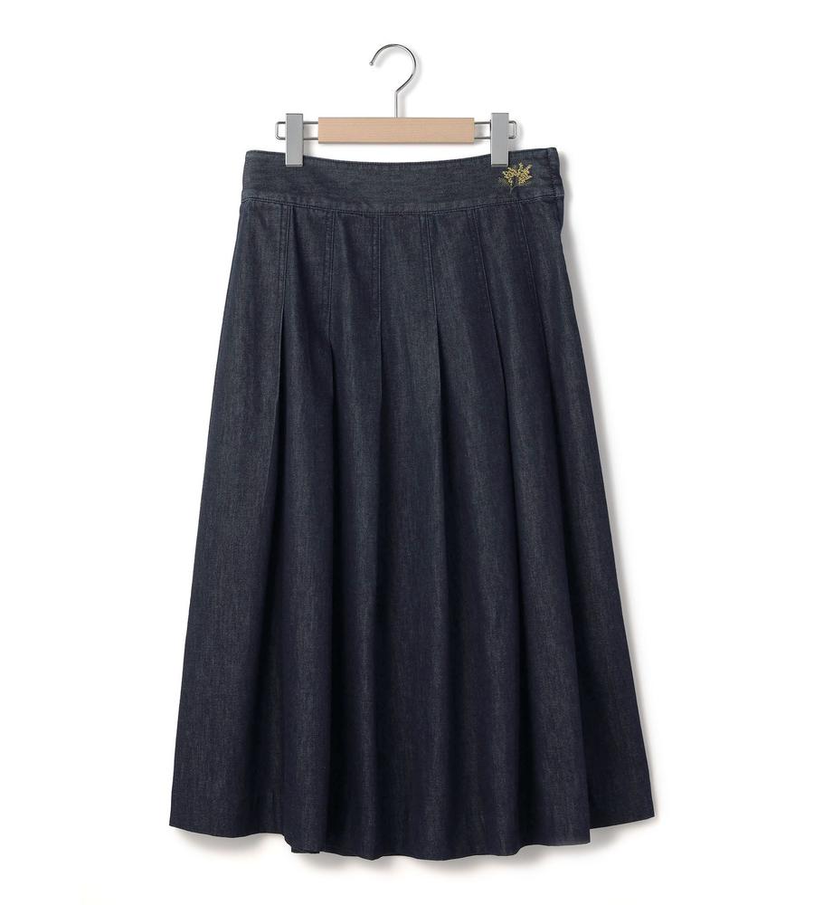 気取らない大人のカジュアルコーデをかなえてくれるデニム仕立てのスカートです。この素材には珍しいタックプリーツをあしらったデザインで、きちんと感のあるワンランク上の着こなしをかなえてくれます。ウエストの左サイドにはミモザ刺繍をあしらい、トップスINした際のアクセントになる技あり仕様です。