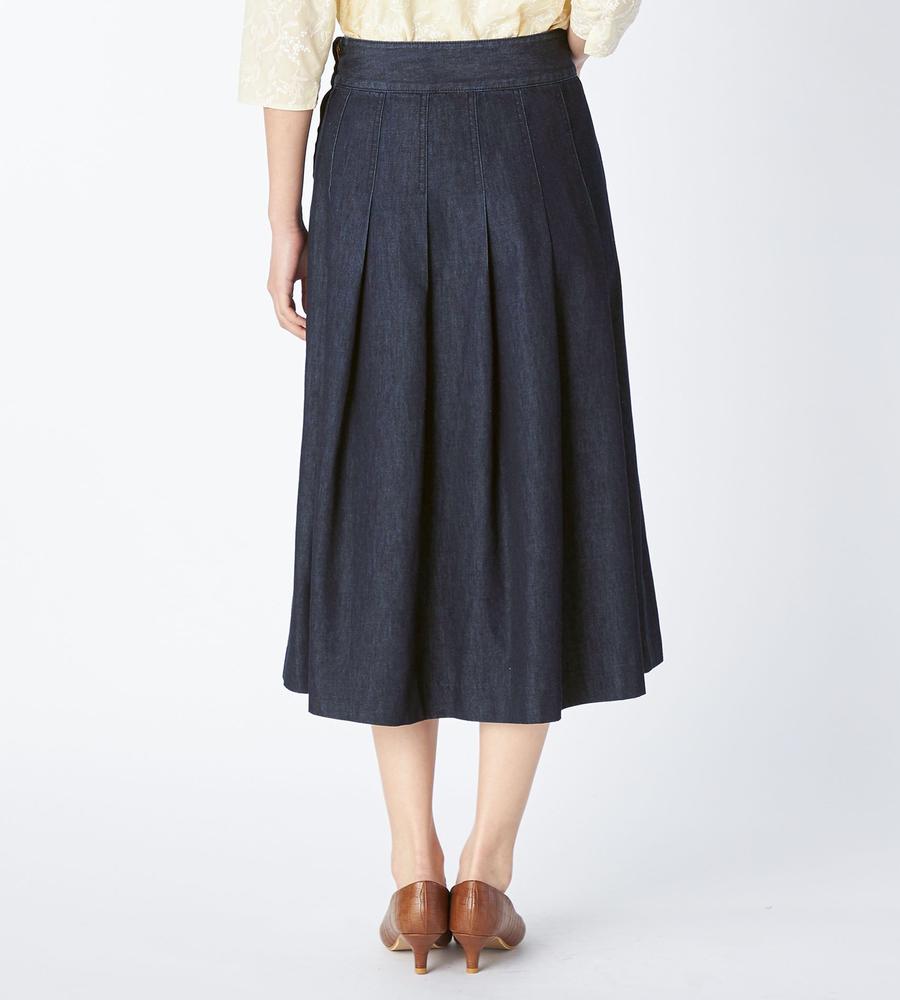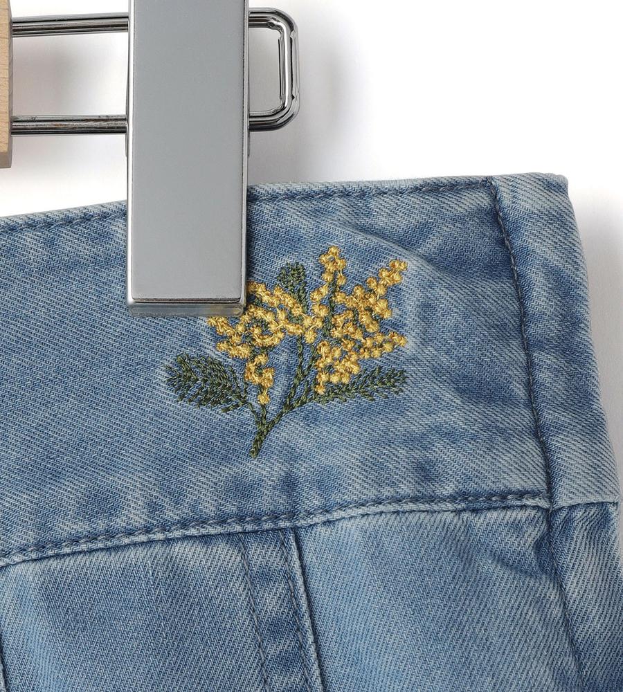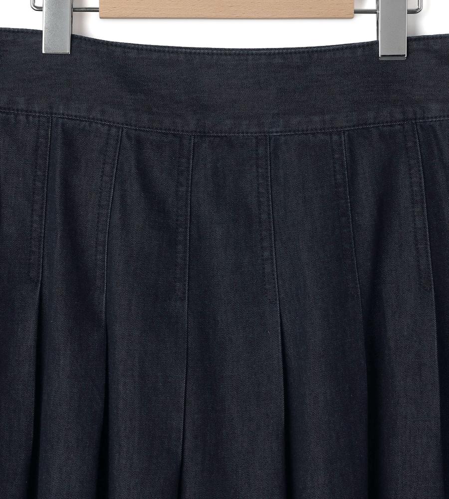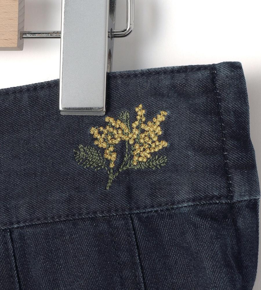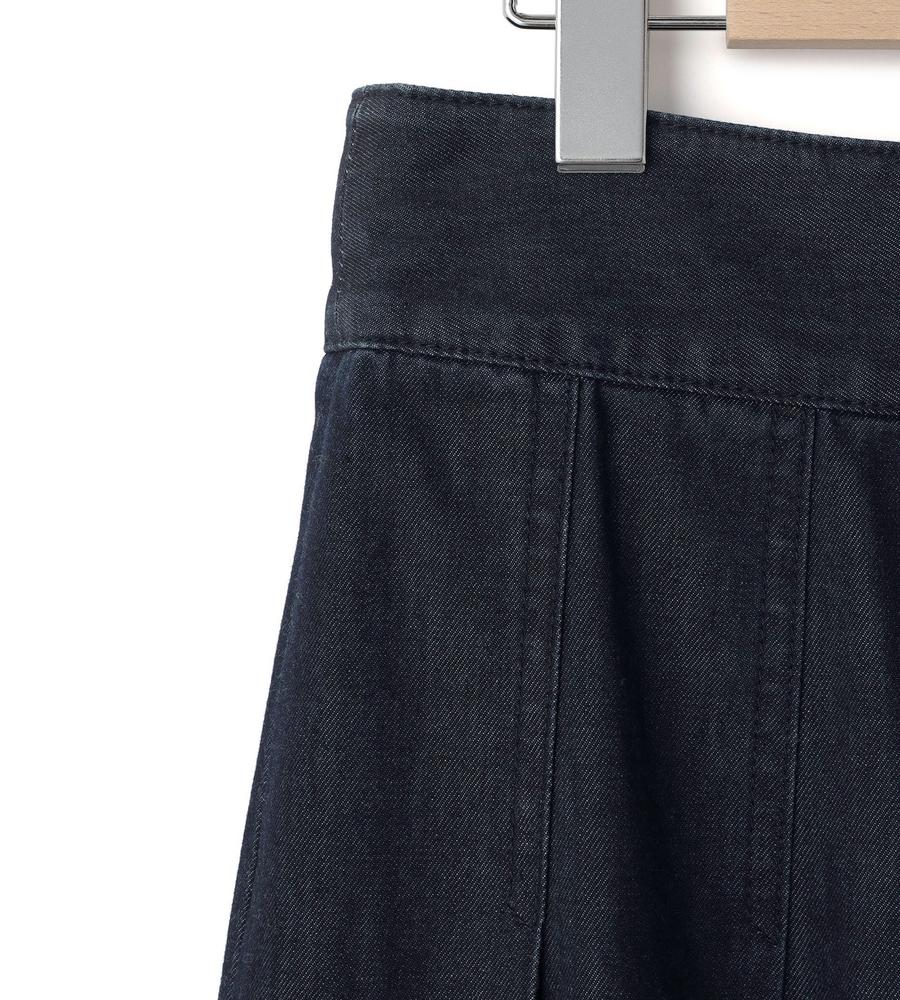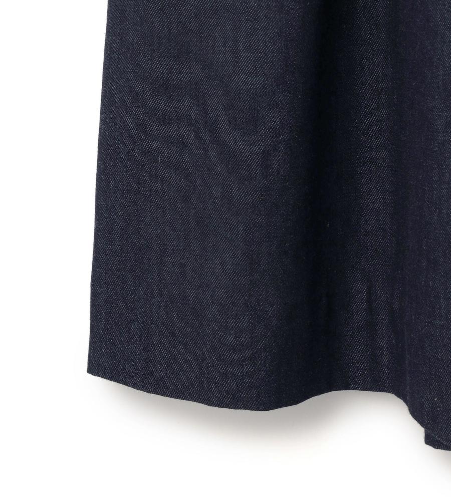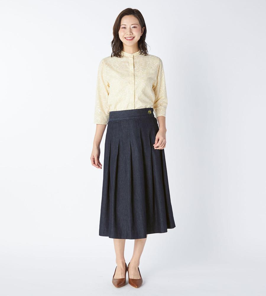 気取らない大人のカジュアルコーデをかなえてくれるデニム仕立てのスカートです。この素材には珍しいタックプリーツをあしらったデザインで、きちんと感のあるワンランク上の着こなしをかなえてくれます。ウエストの左サイドにはミモザ刺繍をあしらい、トップスINした際のアクセントになる技あり仕様です。