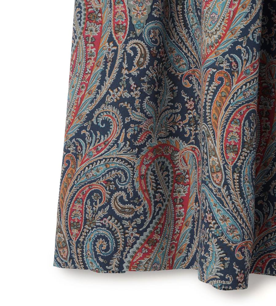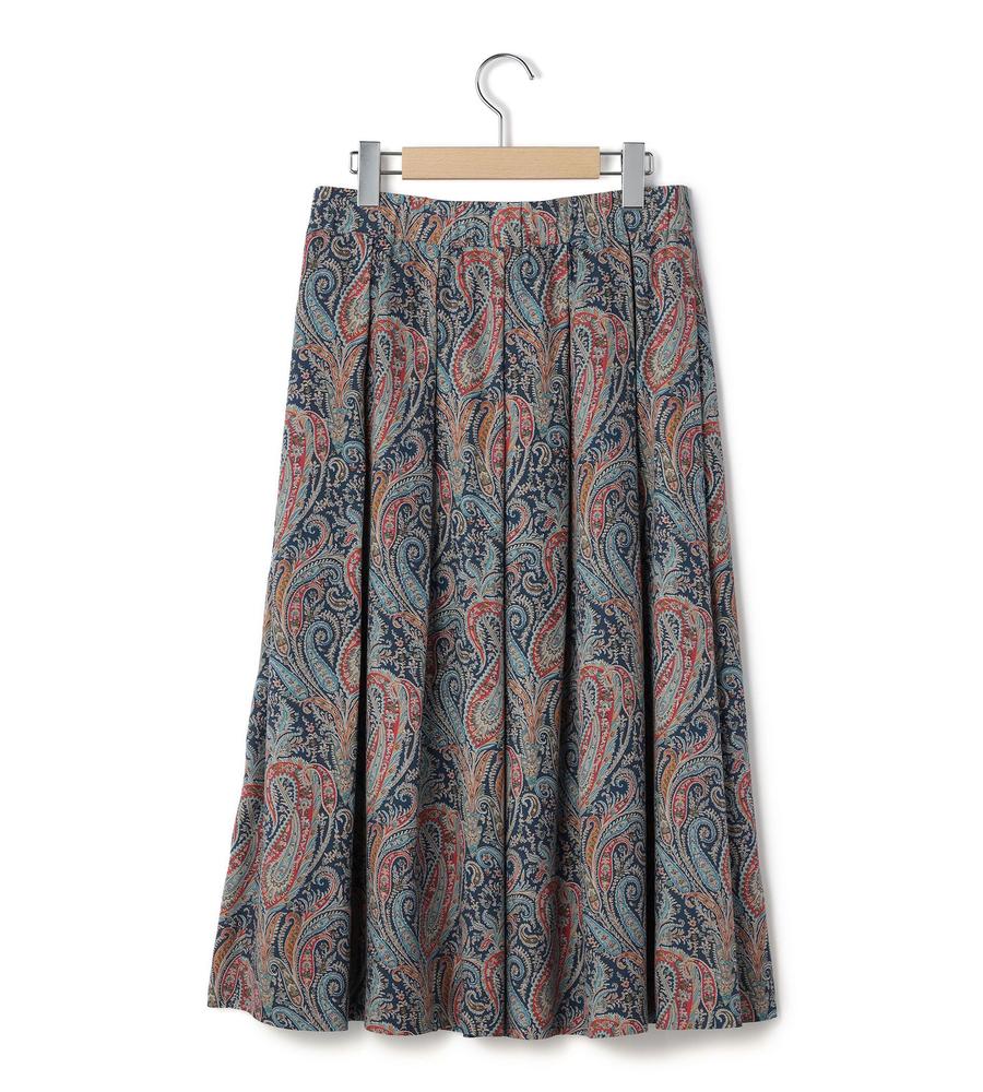 遠目にも存在感たっぷり、華やかな着こなしをかなえてくれるペイズリー柄のスカートです。膝がかくれるきちんと感のあるミディ丈、動きにあわせて広がるタックプリーツをあしらいました。ウエストの後ろはゴム切り替えでトップスINしやすくお腹まわりも楽ちん、あえてカジュアルなTシャツとの組み合わせもおすすめです。
