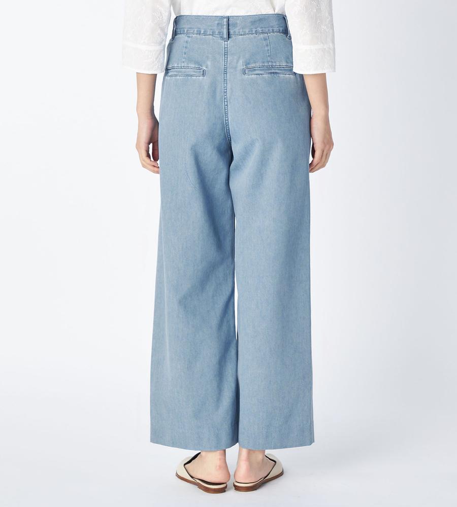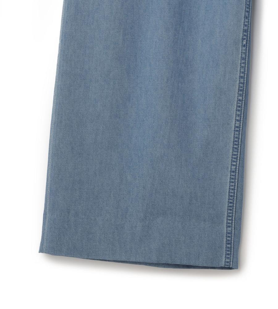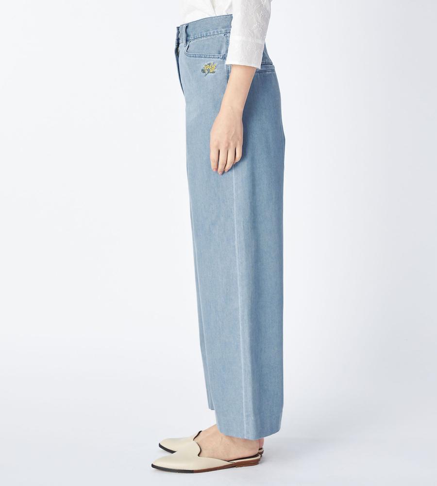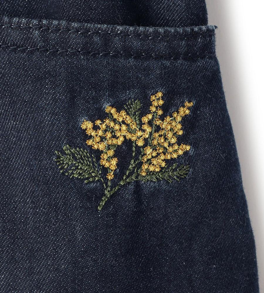 気取らない大人のカジュアルコーデをかなえてくれるデニムパンツです。ゆったりはけるワイドシルエットが気になる下半身をまとめてカバー、すっきり脚長効果とスタイルアップがまとめて狙えます。ウエストの左サイドにはミモザモチーフ刺繍をあしらい、トップスINした際のアクセントになる技あり仕様です。