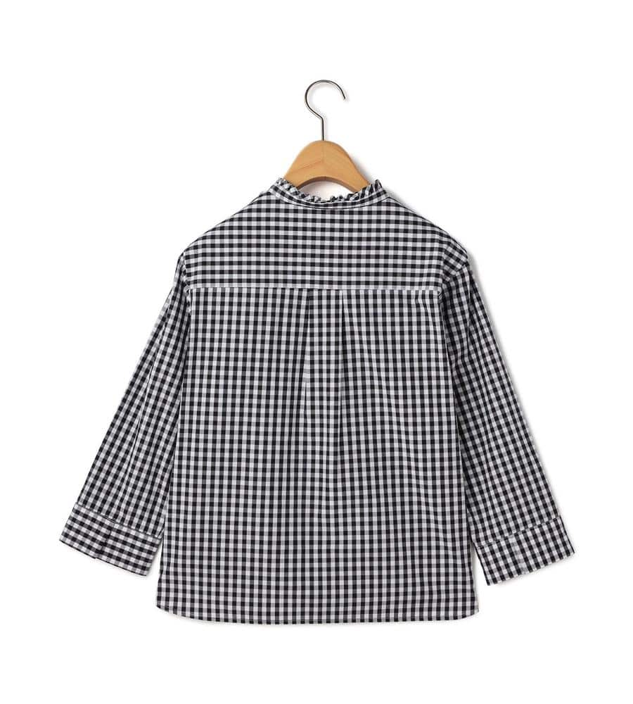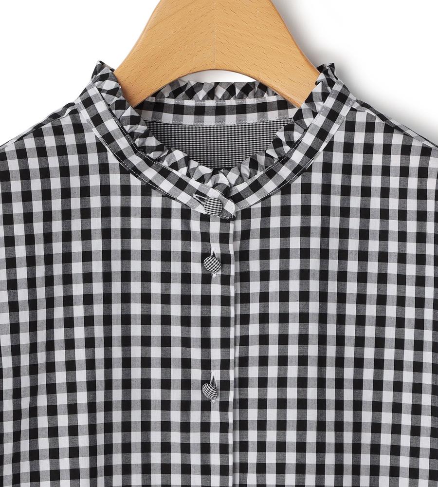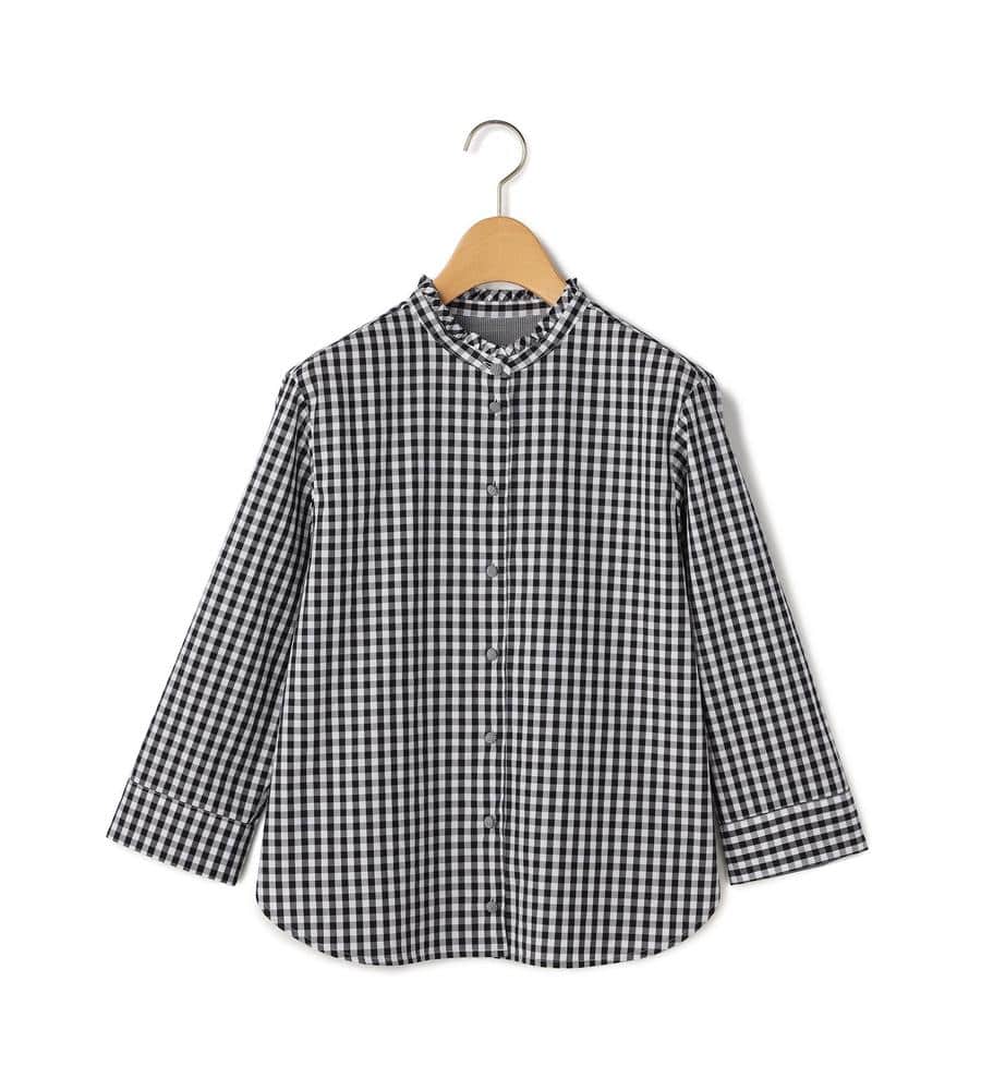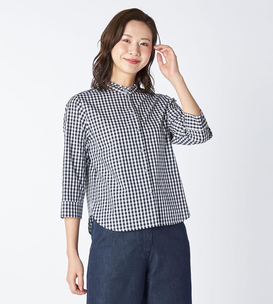 大人ガーリーな着こなしをかなえてくれるギンガムチェック柄のブラウスです。衿元にはフリルをあしらい顔まわりに華やかをプラス、ボタンも同柄のくるみボタンを使いディテールにもこだわりました。ほど良いハリ感のあるコットン100%素材で、1枚でもインナーとしても着まわししやすい7分袖です。