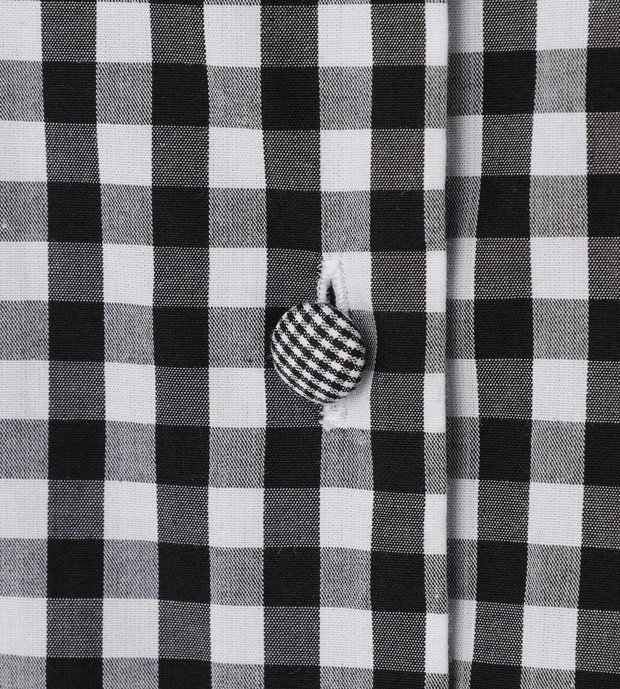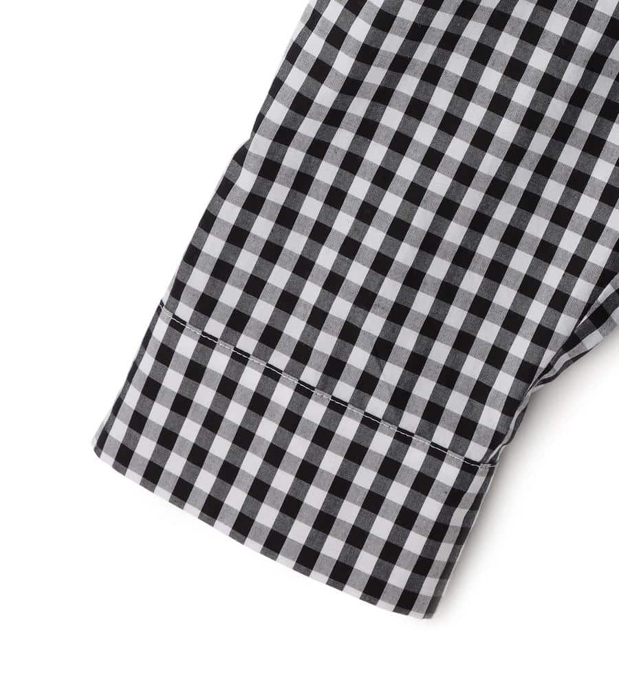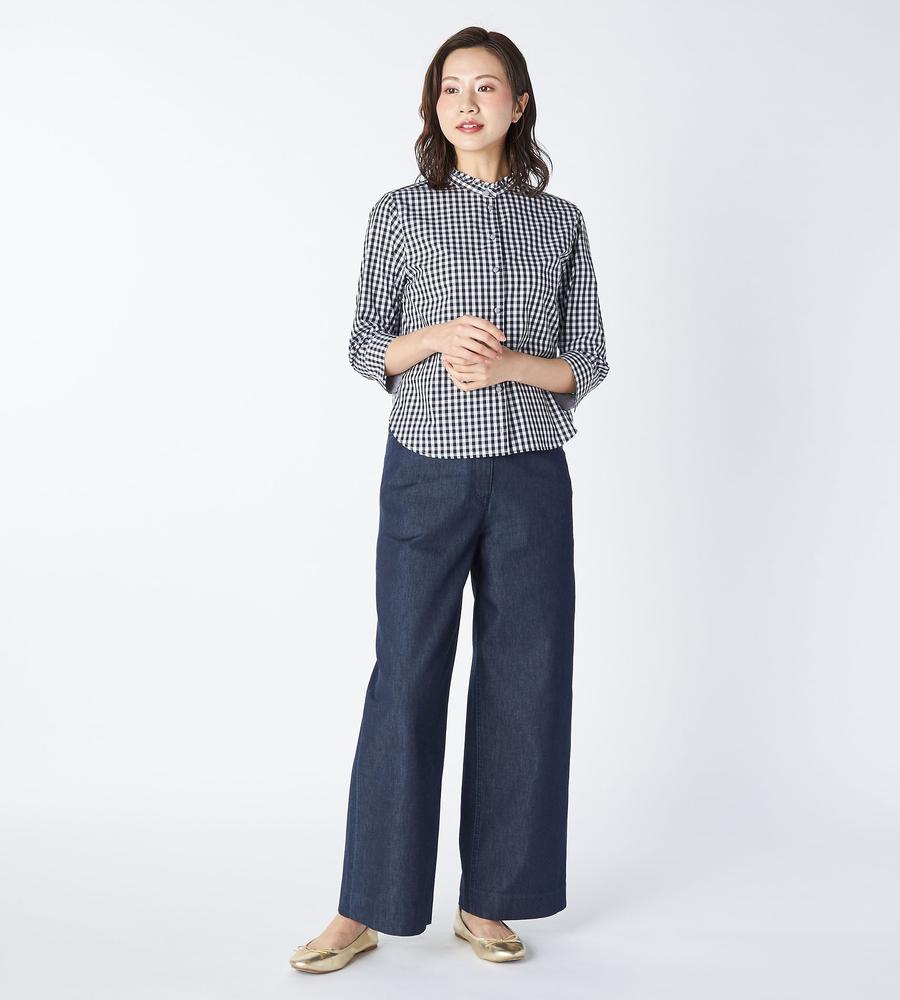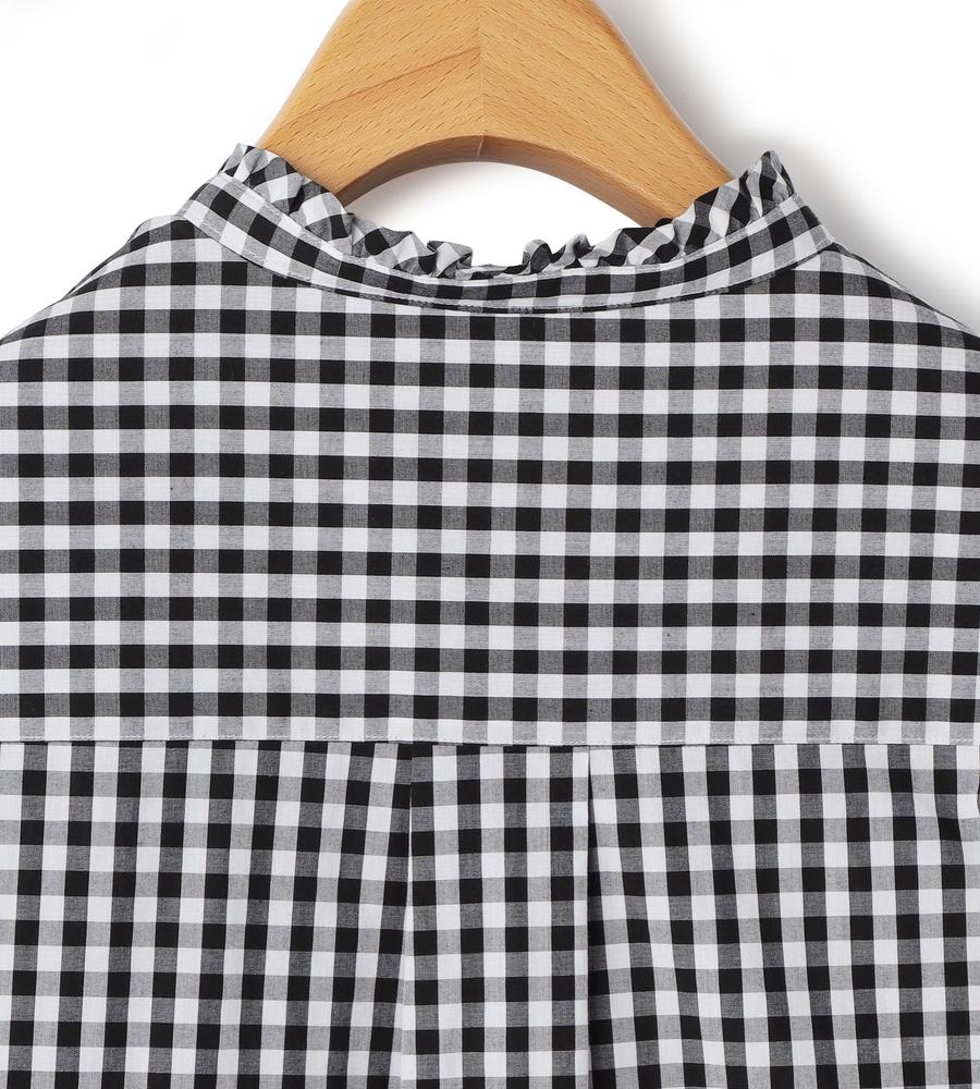 大人ガーリーな着こなしをかなえてくれるギンガムチェック柄のブラウスです。衿元にはフリルをあしらい顔まわりに華やかをプラス、ボタンも同柄のくるみボタンを使いディテールにもこだわりました。ほど良いハリ感のあるコットン100%素材で、1枚でもインナーとしても着まわししやすい7分袖です。