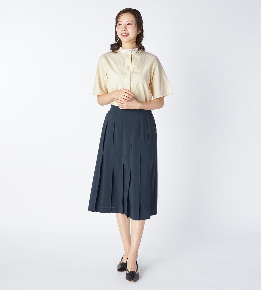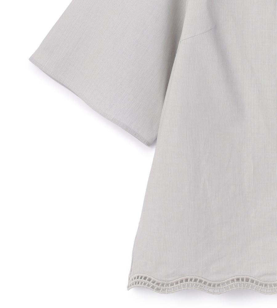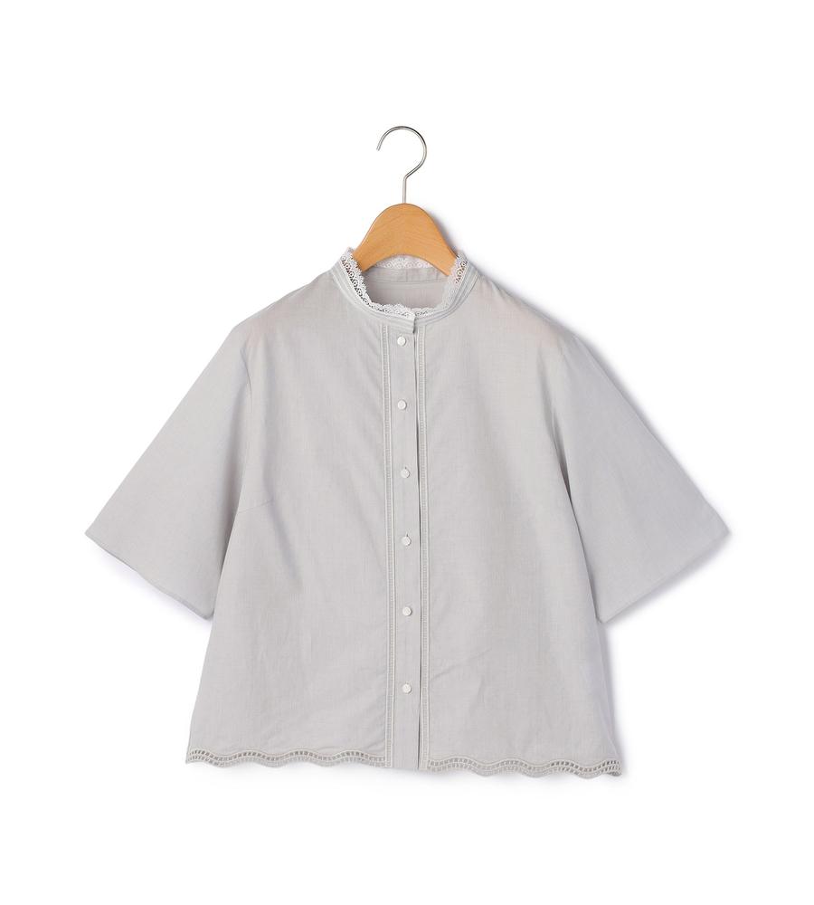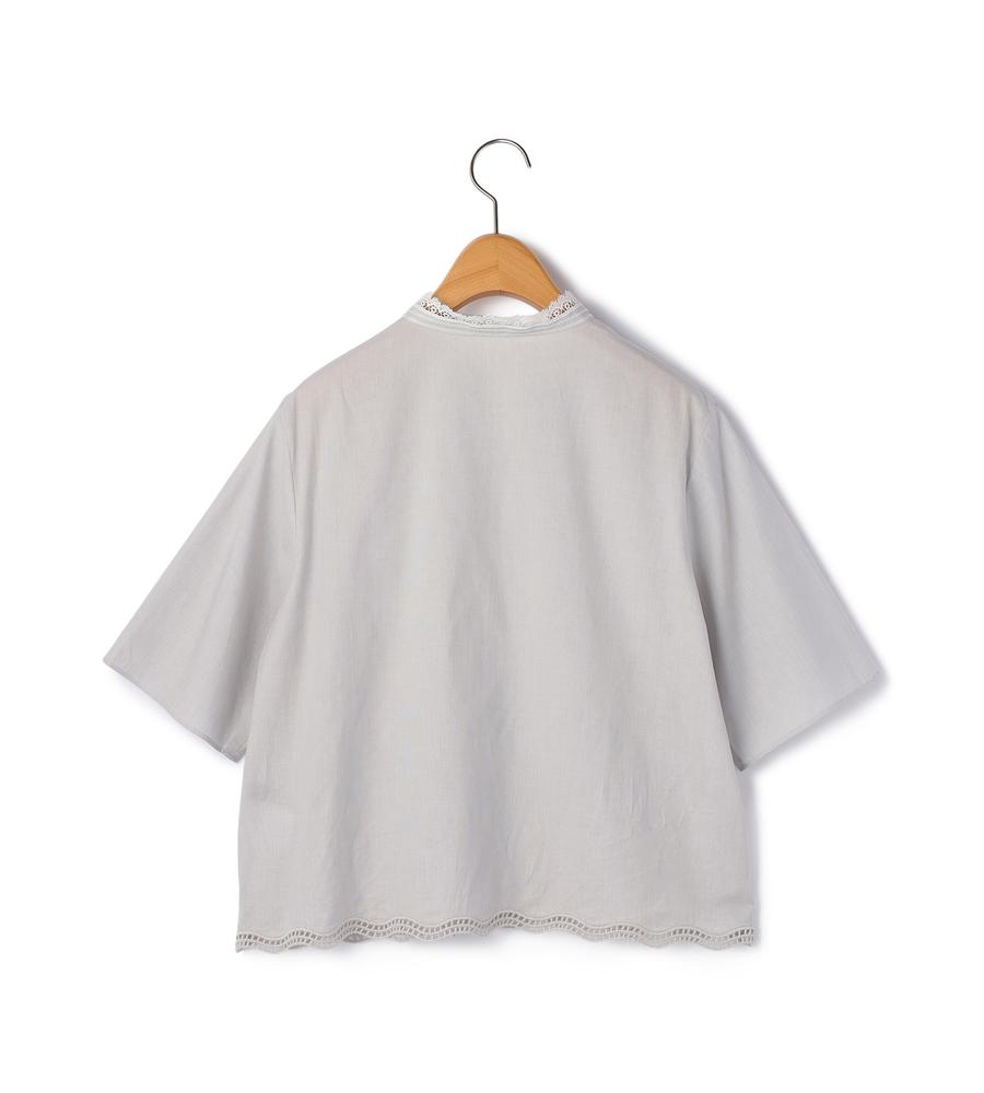 コットンベースのさらっとした素材を用いたシャツブラウス。特筆すべきは着丈の短さと、それとは相反するような量感の袖とのコントラスト。程よいリラックス感とモードな感性を備えた仕上がりになっています。ヘムラインはレースのようなカッティングを施し、存在感を高めているのもポイント。デニムなどを合わせてクリーンに楽しみたいアイテムです。