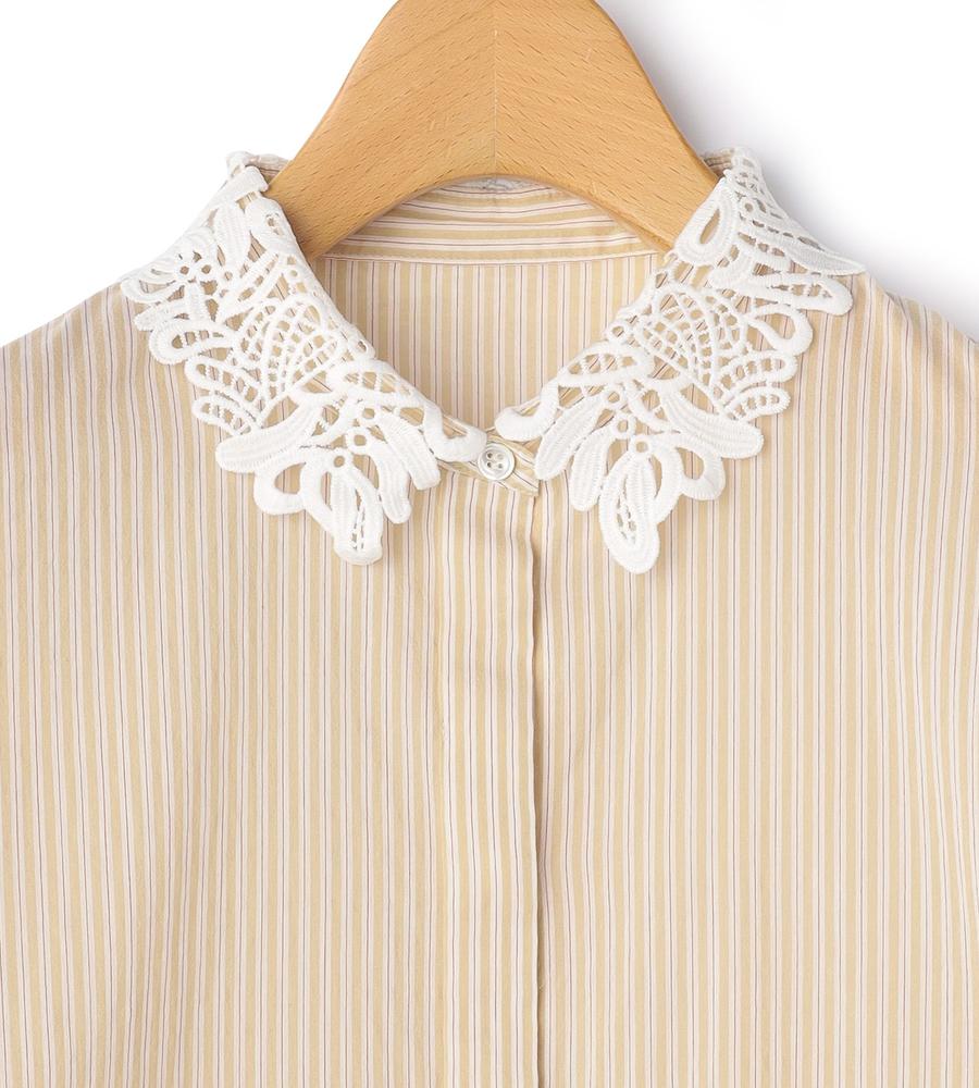 柔らかな雰囲気のストライプ柄ブラウス。ほんのり透け感のあるエアリーな生地感で、今らしさの漂う着こなしに。レース仕立ての衿が、モードな愛らしさを加えているのもポイントです。