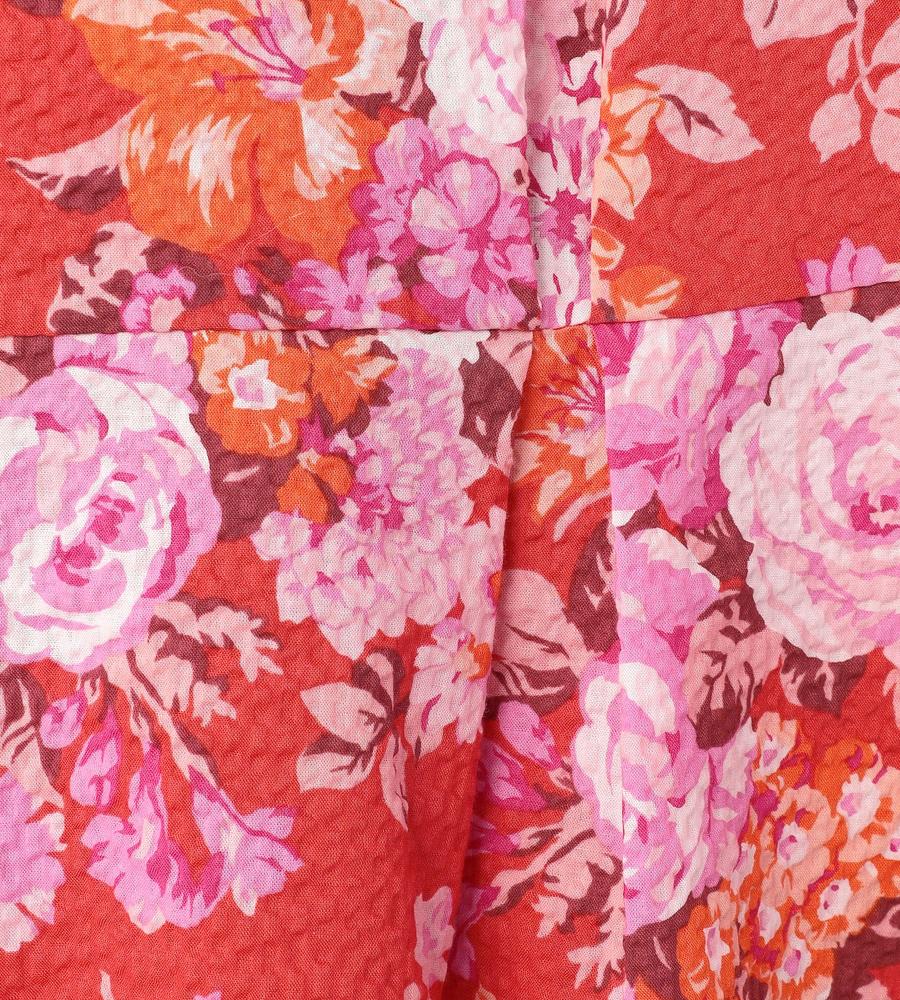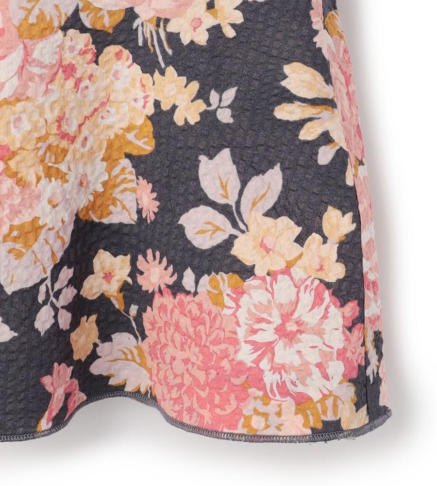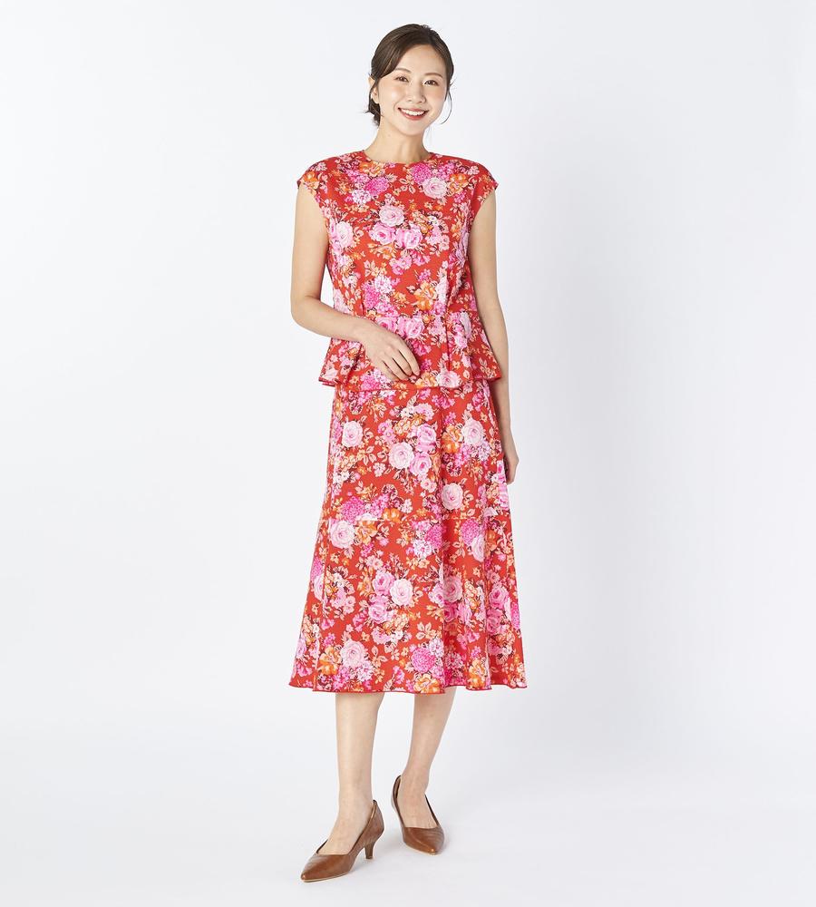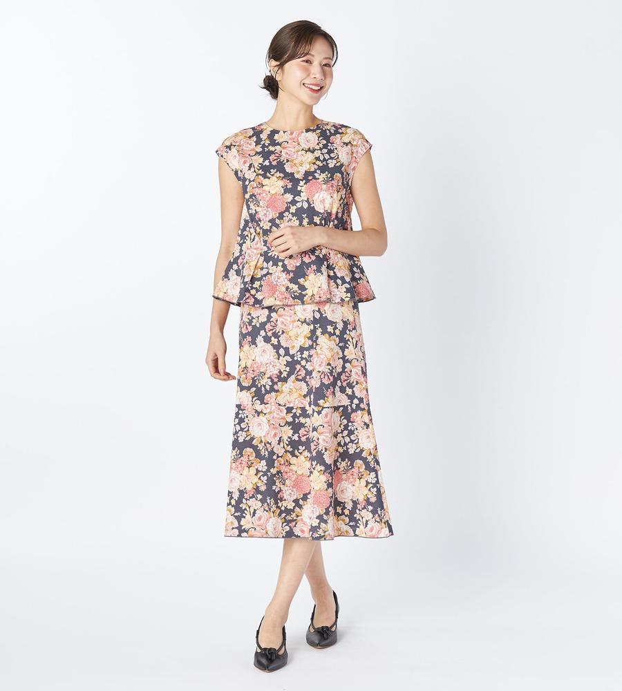 フローラルブーケの総柄プリントで仕上げた、遠目にも華やかなスカートです。これからの季節にぴったりなコットン100%素材で着心地も軽やか、裾にかけてふわりと広がるペプラム切り替えが女性らしさを引き立てます。同素材のスカートとセットアップでそろえるのもおすすめ、お呼ばれやリゾートにもぴったりです。