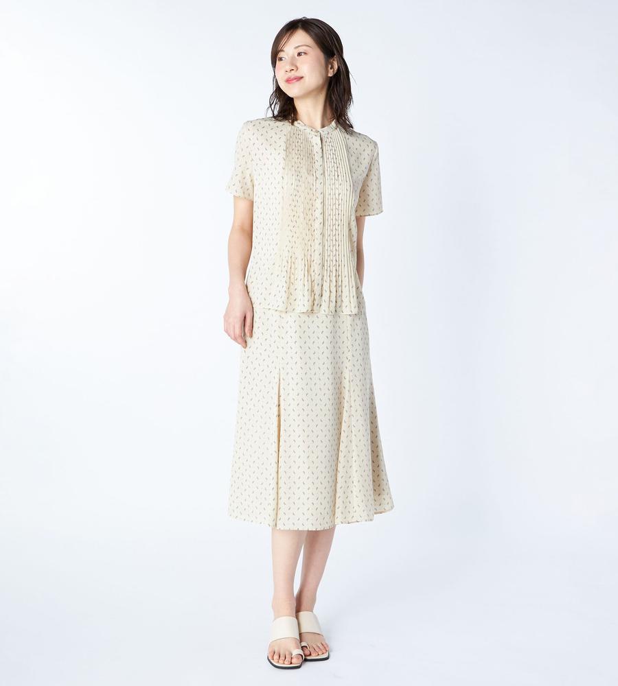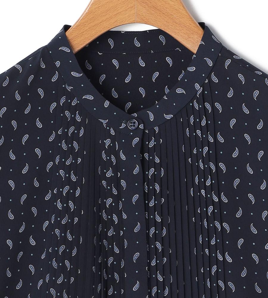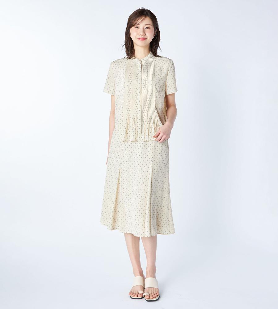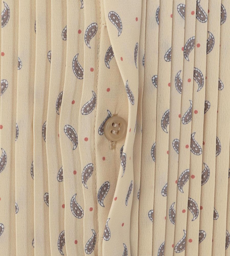 ペイズリー模様の総柄プリントで仕上げたミディ丈スカートです。小さめのドット柄をMIXすることで、毎日のコーデに着まわししやすいカジュアル感をプラスしました。顔まわりをすっきりと見せてくれるバンドカラーや上品なタックプリーツ使いも華やか、同素材のスカートとのセットアップもおすすめです。