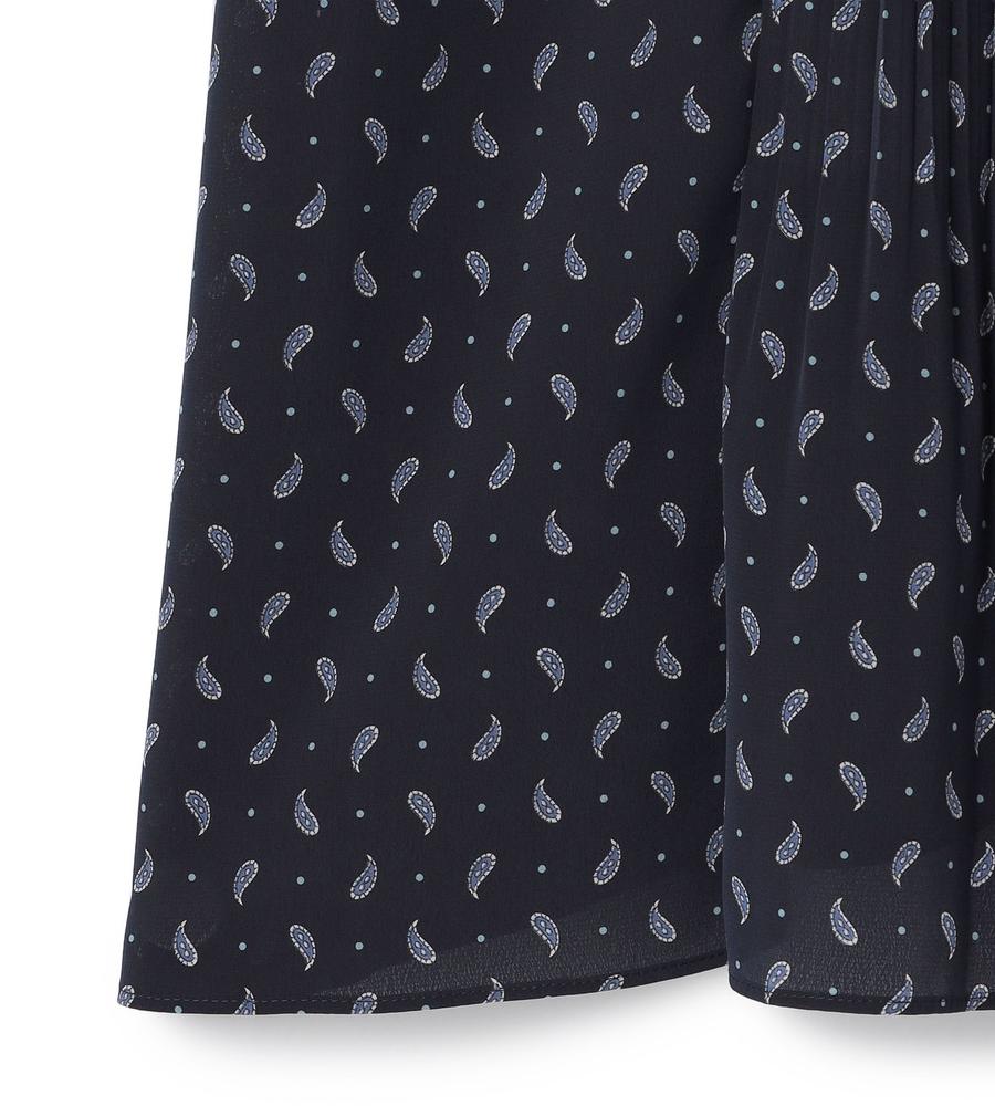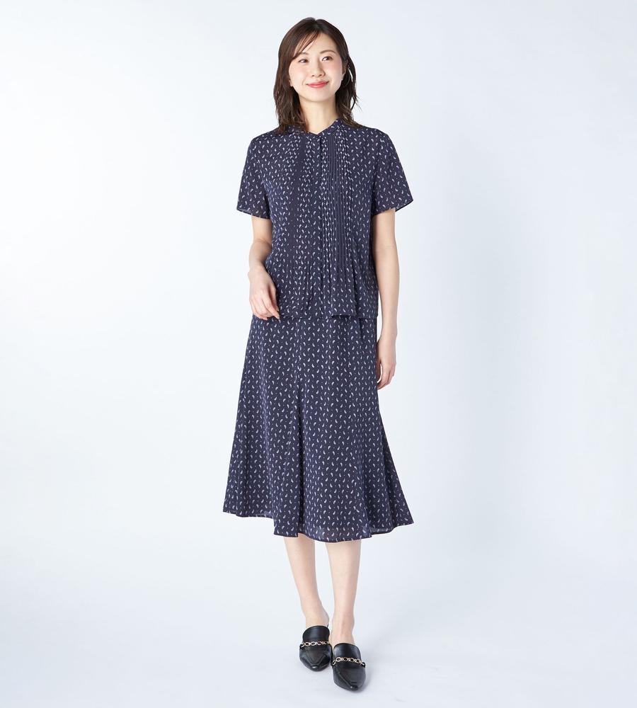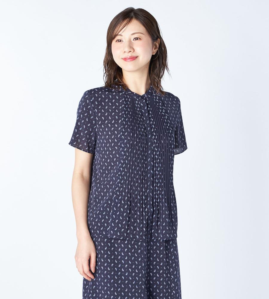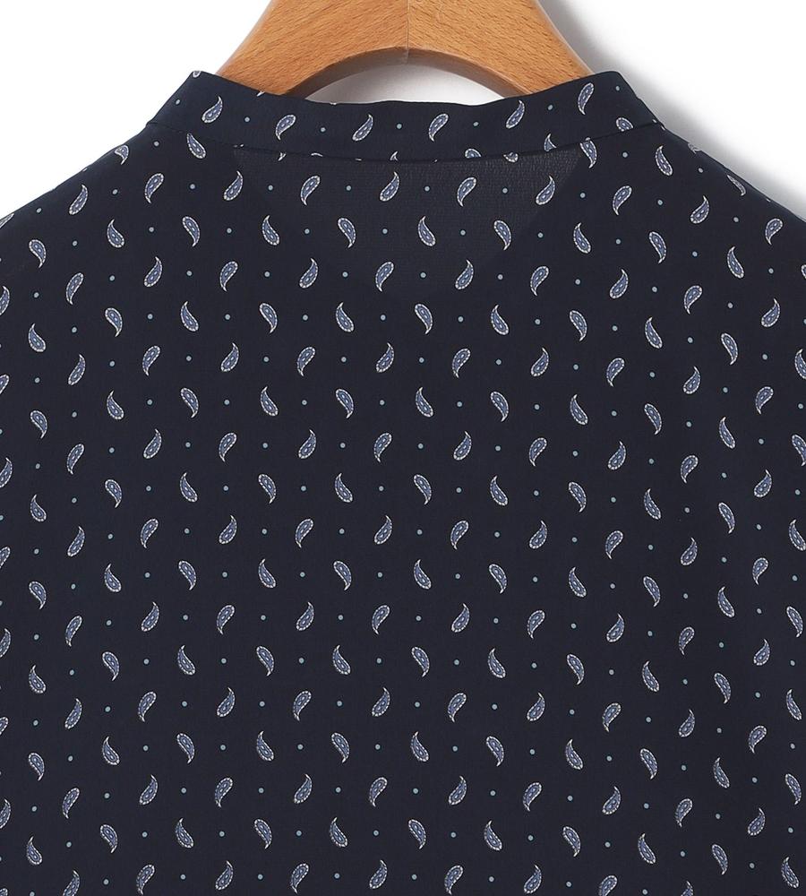 ペイズリー模様の総柄プリントで仕上げたミディ丈スカートです。小さめのドット柄をMIXすることで、毎日のコーデに着まわししやすいカジュアル感をプラスしました。顔まわりをすっきりと見せてくれるバンドカラーや上品なタックプリーツ使いも華やか、同素材のスカートとのセットアップもおすすめです。
