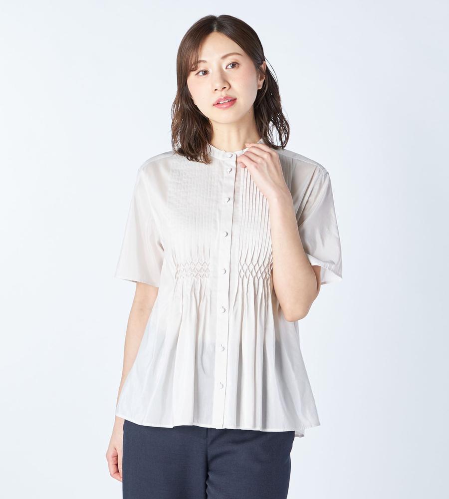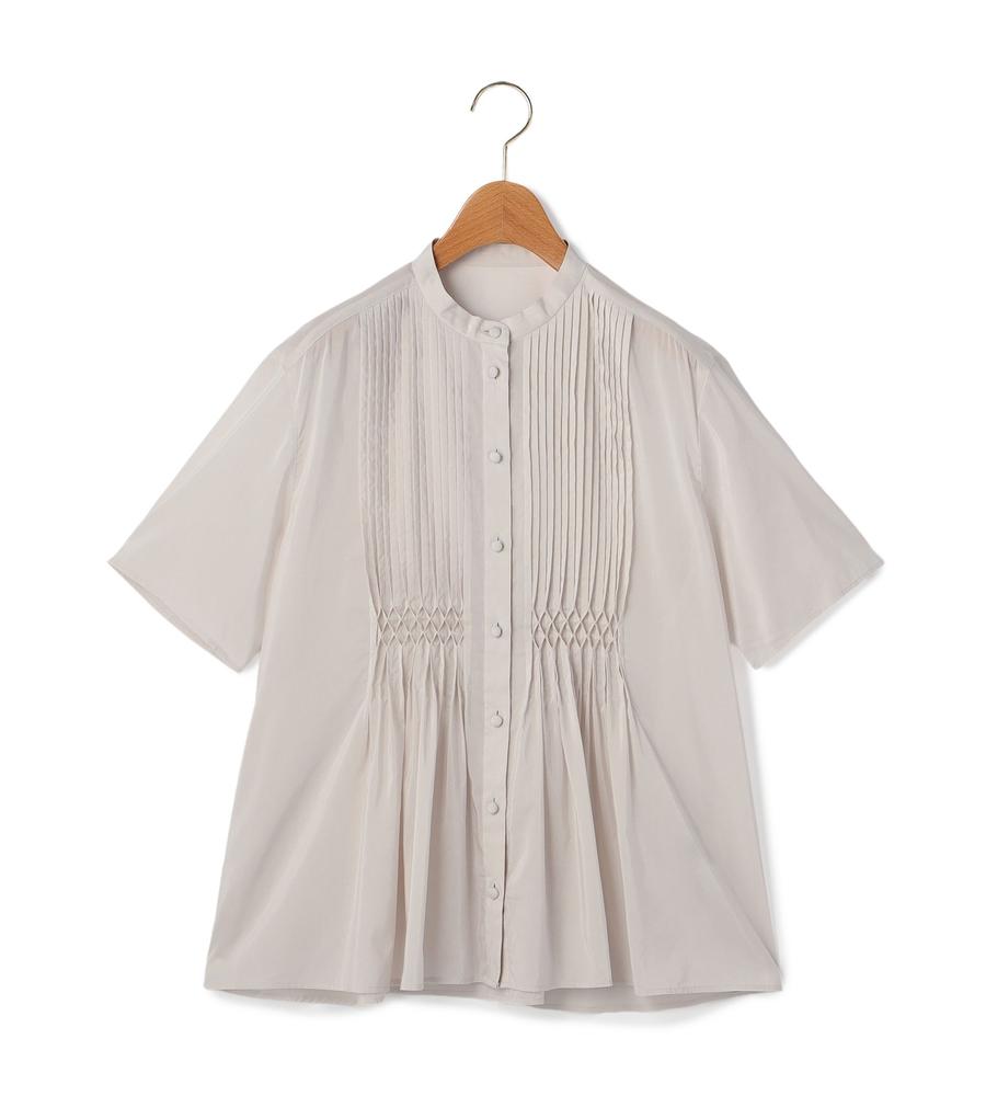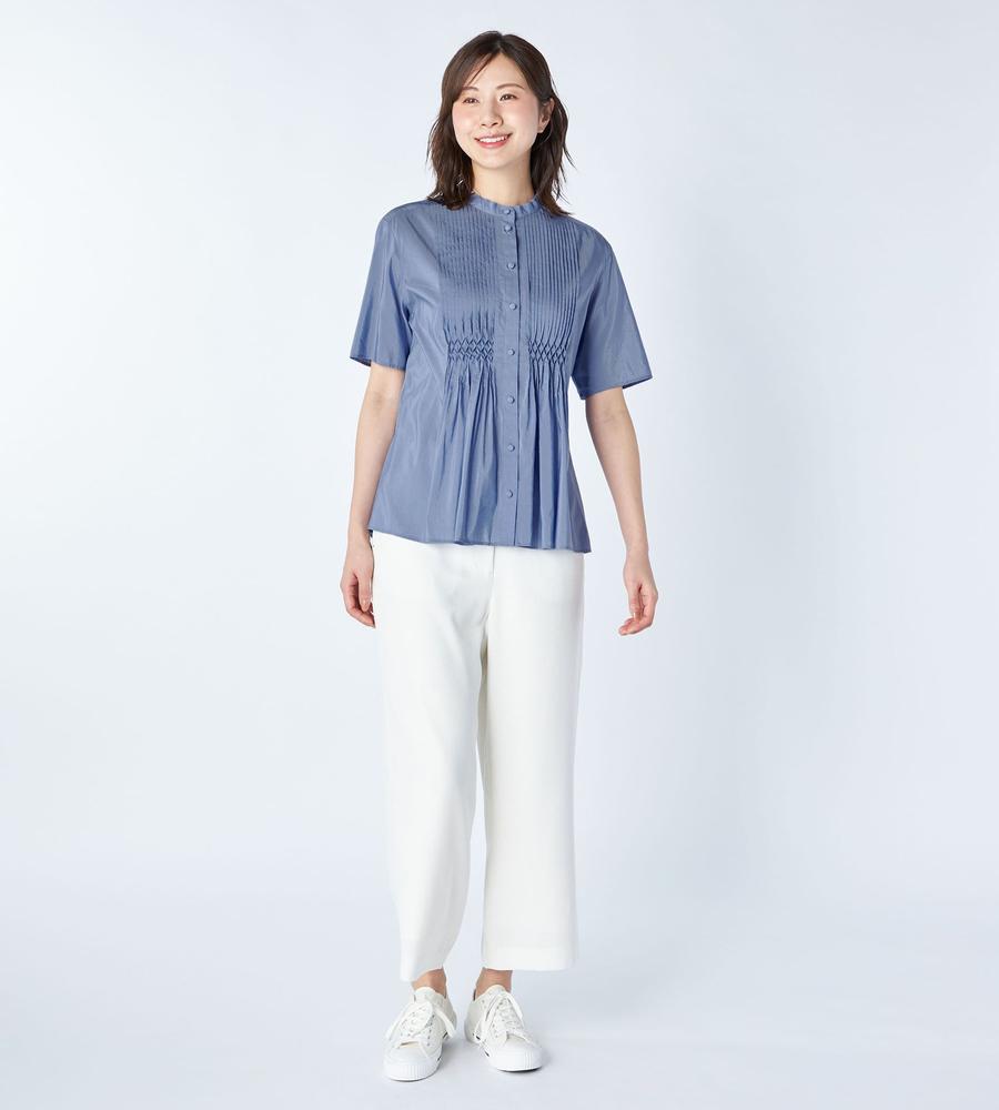 軽くて通気性にすぐれた着心地が魅力、これからの季節にぴったりなローン素材のシャツです。胸元に細やかによせたプリーツがフェミニン、切り替え部分からフレアに広げることでくびれコンシャスなシルエットを作りました。気になるお腹まわりをカバーできるのもうれしいポイント、色違いでも欲しくなるアイテムです。