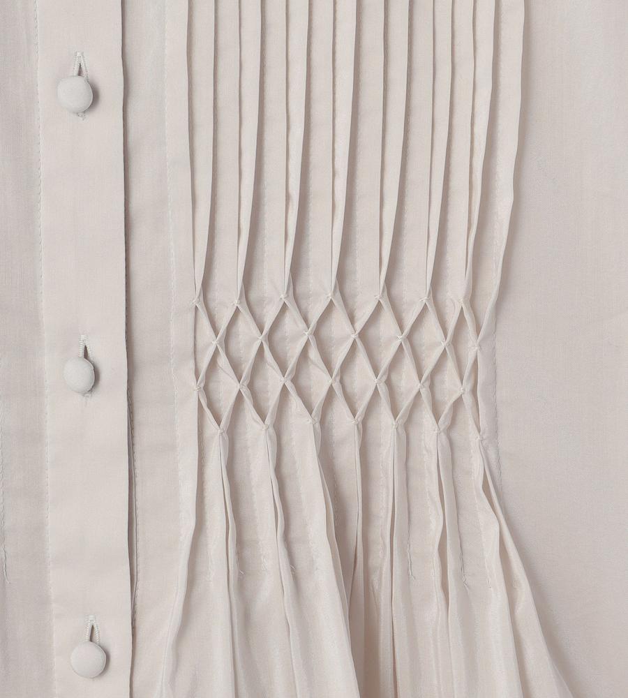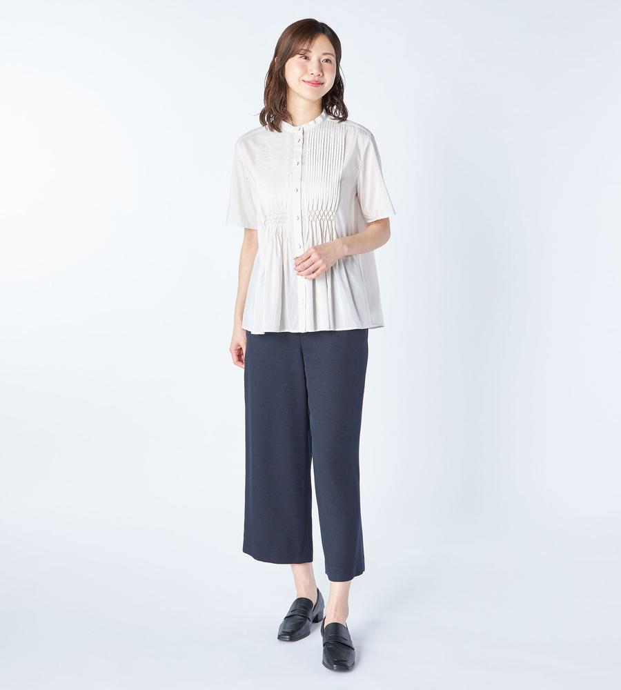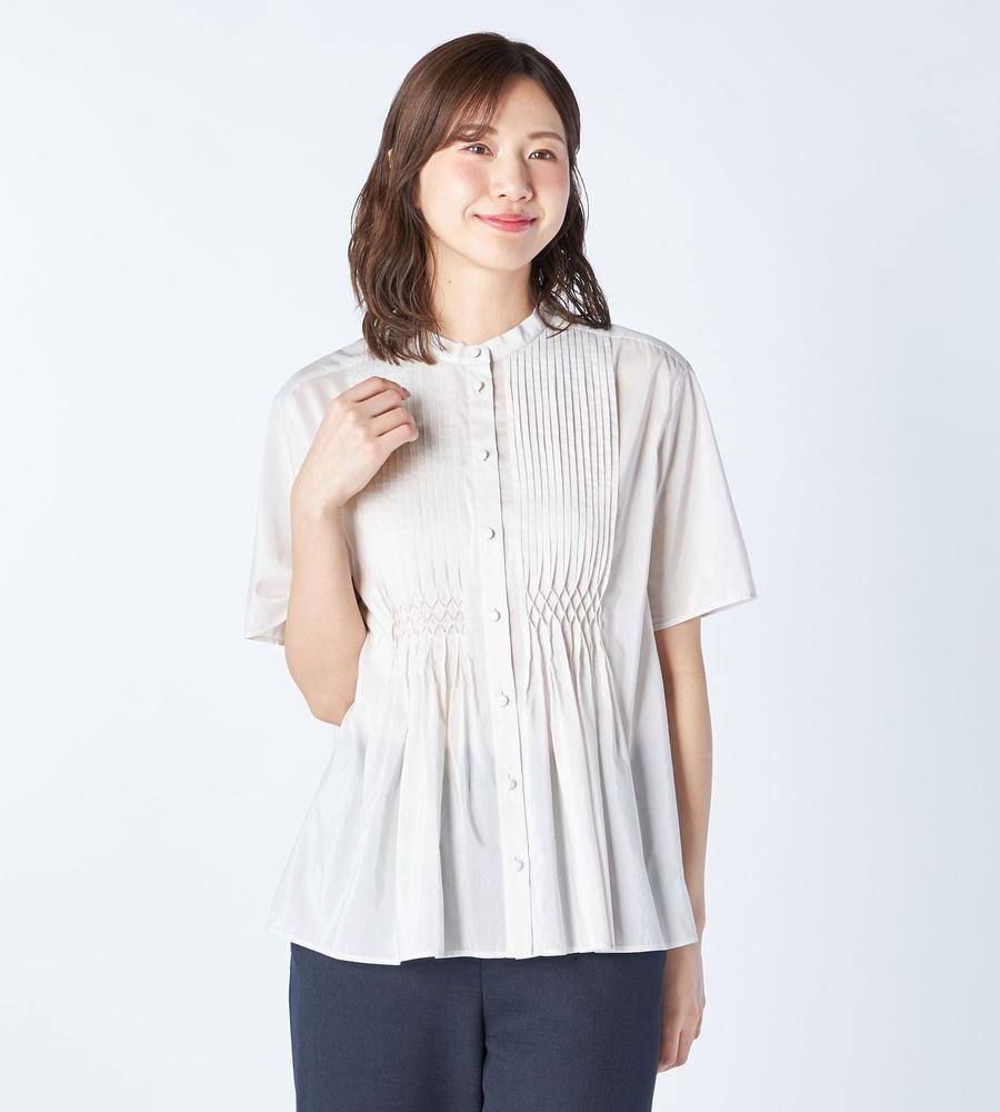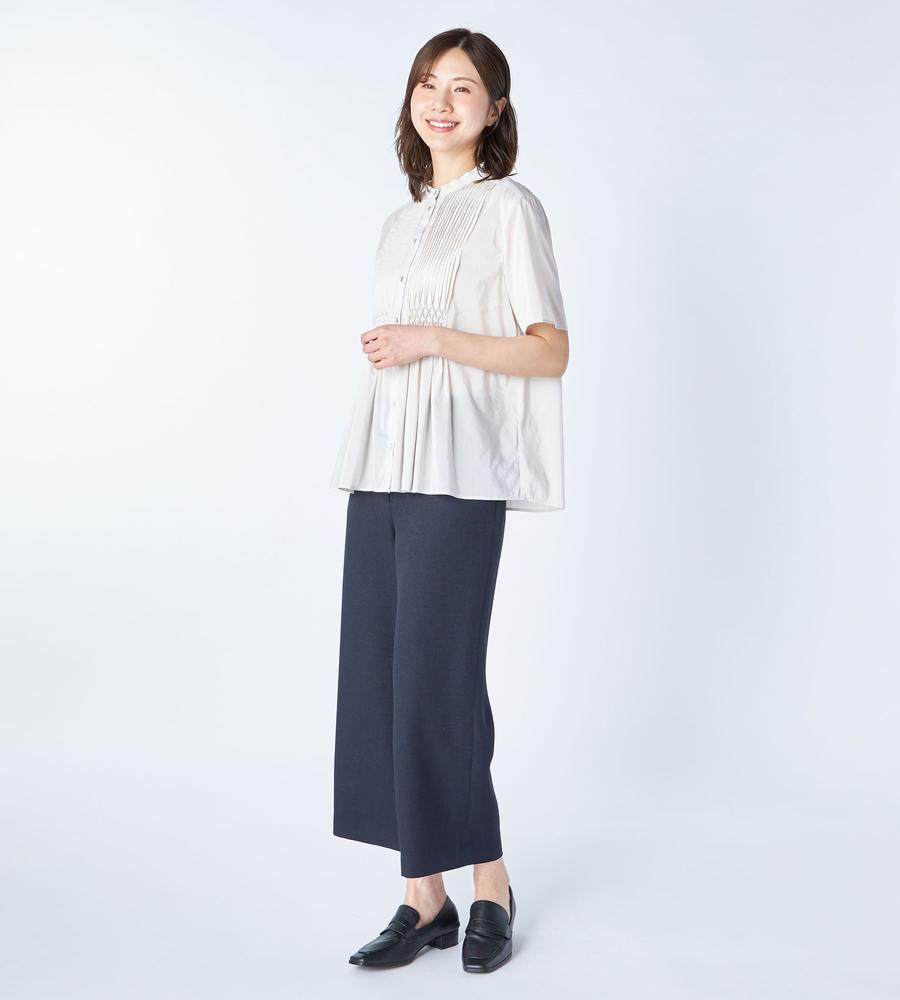 軽くて通気性にすぐれた着心地が魅力、これからの季節にぴったりなローン素材のシャツです。胸元に細やかによせたプリーツがフェミニン、切り替え部分からフレアに広げることでくびれコンシャスなシルエットを作りました。気になるお腹まわりをカバーできるのもうれしいポイント、色違いでも欲しくなるアイテムです。