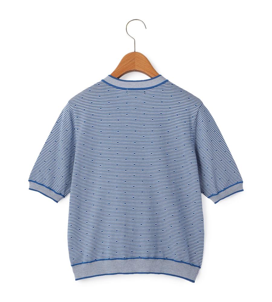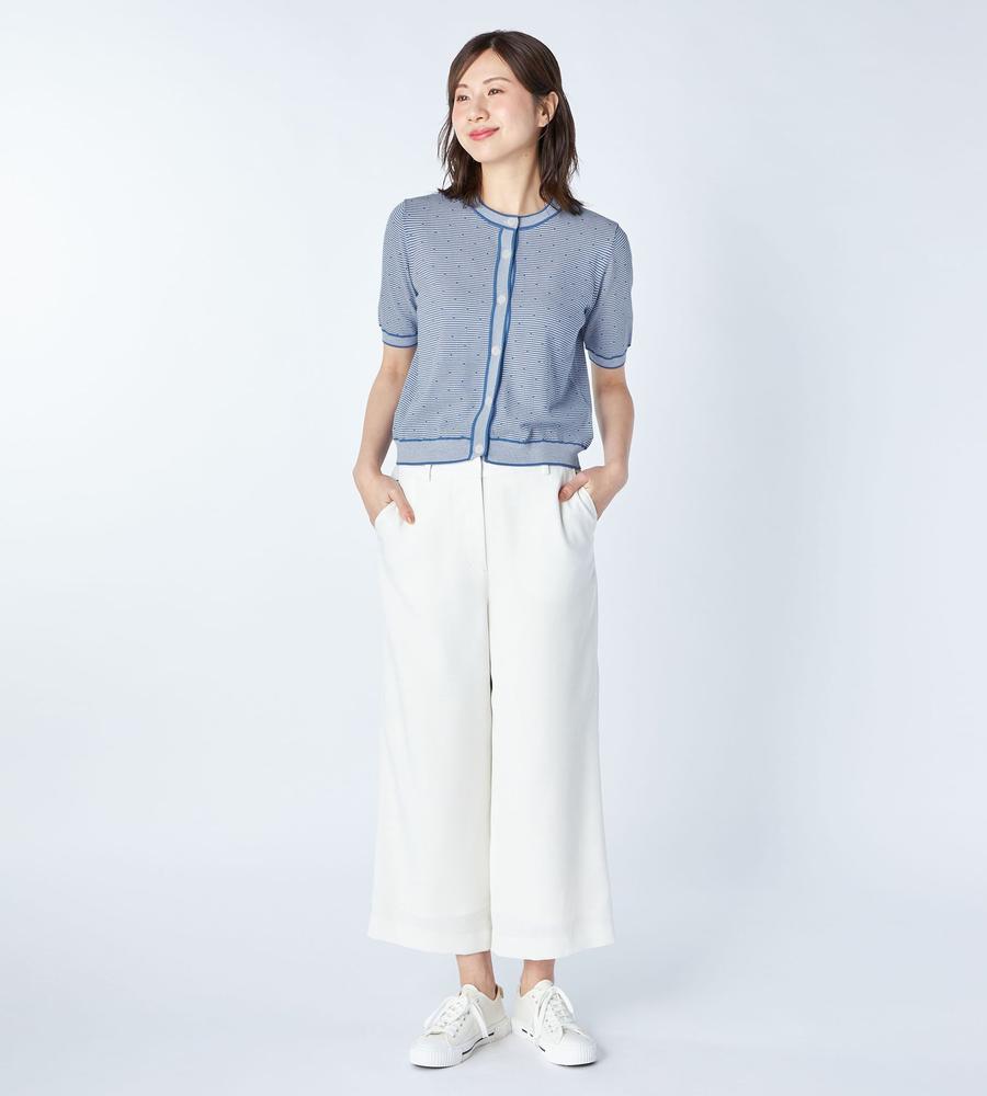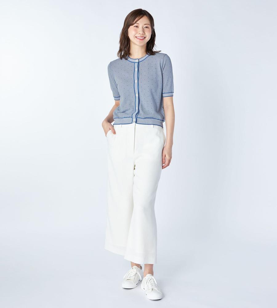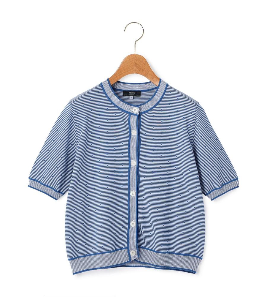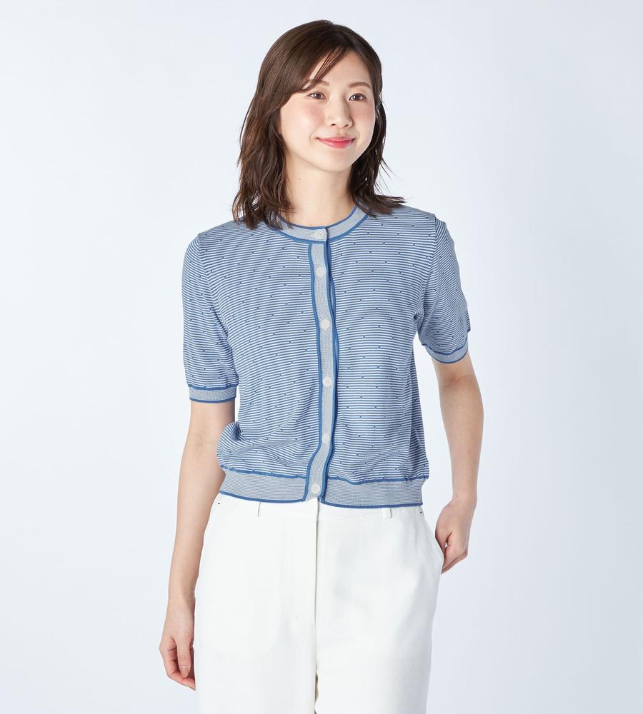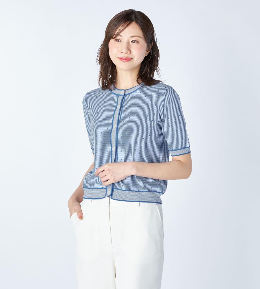 大人が着たいフレンチマリンな着こなしがかなうボーダー柄の半袖ニットです。衿元や裾の配色切り替えがアイテム全体にメリハリ感をプラス、ドットをあわせることで遊び心をきかせました。羽織りとしても使いやすいフルボタン仕様、ジャストウエストな着丈でワンピースやハイウエストボトムスとも好相性です。