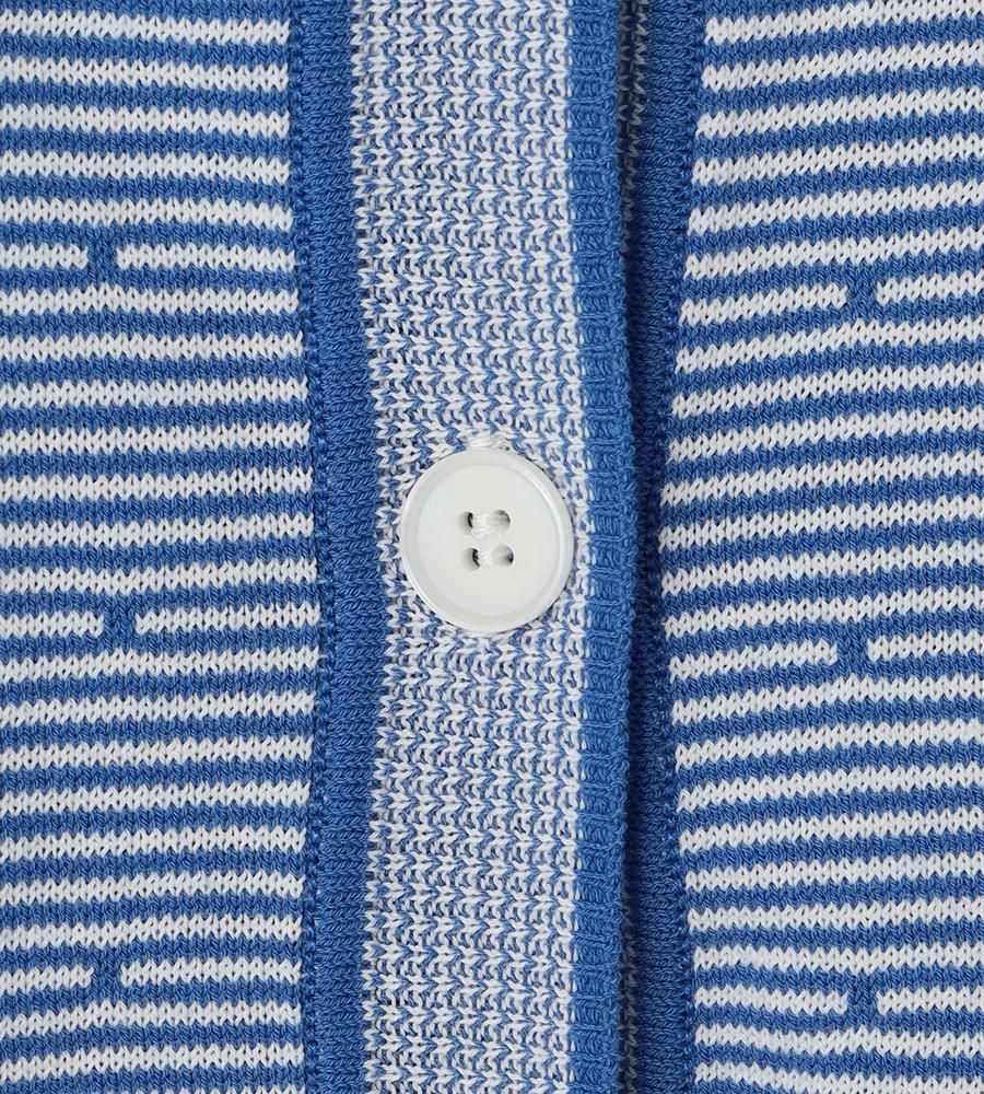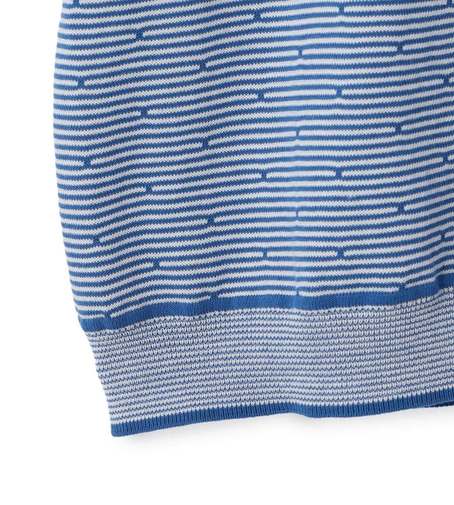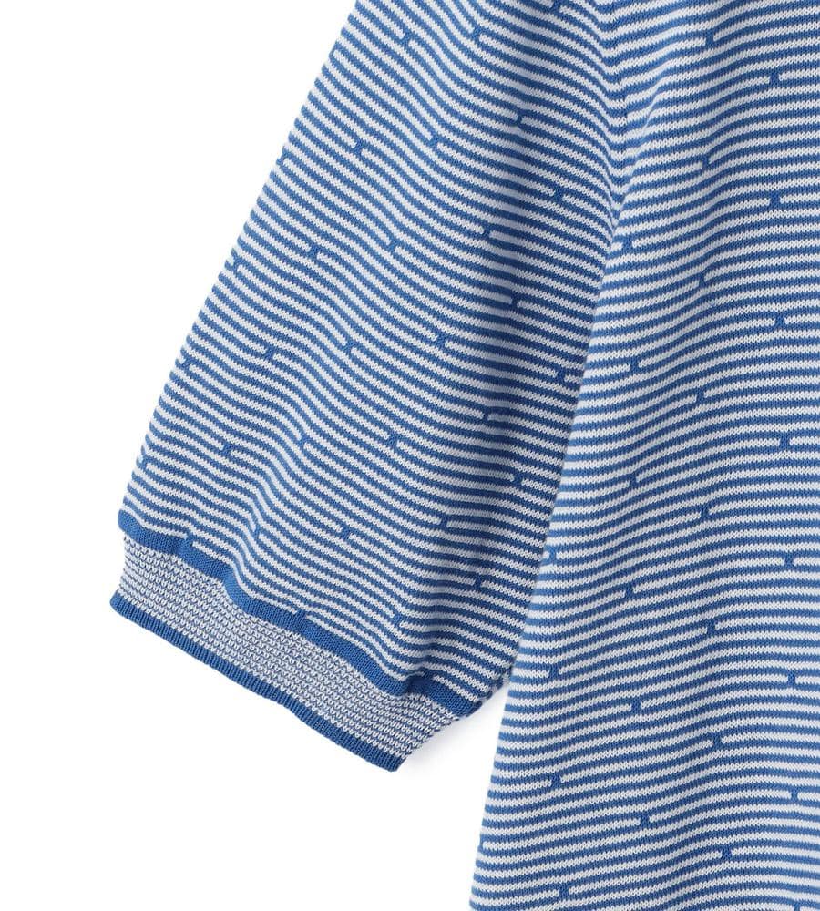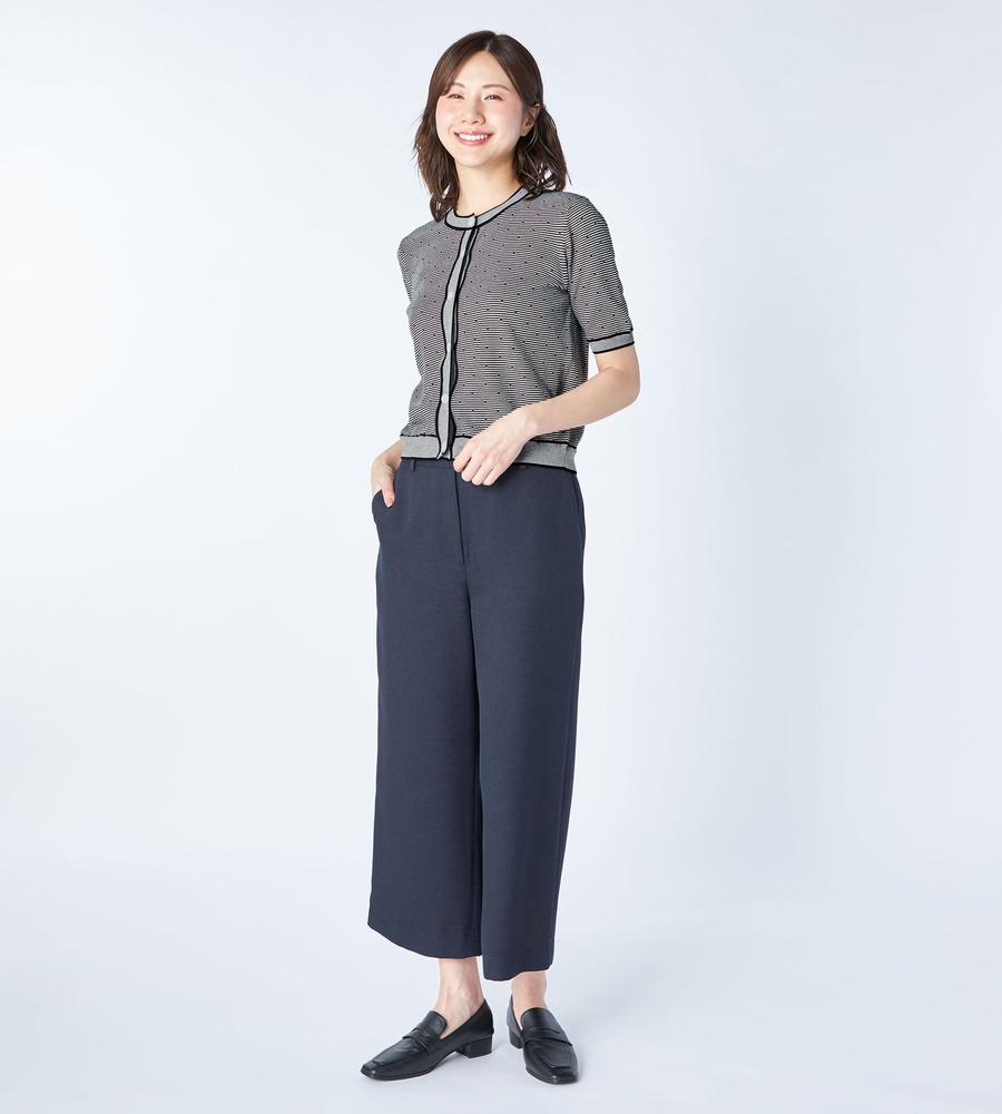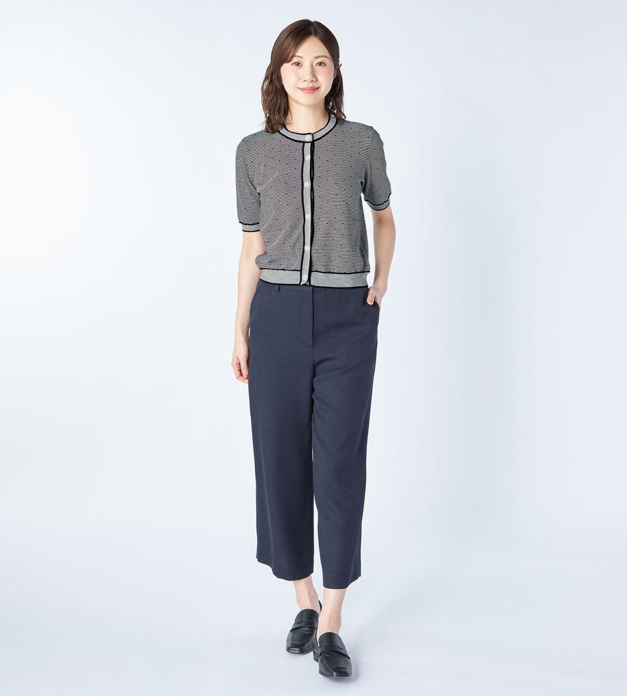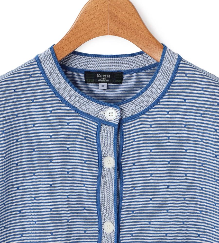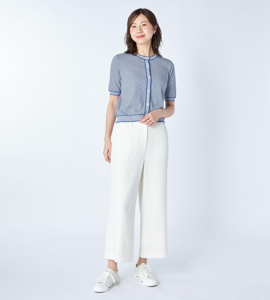 大人が着たいフレンチマリンな着こなしがかなうボーダー柄の半袖ニットです。衿元や裾の配色切り替えがアイテム全体にメリハリ感をプラス、ドットをあわせることで遊び心をきかせました。羽織りとしても使いやすいフルボタン仕様、ジャストウエストな着丈でワンピースやハイウエストボトムスとも好相性です。