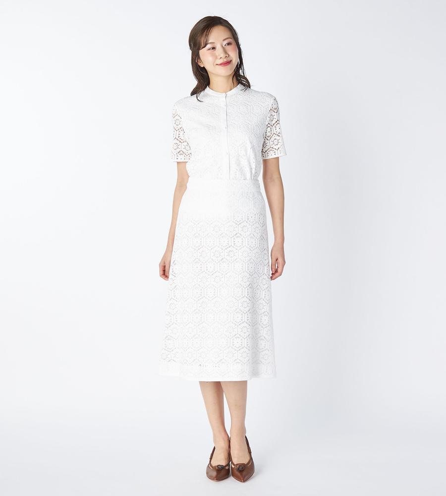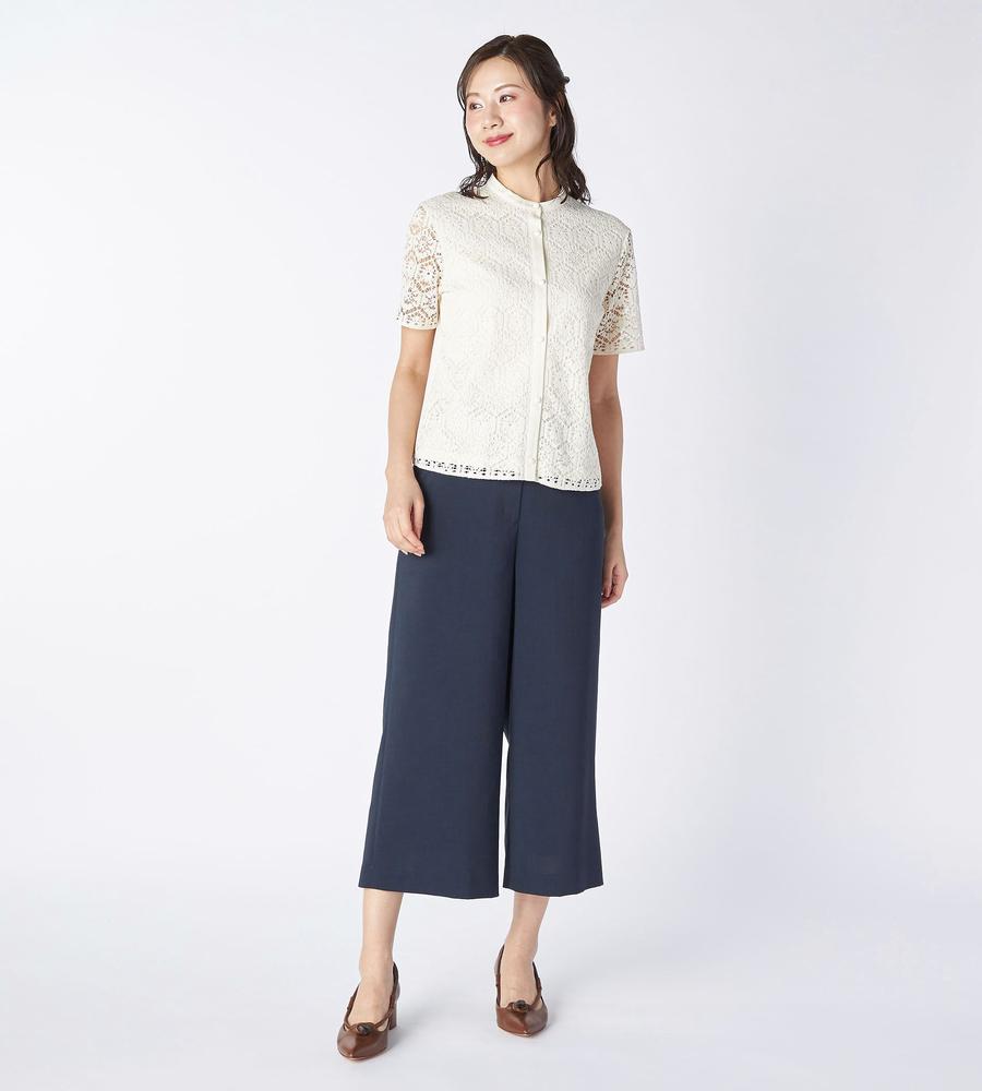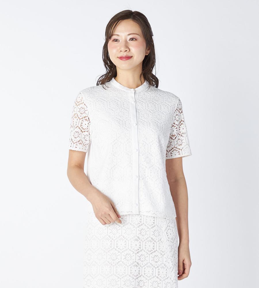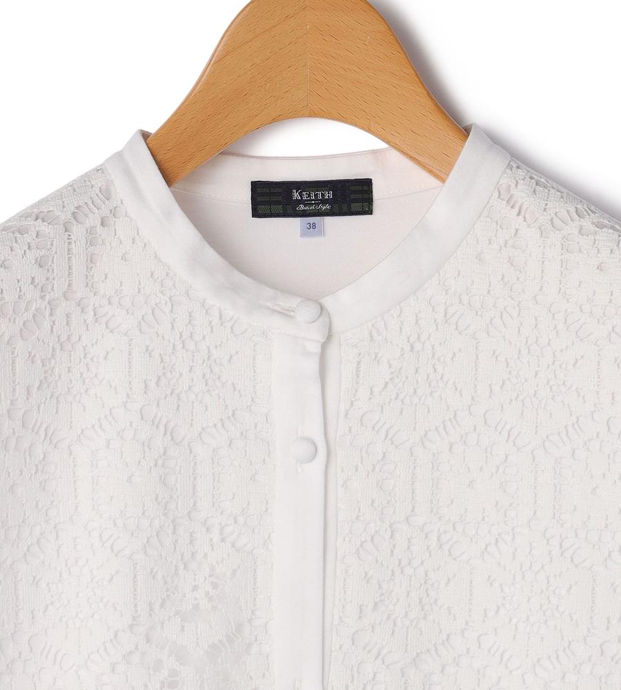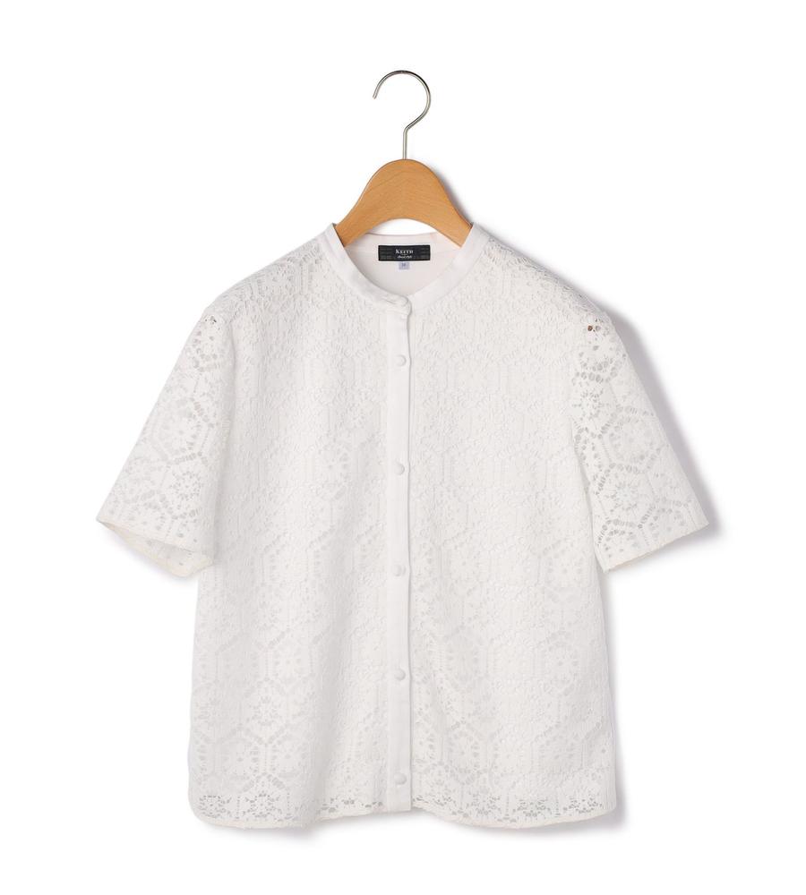 幾何学模様をベースにしながらも、レースならではの表情で優雅な印象に仕上げたカットソー。甘さがある素材をシャツ仕立てにすることで、品の良い表情になっています。バンドカラー仕立てのため、首まわりにスカーフやショールなどを合わせるアレンジも楽しめます。背面はカットソー地で切り替えており、上着などを羽織りやすいのもポイントです。