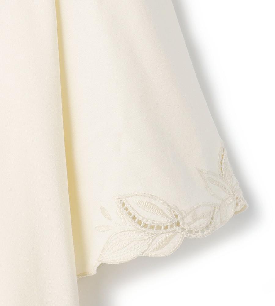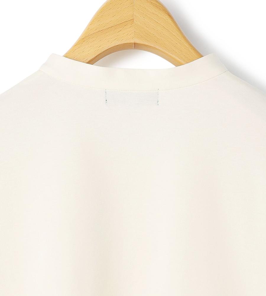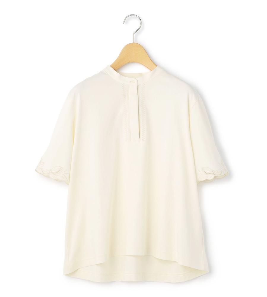 なめらかで優しい肌ざわりが心地よい、コットンスムース素材で仕上げたプルオーバーカットソーです。袖と前立ての両サイドに刺繍をあしらいフェミニンに飾りつけしました。顔まわりをすっきりと見せてくれるバンドカラーもポイント、Tシャツ感覚でラフに着られてきちんときれいめにもあわせられるアイテムです。
